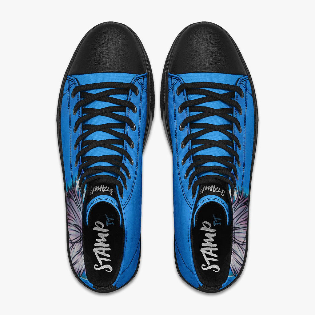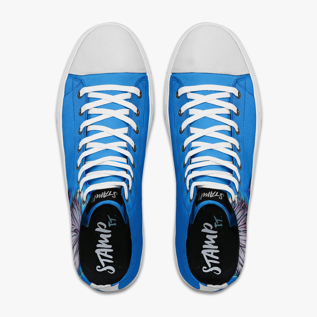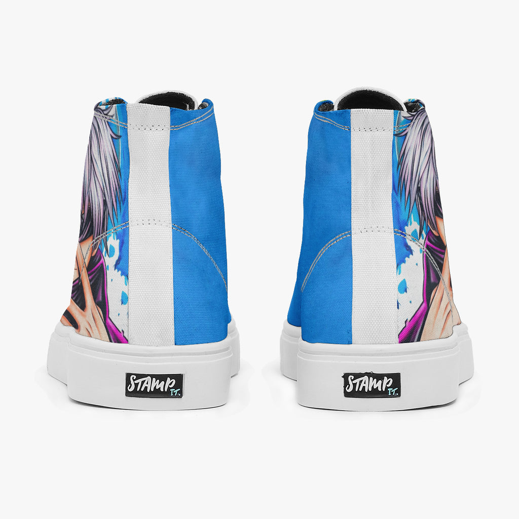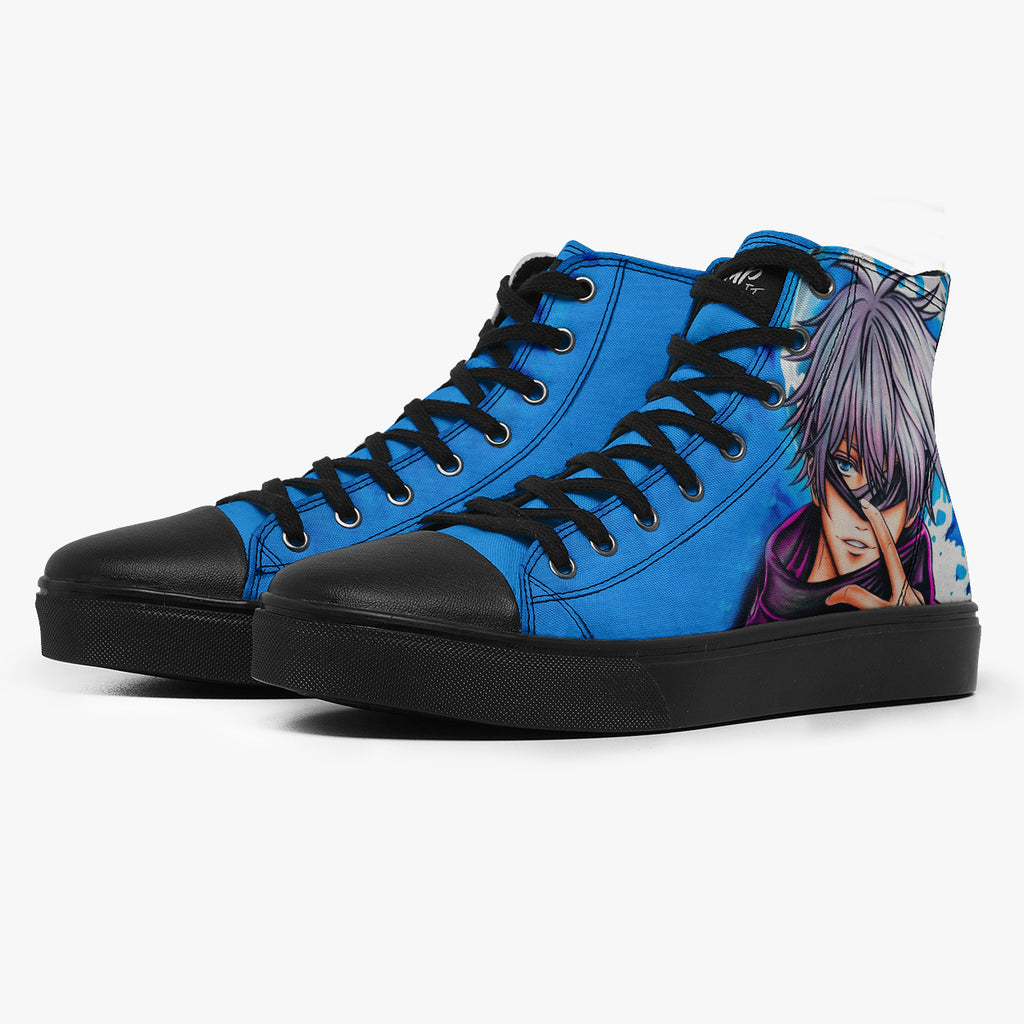 Tênis Cano Alto Azul Jujutsu Kaisen Gojo Satoru Johnsaniarts, confeccionado em lona, com cores e estampas exclusivas.