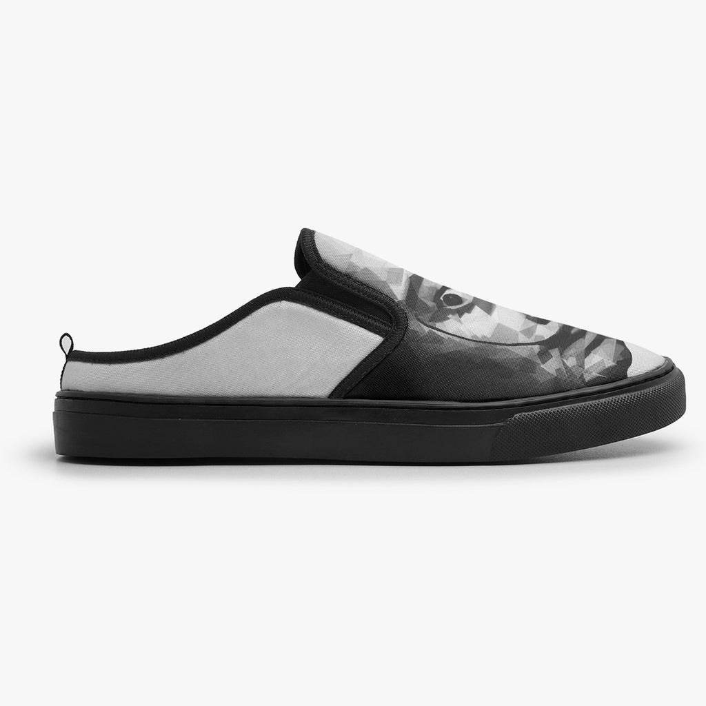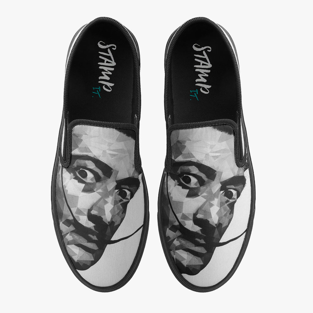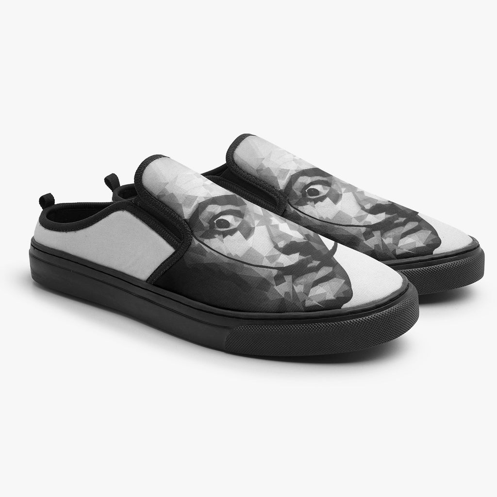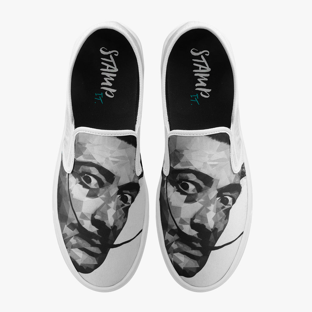 Tênis Mule Branco Salvador Dalí Retrato Cultura e Arte, confeccionado em lona, com cores e estampas exclusivas.