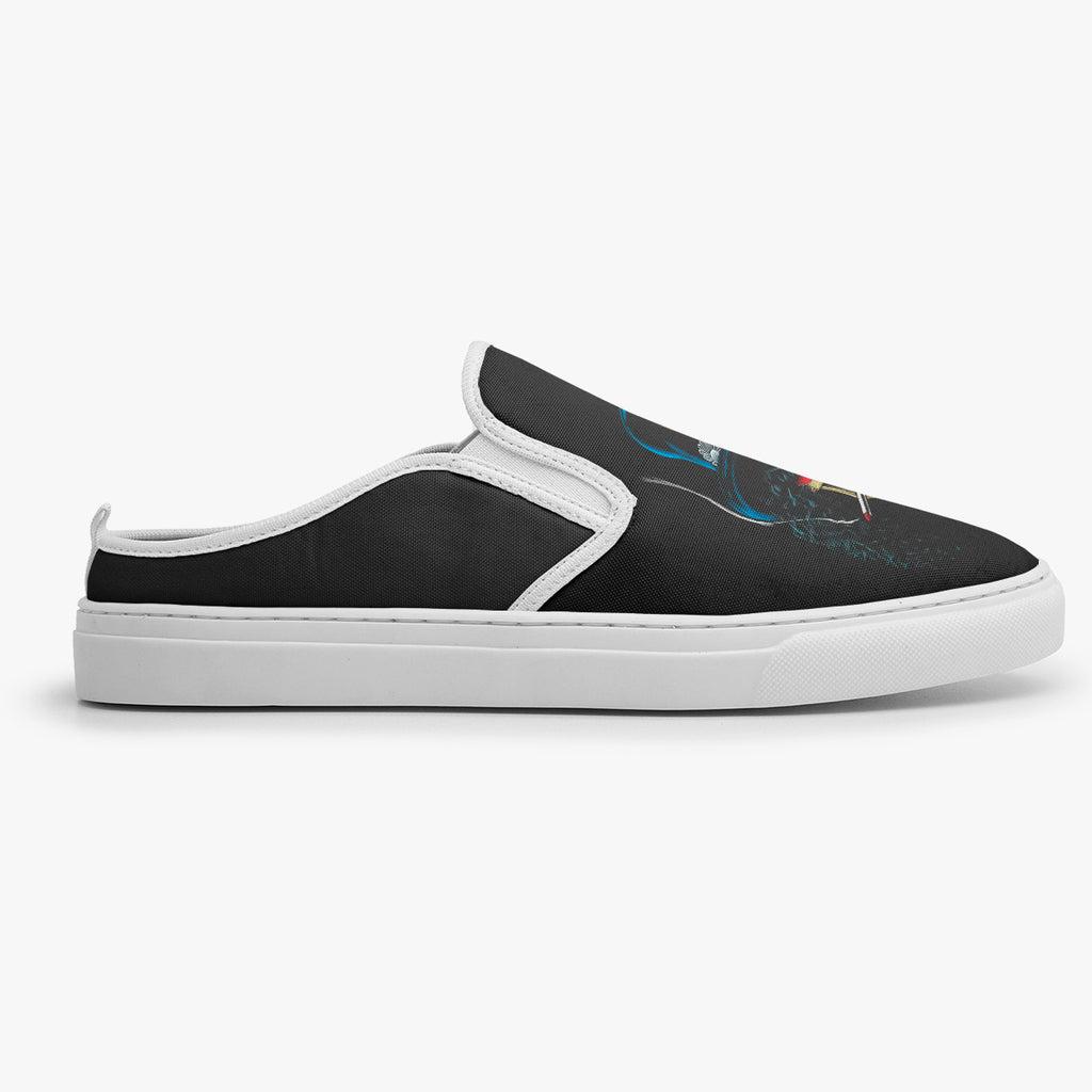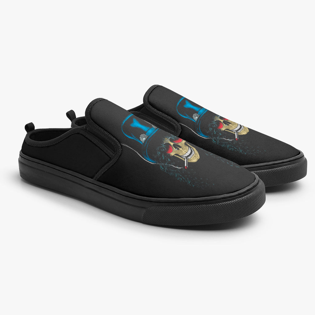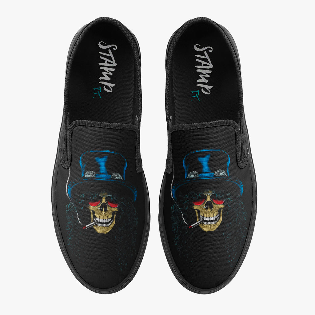 Tênis Mule Preto Guns N' Roses Caveira Slash Bandas de Rock, confeccionado em lona, com cores e estampas exclusivas.