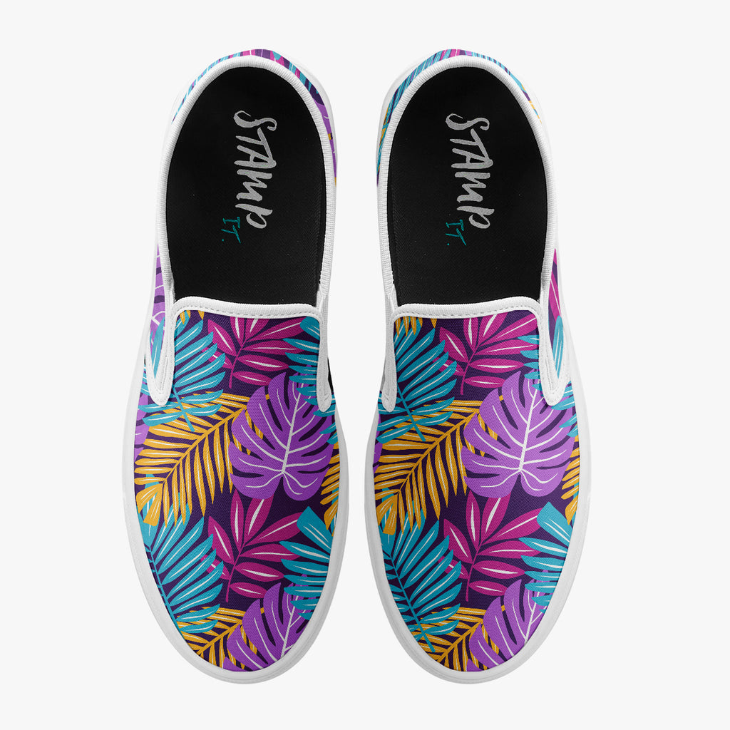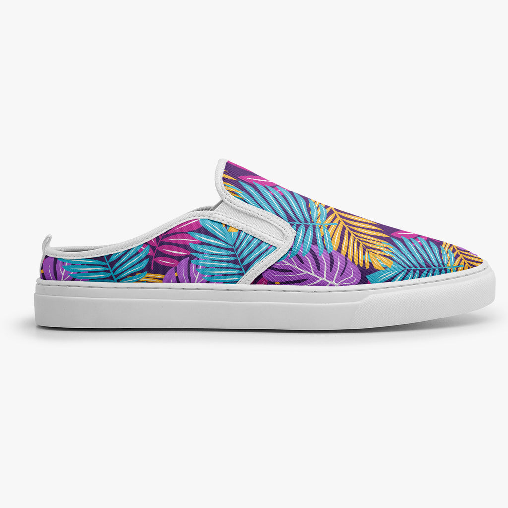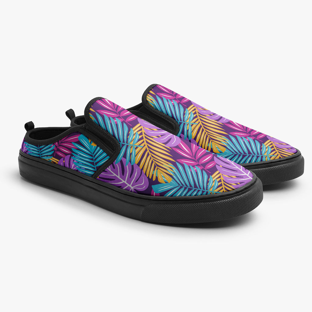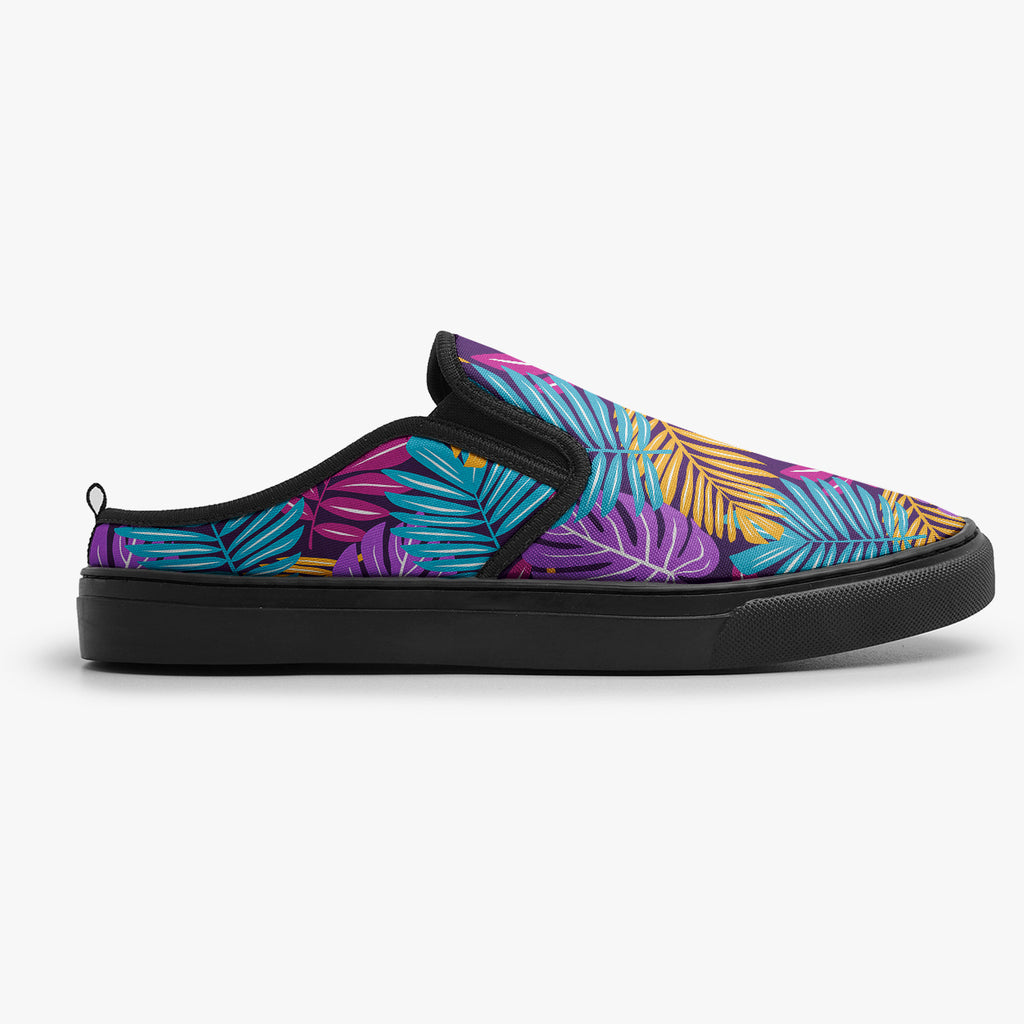 Tênis Mule Roxo Varias Folhas Coloridas Flores e Folhas, confeccionado em lona, com cores e estampas exclusivas.