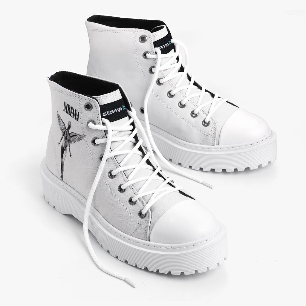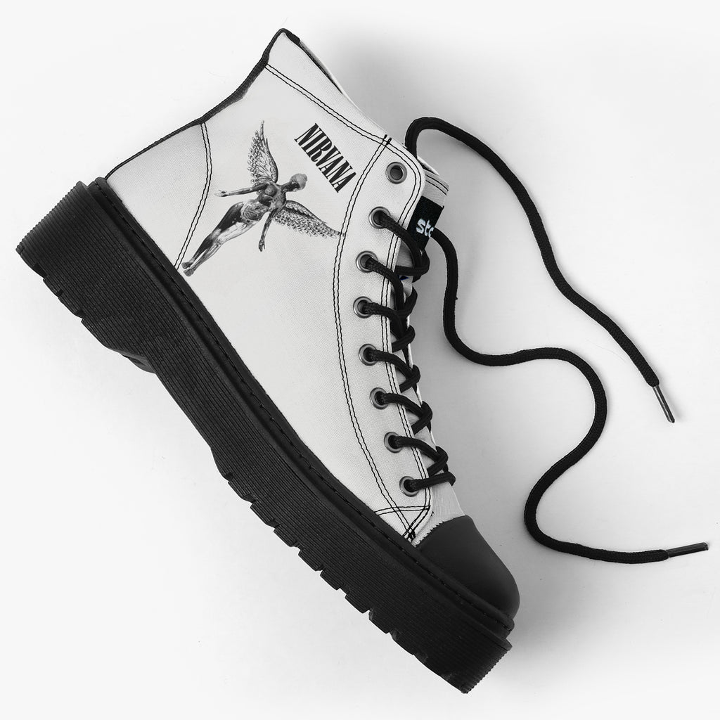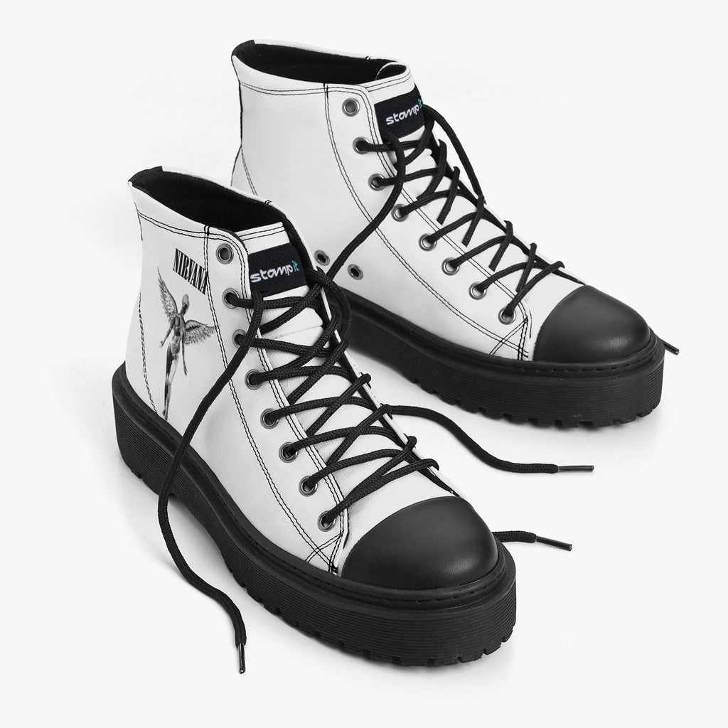 Tênis Cano Alto Plataforma Cinza Nirvana Grunge In Utero Bandas de Rock, confeccionado em lona, com cores e estampas exclusivas.