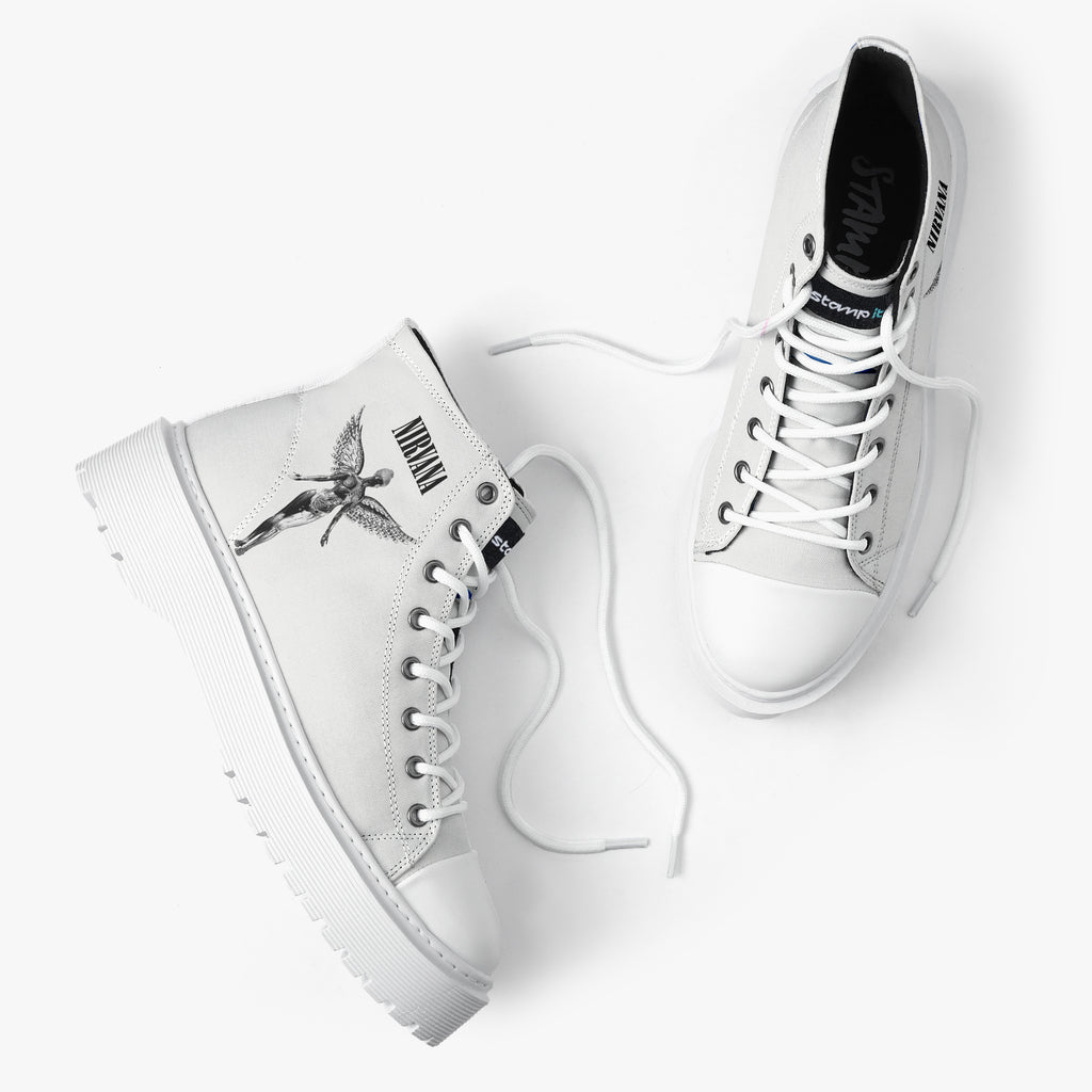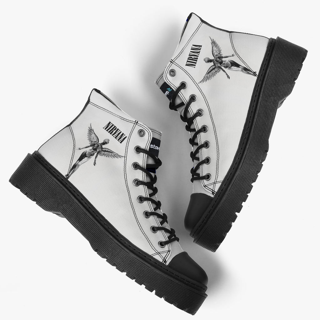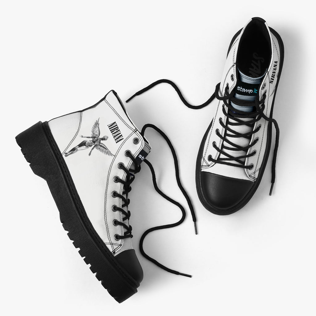 Tênis Cano Alto Plataforma Cinza Nirvana Grunge In Utero Bandas de Rock, confeccionado em lona, com cores e estampas exclusivas.