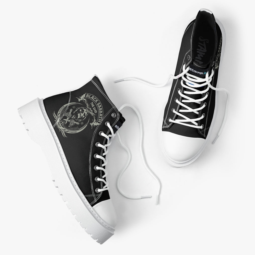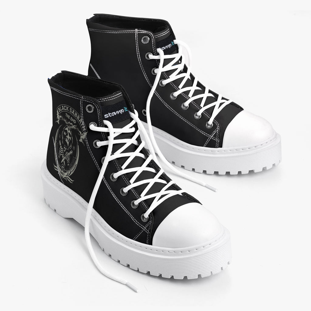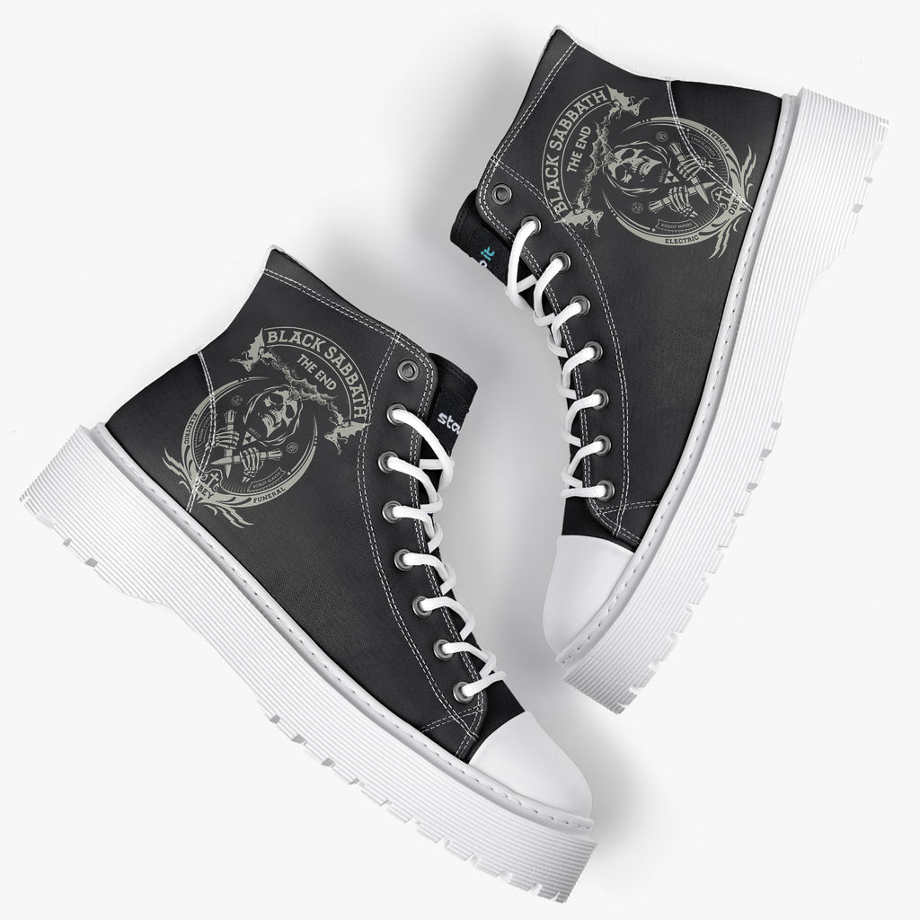 Tênis Cano Alto Plataforma Preto Black Sabbath The End Heavy Metal Bandas de Rock, confeccionado em lona, com cores e estampas exclusivas.