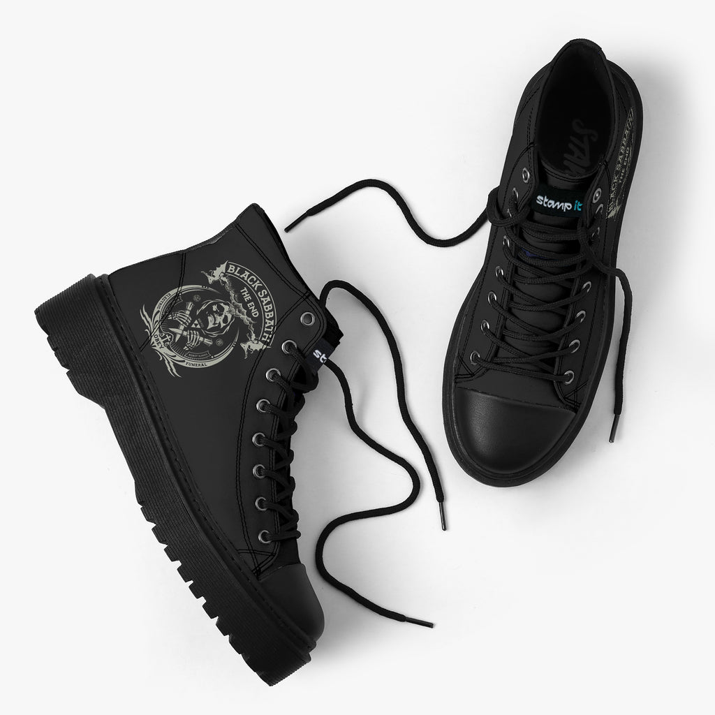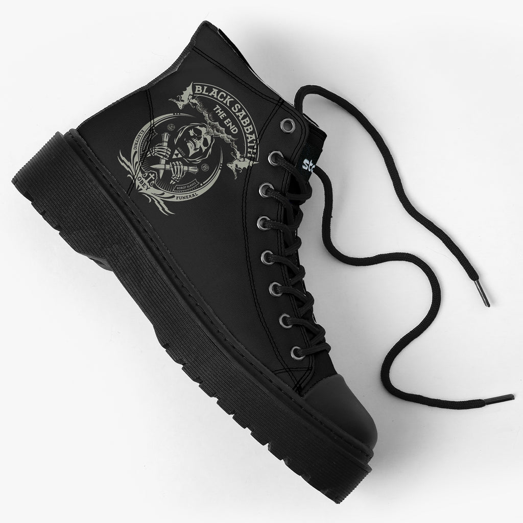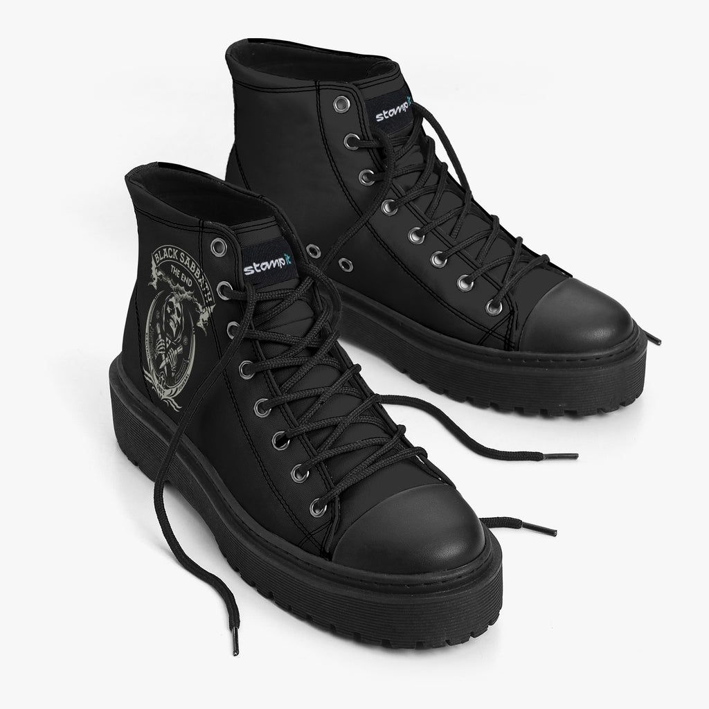 Tênis Cano Alto Plataforma Preto Black Sabbath The End Heavy Metal Bandas de Rock, confeccionado em lona, com cores e estampas exclusivas.