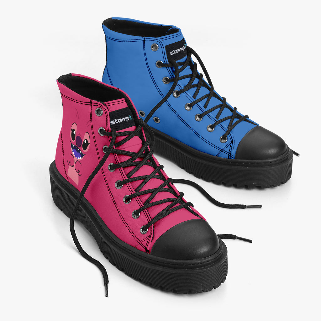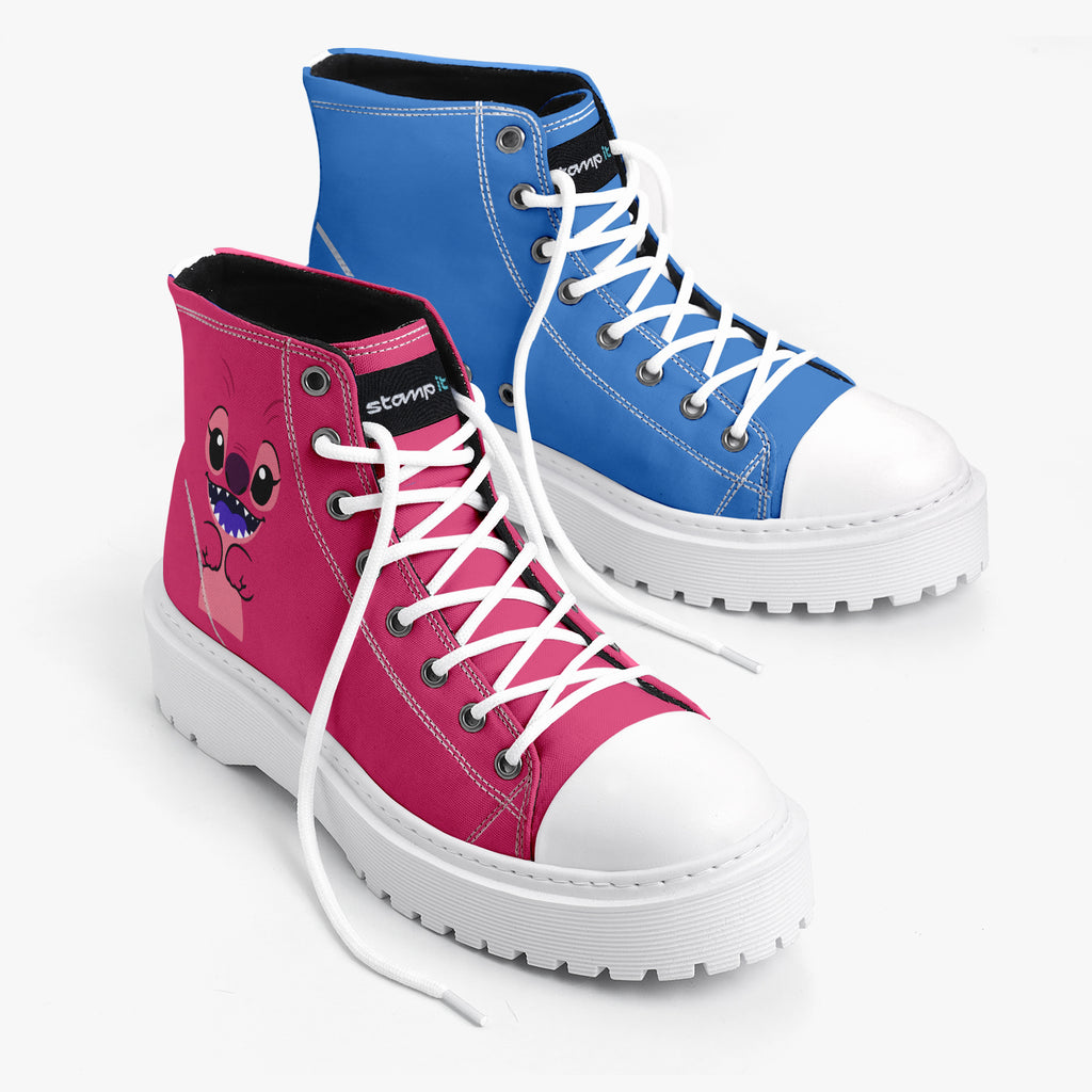 Tênis Cano Alto Plataforma Rosa e Azul Lilo e Stitch Duas Cores Séries E Filmes, confeccionado em lona, com cores e estampas exclusivas.