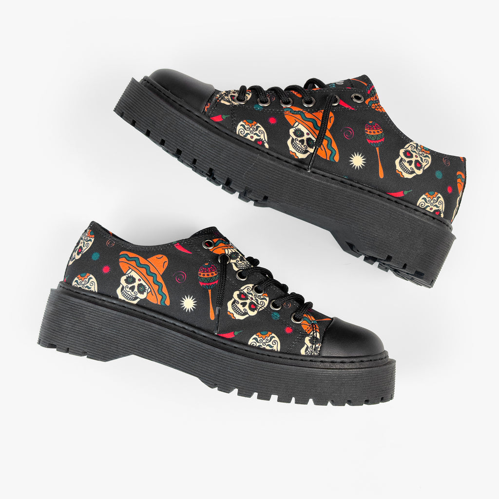 Tênis Cano Baixo Plataforma Preto Caveiras Mexicana Maracas Caveiras, confeccionado em lona, com cores e estampas exclusivas.