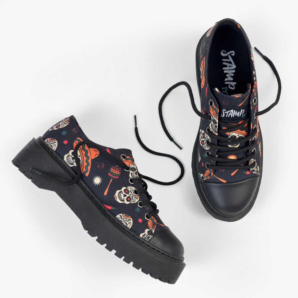 Tênis Cano Baixo Plataforma Preto Caveiras Mexicana Maracas Caveiras