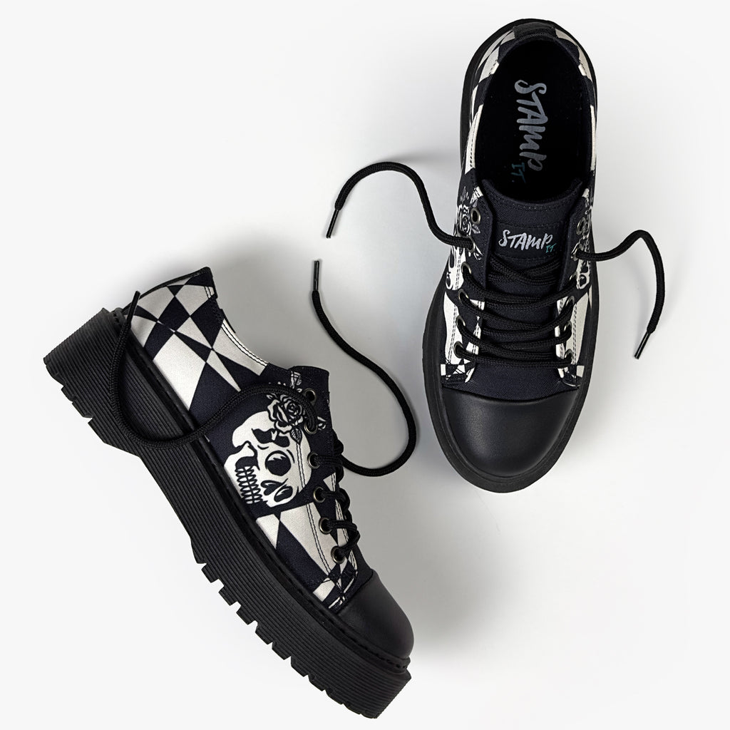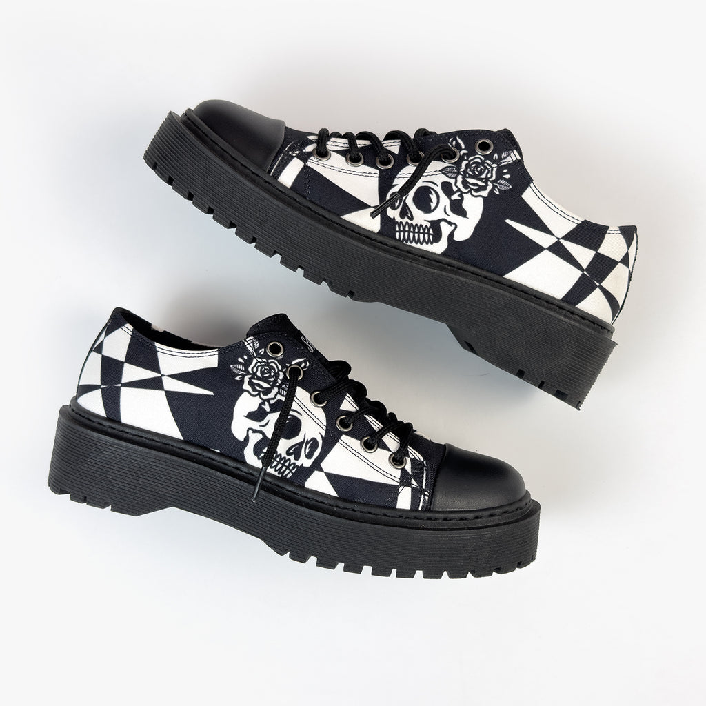 Tênis Cano Baixo Plataforma Preto e Branco Crânio Rosa Quadriculado Abstrato