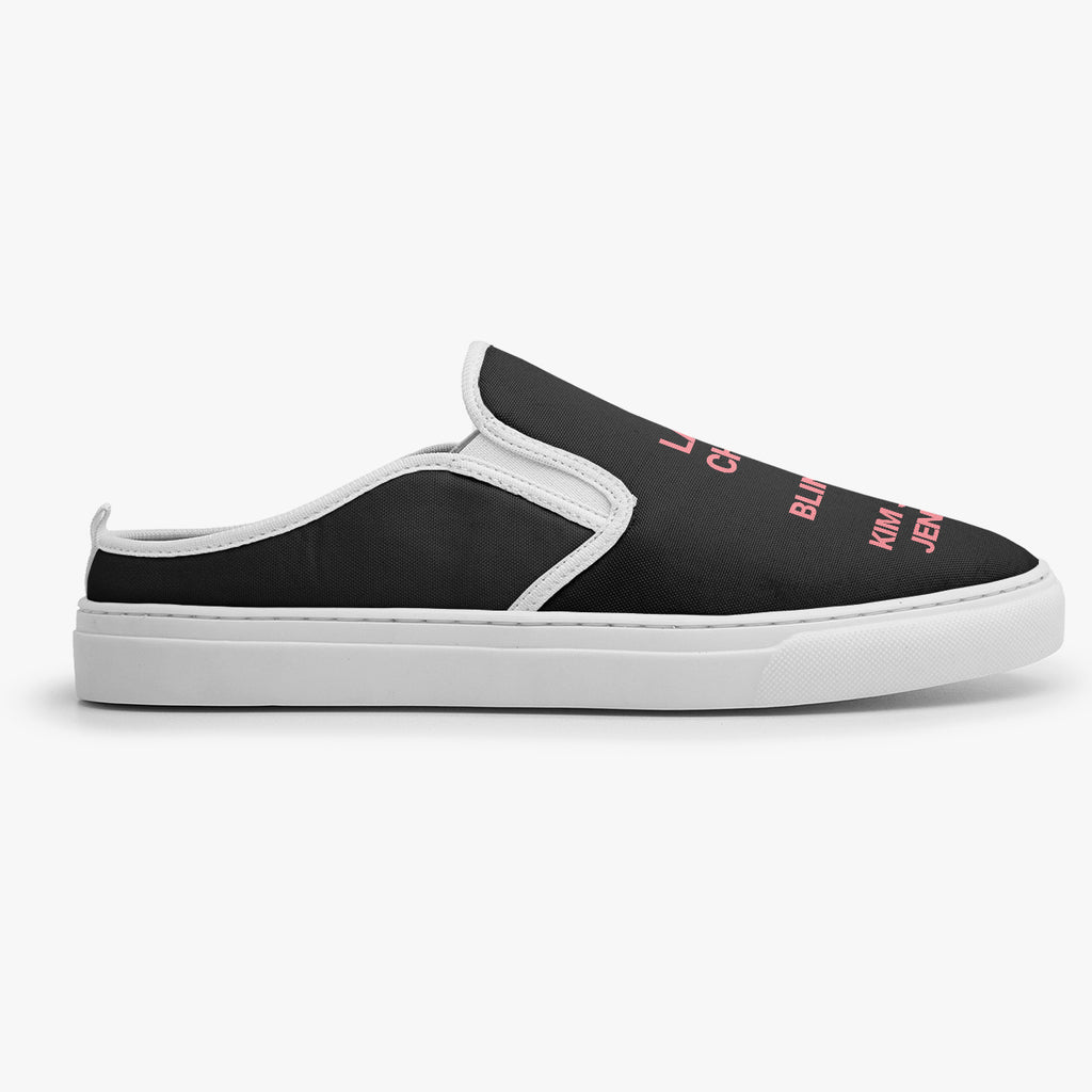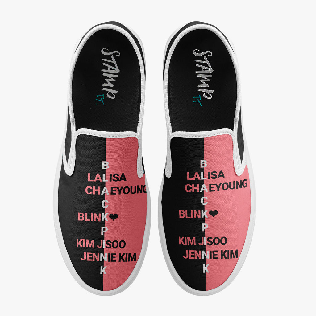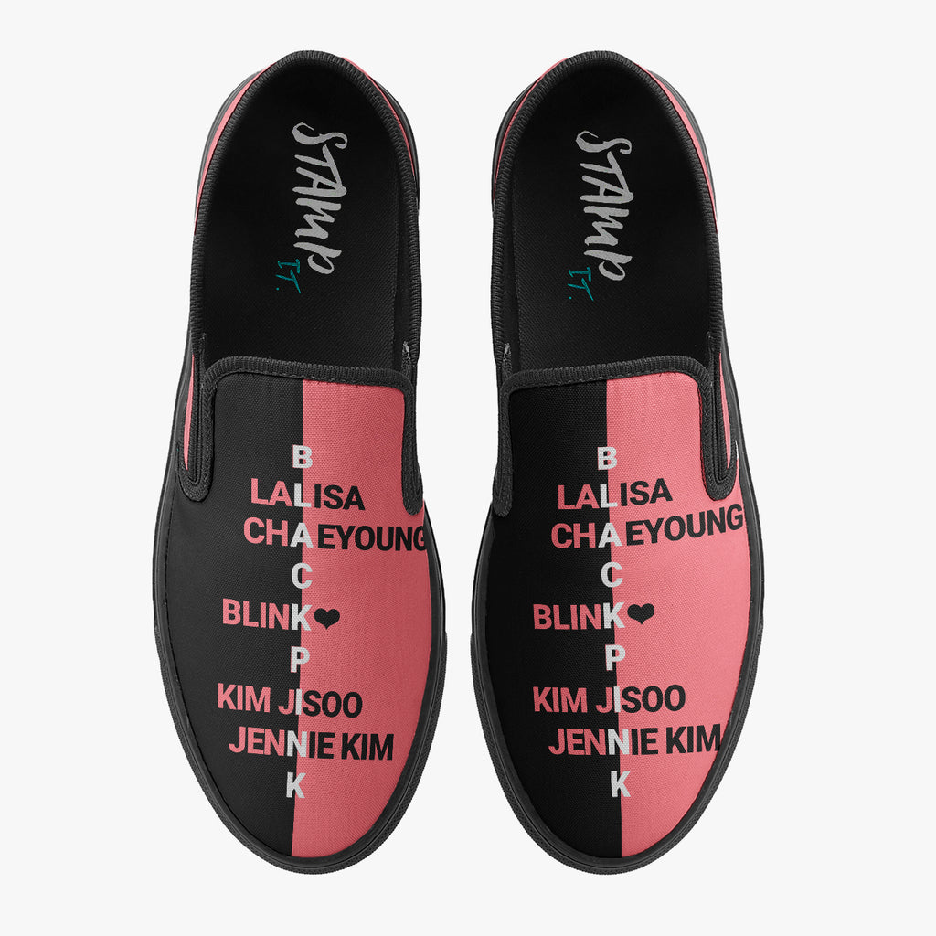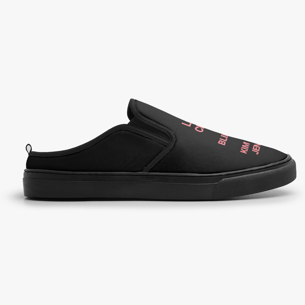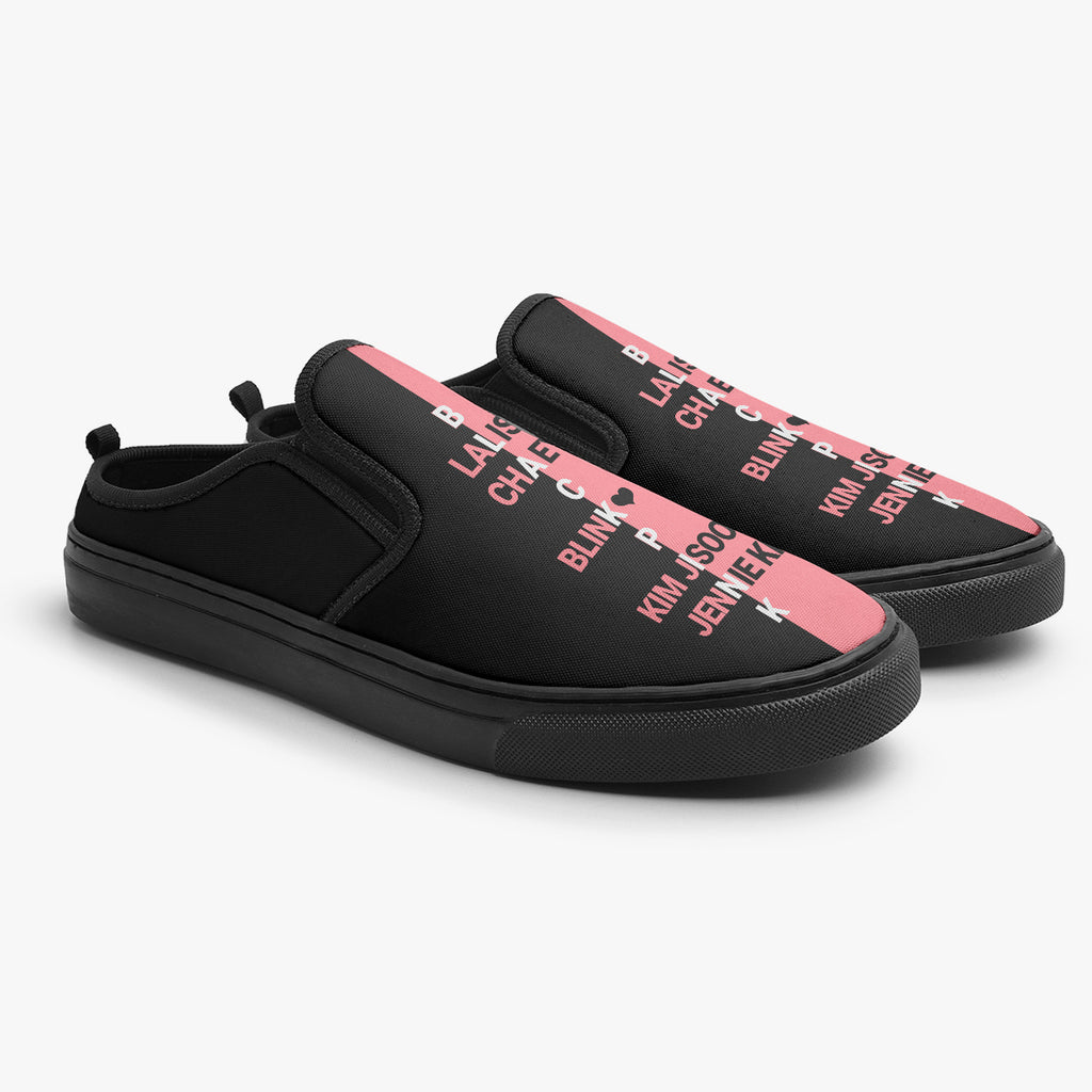 Calçado Mule Preto e Rosa Black Pink Kpop Integrantes Pop Music, confeccionado em lona, com cores e estampas exclusivas.