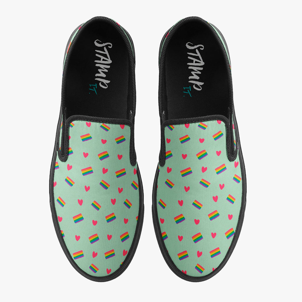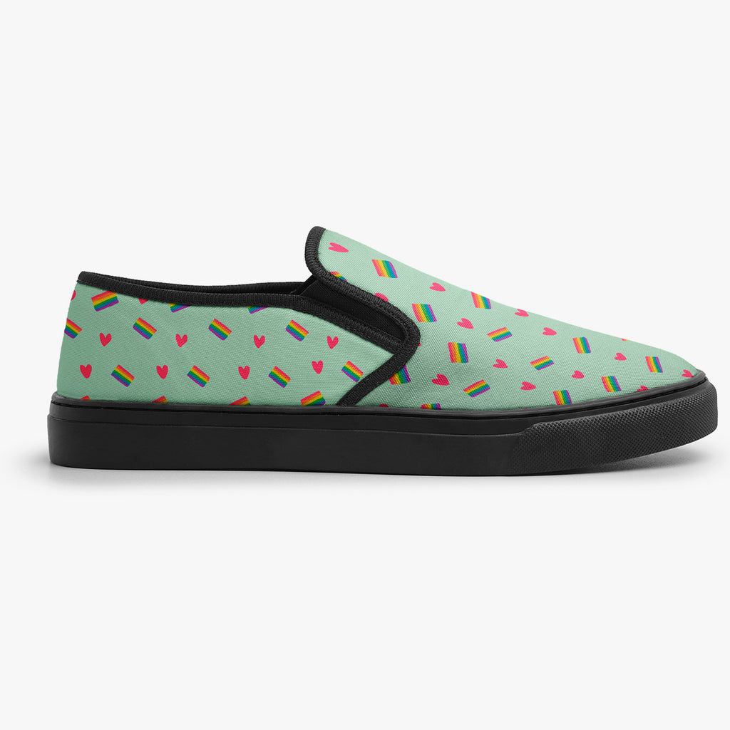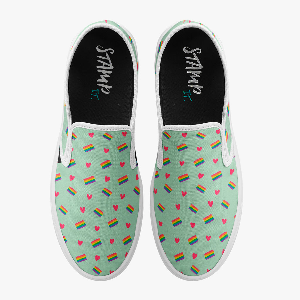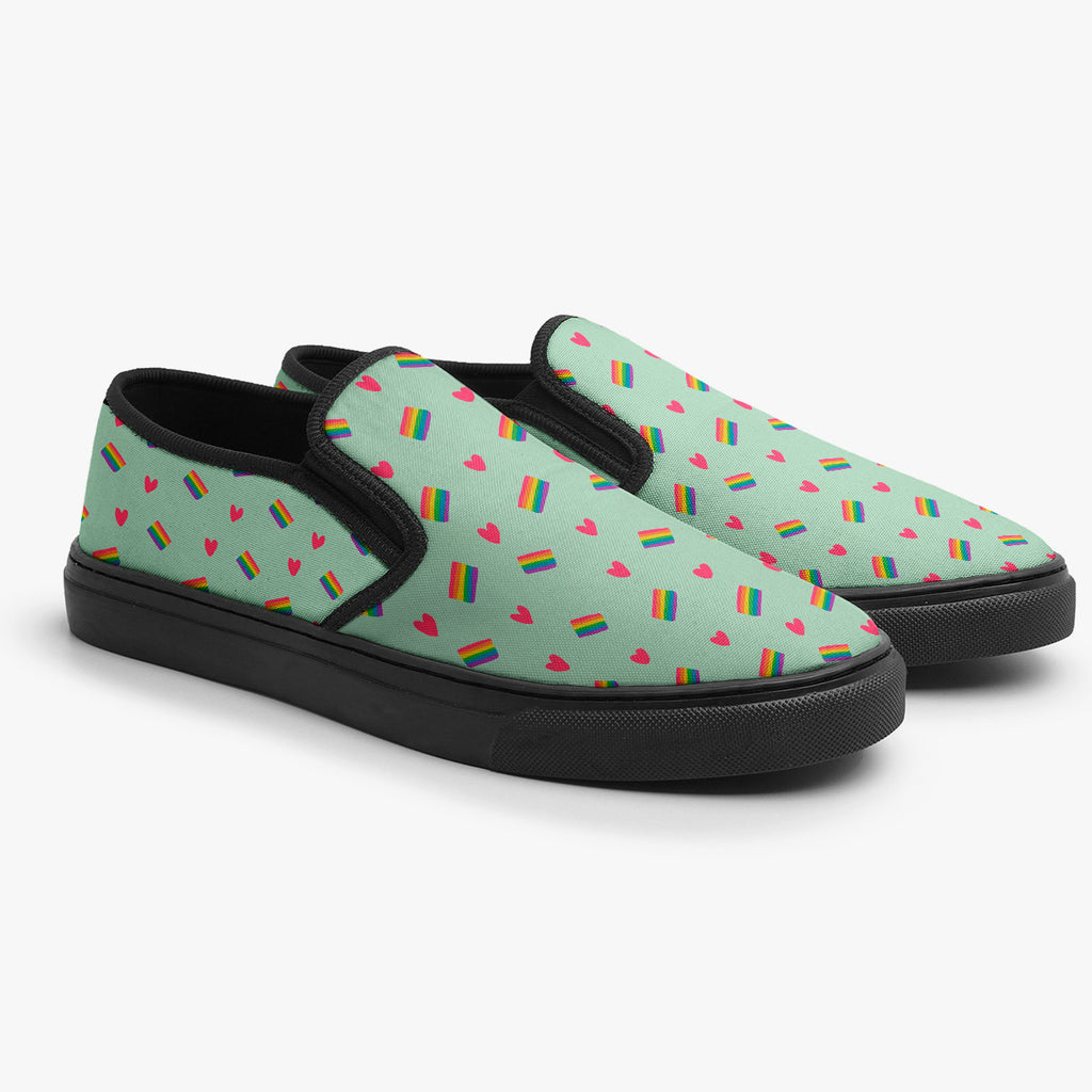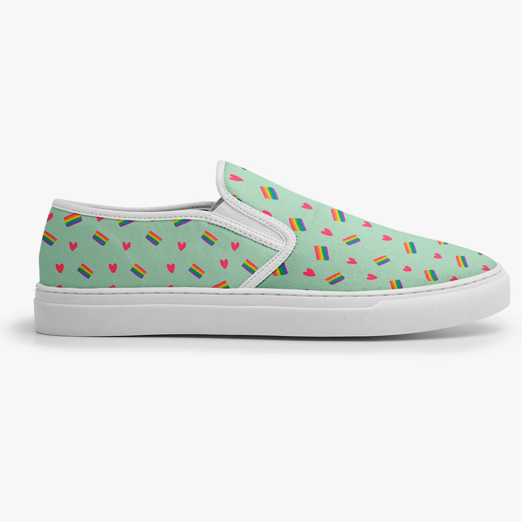 Calçado Slip On Azul Bebê Corações LGBTQIA+ Pride, confeccionado em lona, com cores e estampas exclusivas.