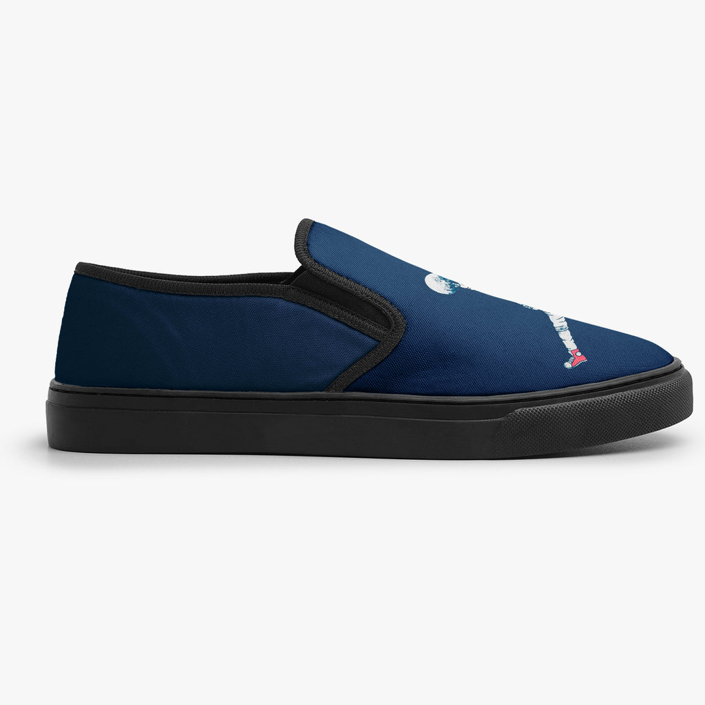 Tênis Slip On Azul Enterrada Astronauta Abstrato, confeccionado em lona, com cores e estampas exclusivas.