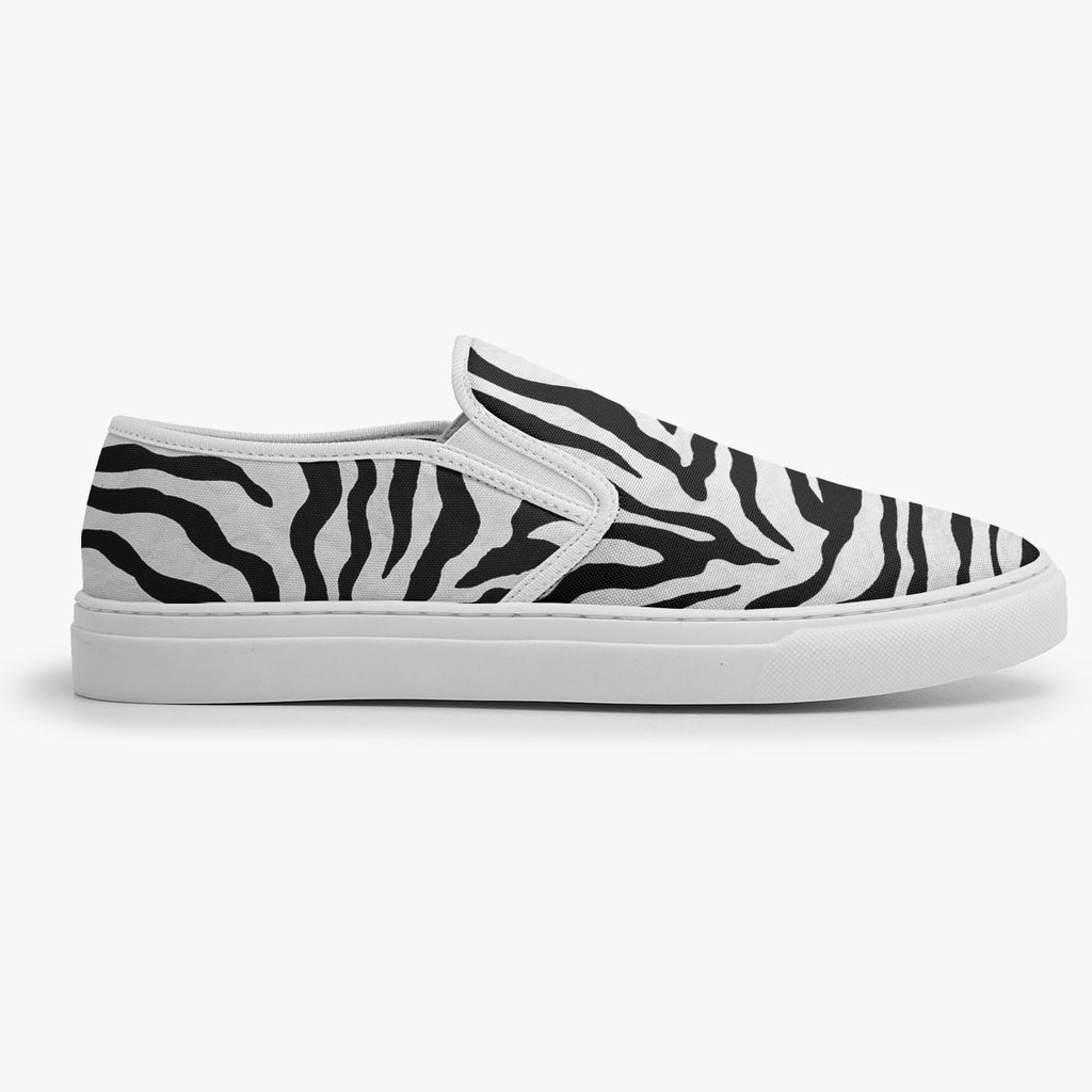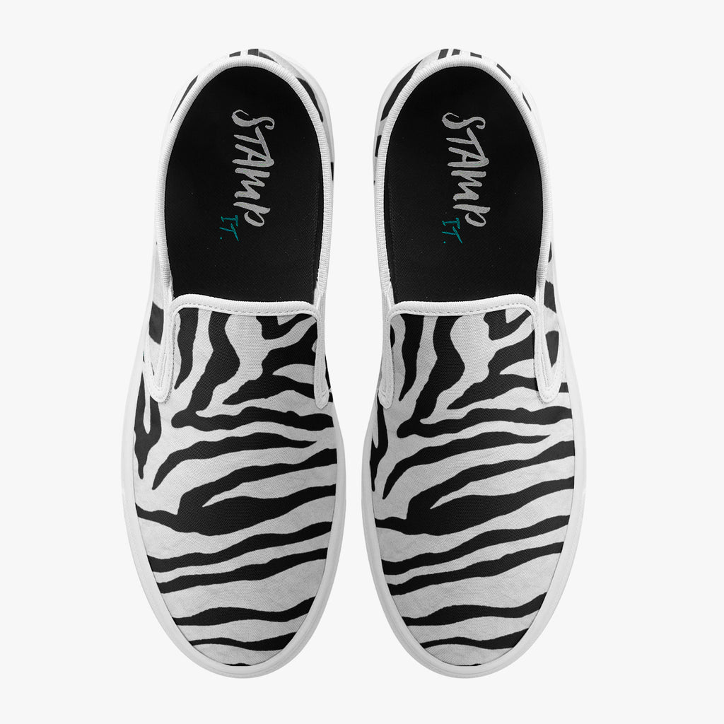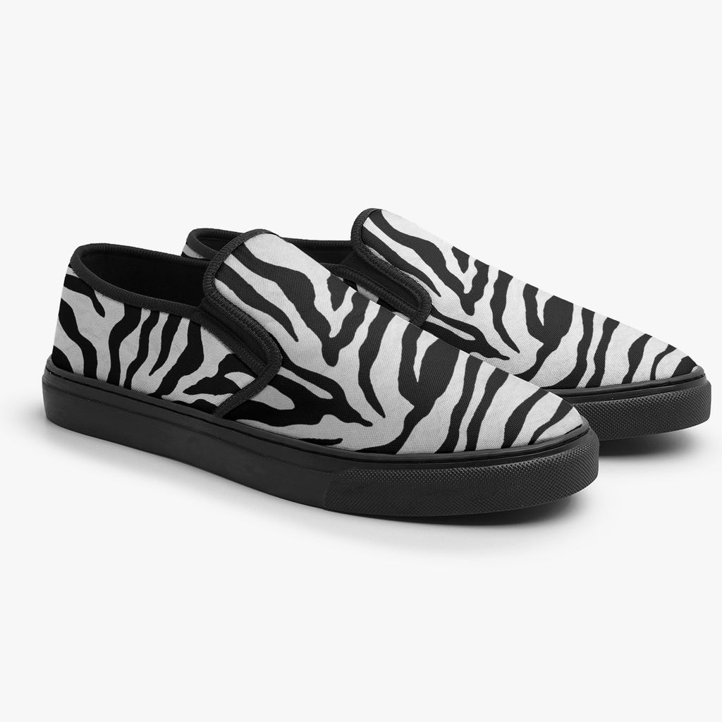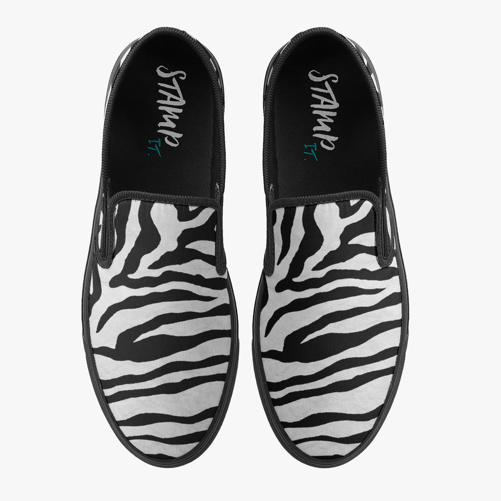 Tênis Slip On Branco e Preto Pattern Pele de Zebra Animais, confeccionado em lona, com cores e estampas exclusivas.