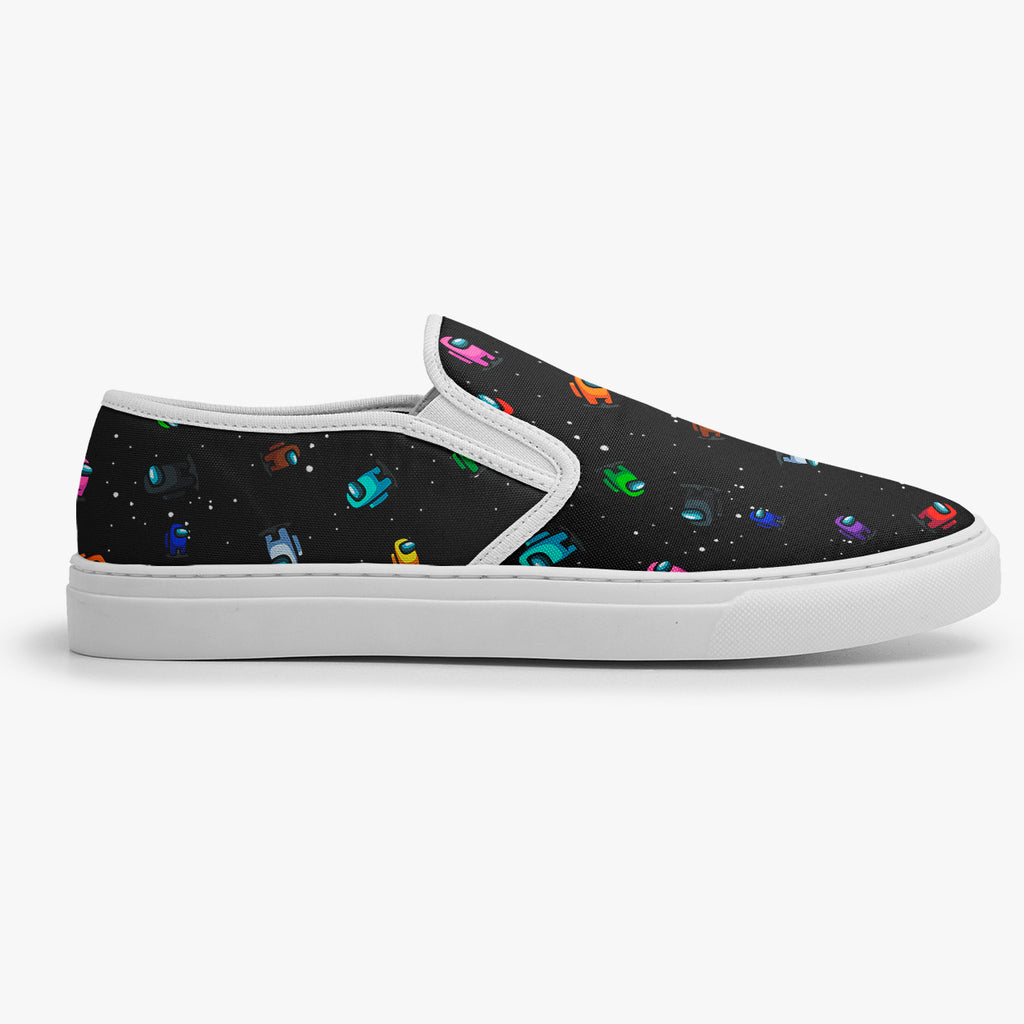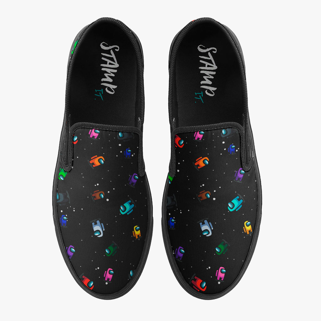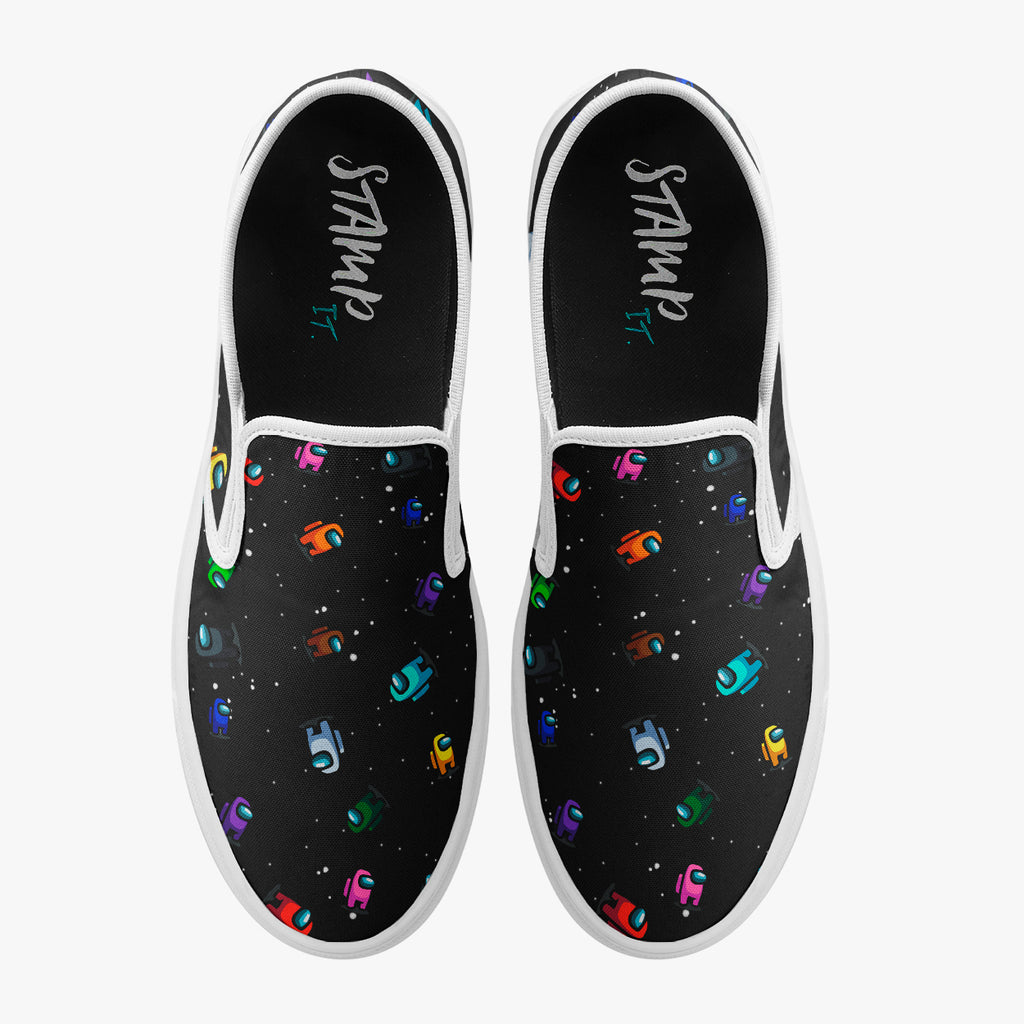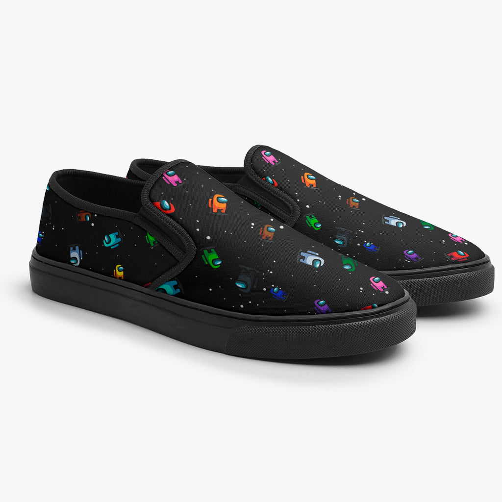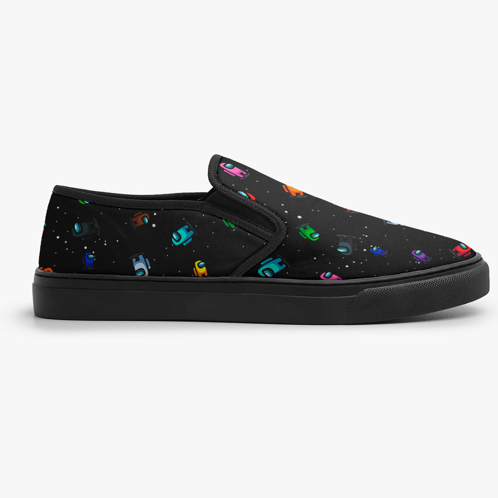 Tênis Slip On Preto Among Us Você Foi Ejetado Games, confeccionado em lona, com cores e estampas exclusivas.