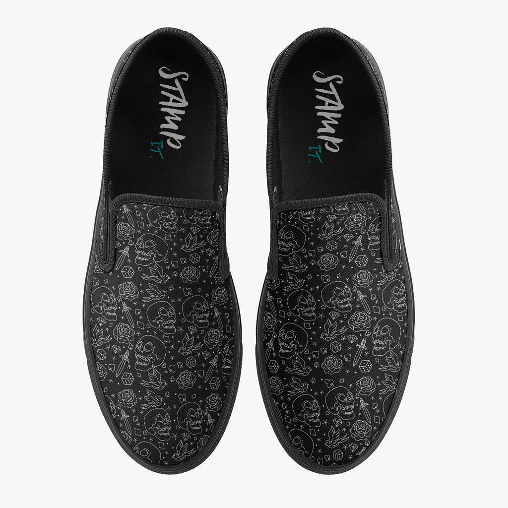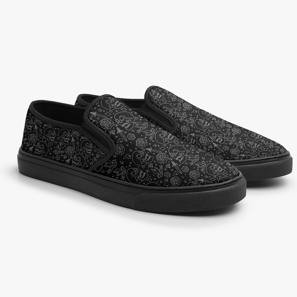 Calçado Slip On Preto Linha Faca Caveiras, confeccionado em lona, com cores e estampas exclusivas.