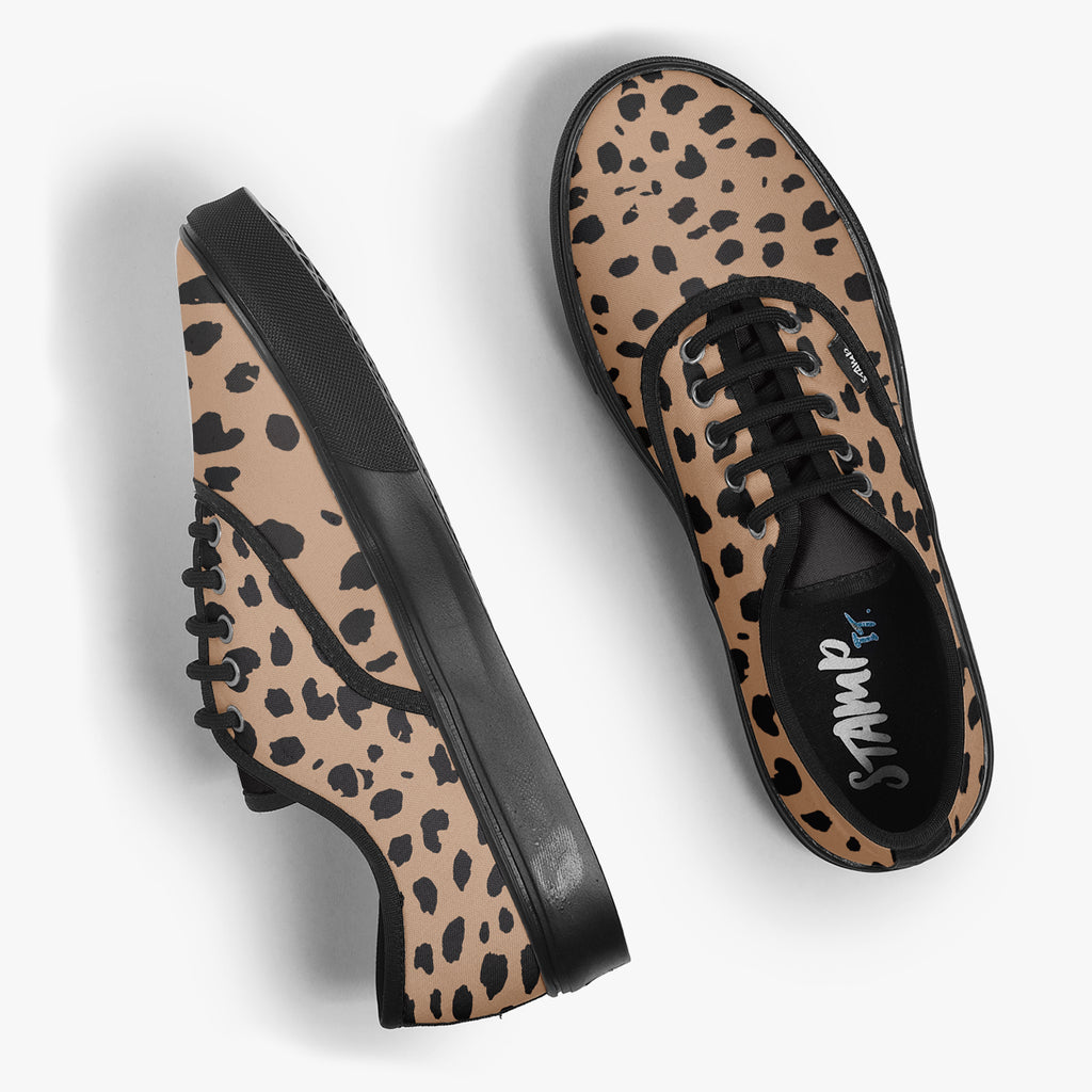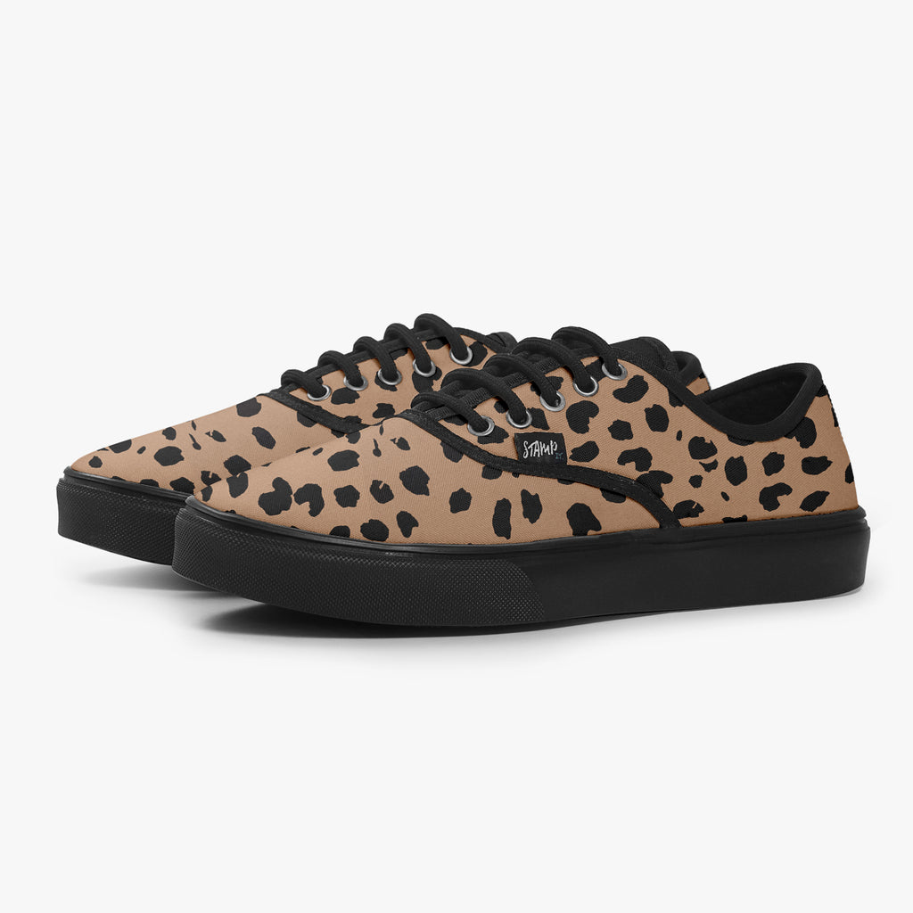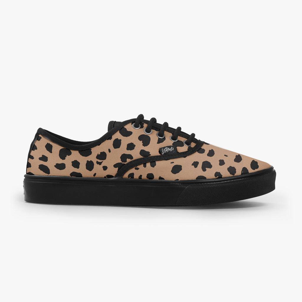 Tênis Casual Unissex Jaguar Preto Com Marrom Animais, confeccionado em lona, com cores e estampas exclusivas.