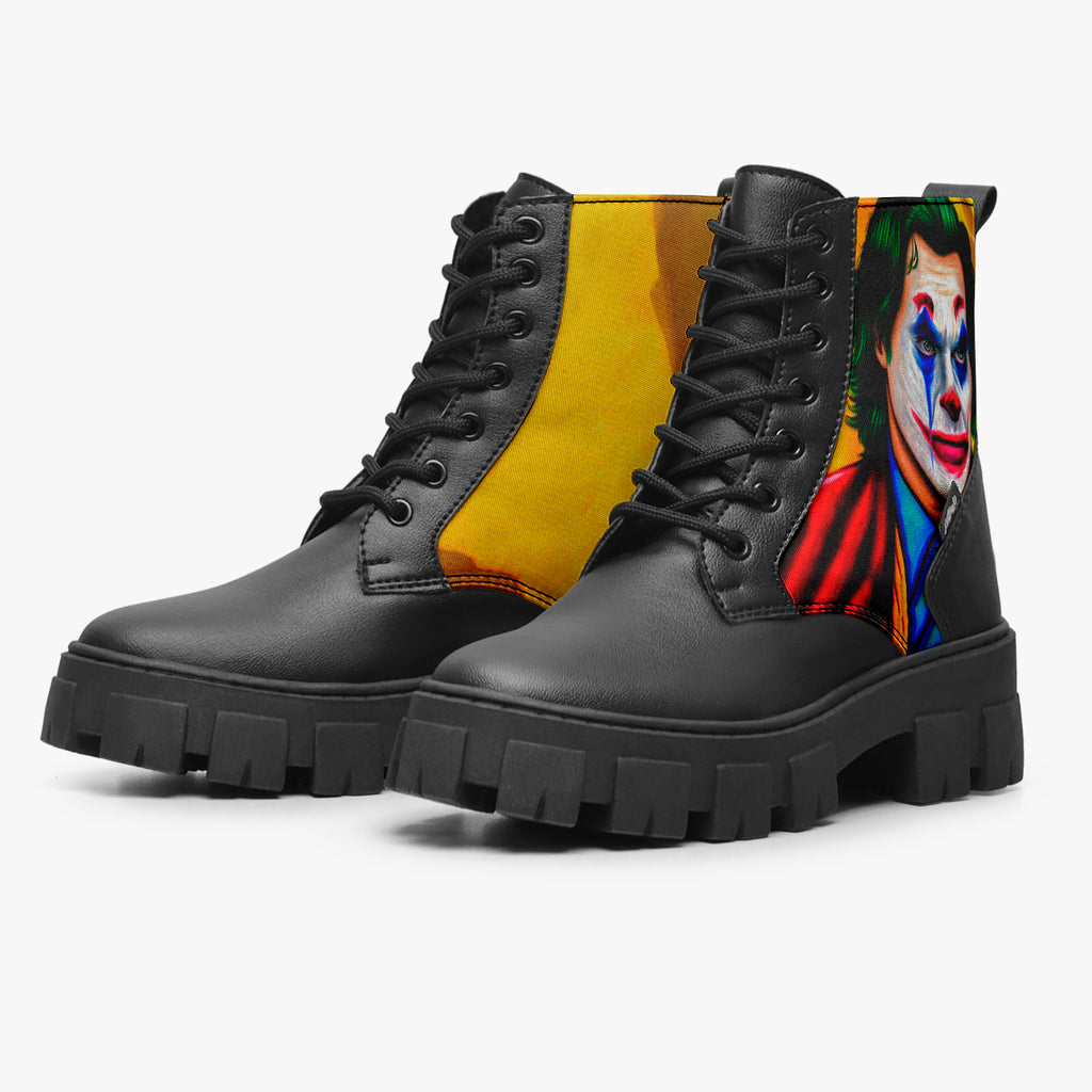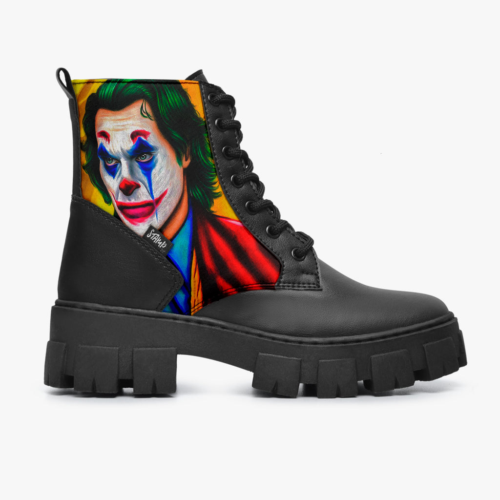Bota Coturno Tratorada Cano Médio Amarelo e Marrom Coringa Desenhado à Mão Johnsaniarts, confeccionado em lona e couro sintético com cores e estampas exclusivas.