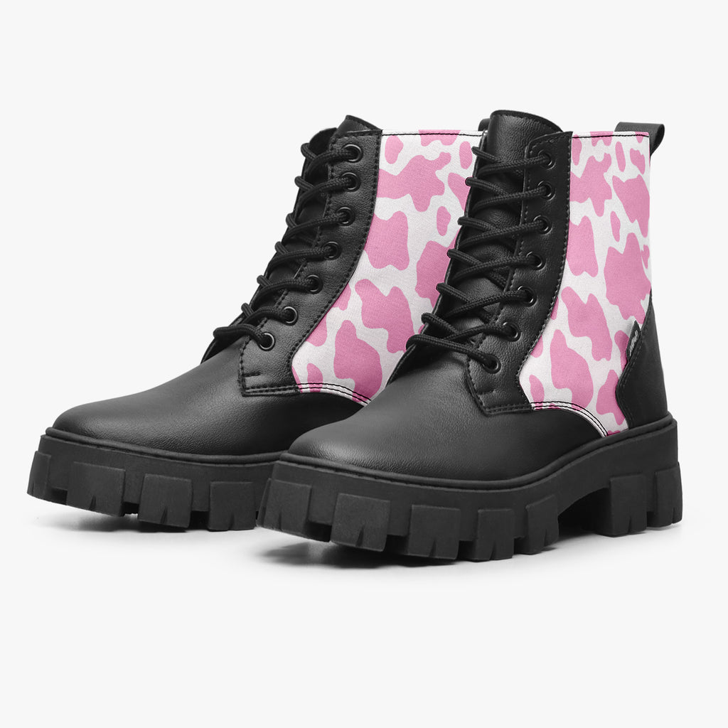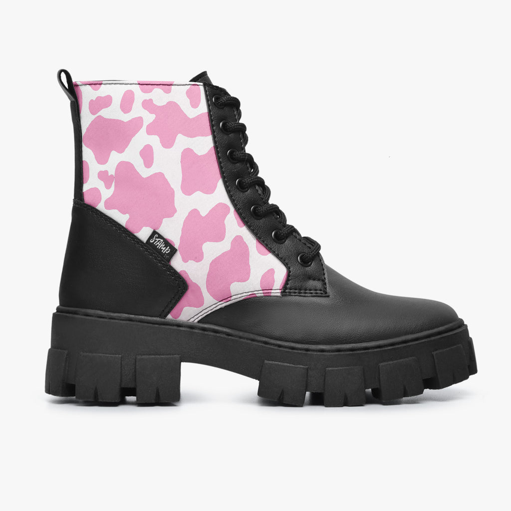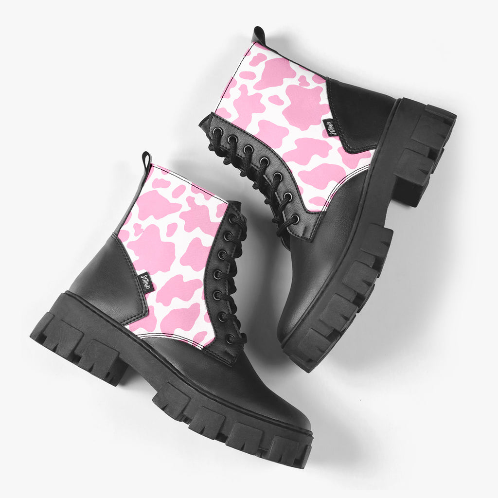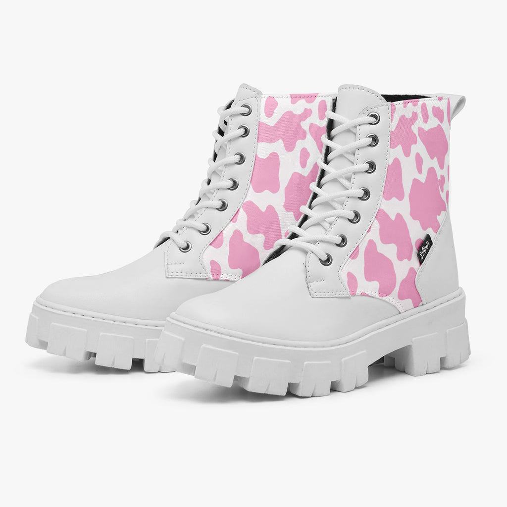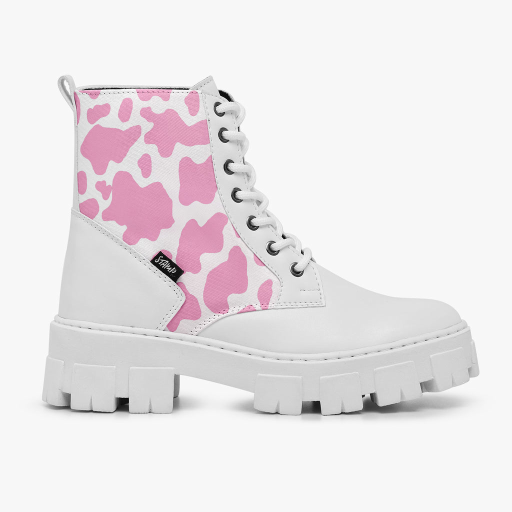 Bota Coturno Tratorada Cano Médio Animal Print Vaca Rosa Bebê e Branco Animal Print