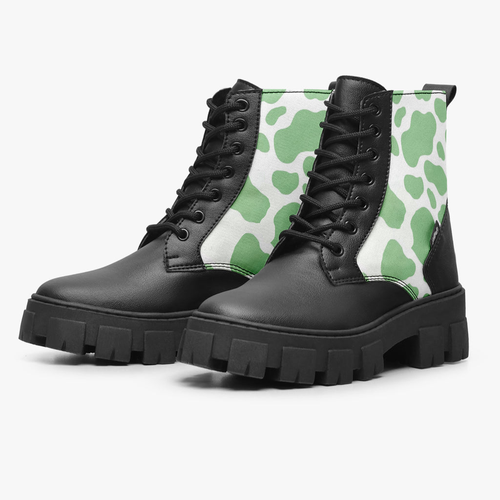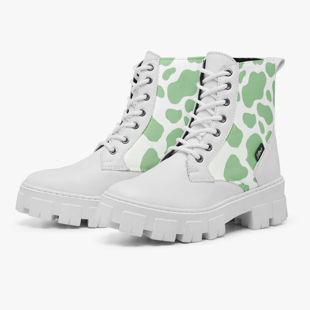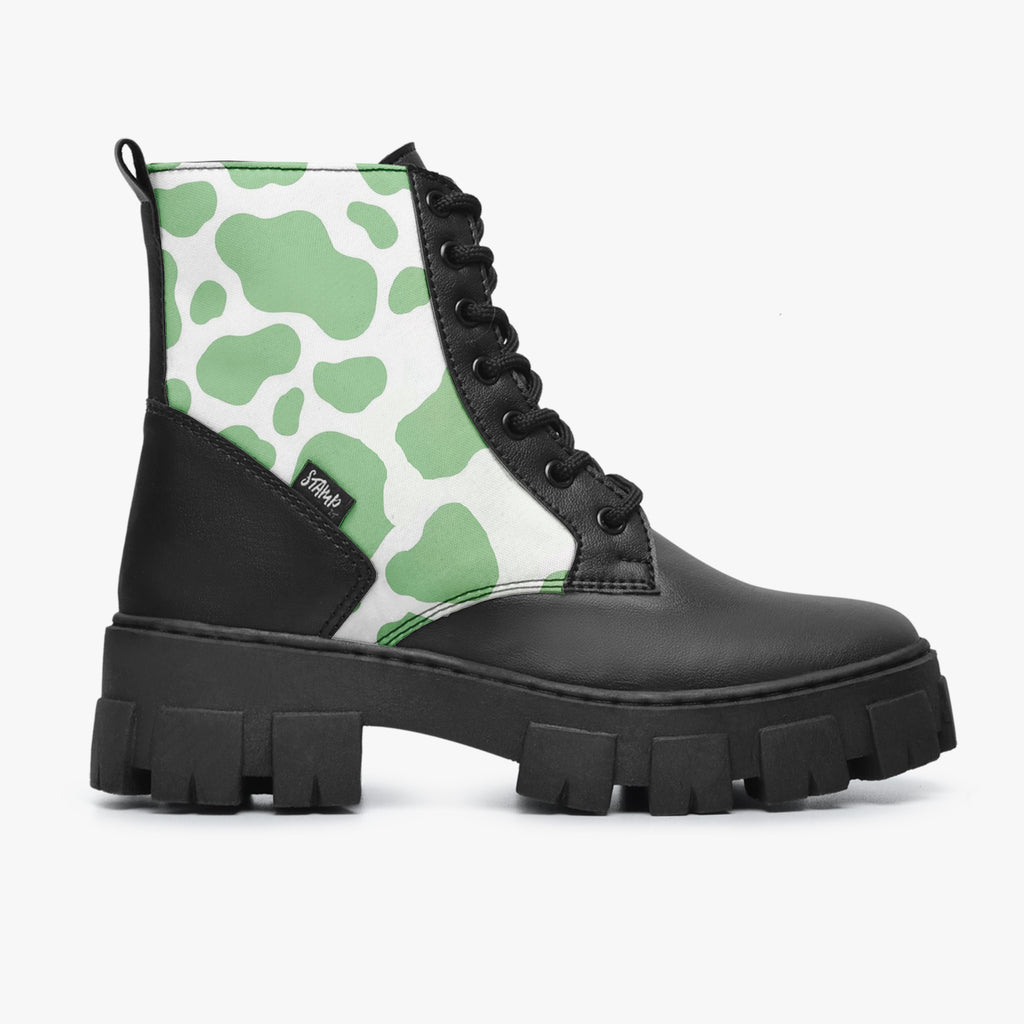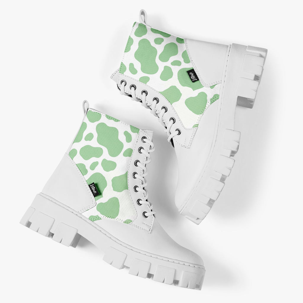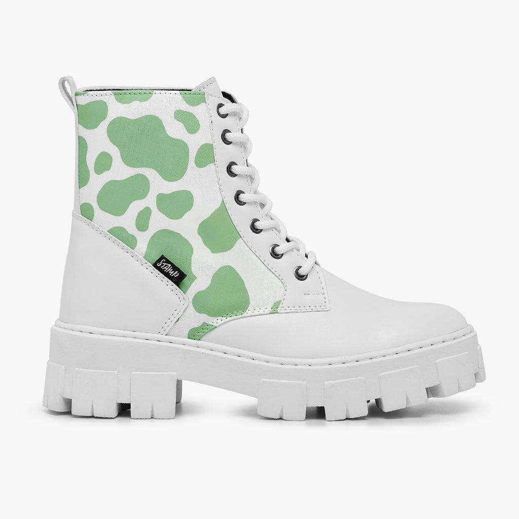Bota Coturno Tratorada Cano Médio Animal Print Vaca Verde Pastel Branco Animal Print, confeccionado em lona e couro sintético com cores e estampas exclusivas.