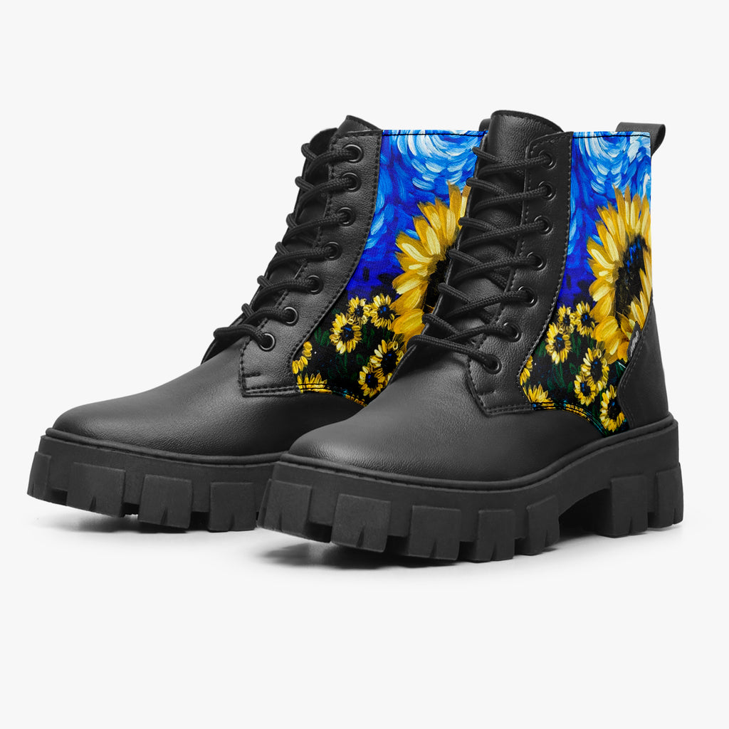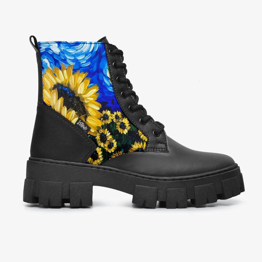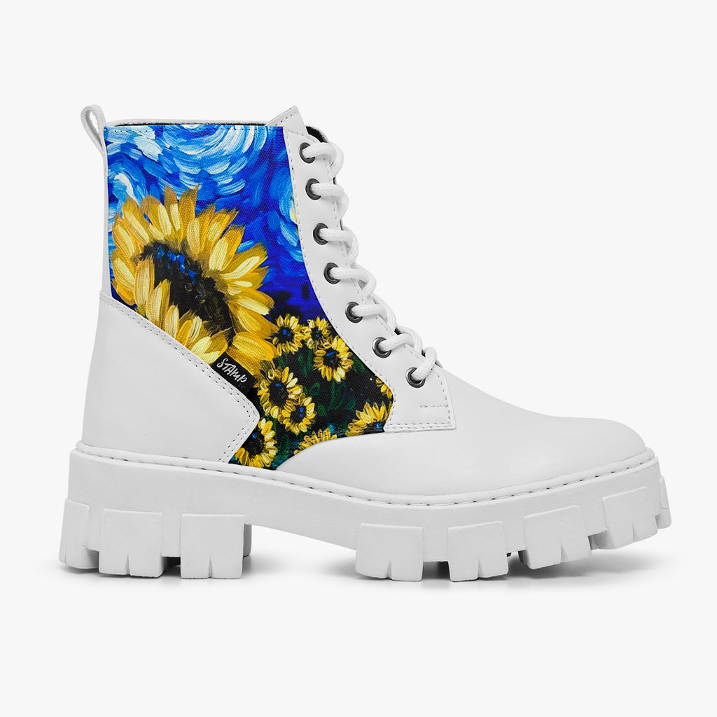Bota Coturno Tratorada Cano Médio Arte Aquarela Céu e Girassóis Cultura e Arte, confeccionado em lona e couro sintético com cores e estampas exclusivas.