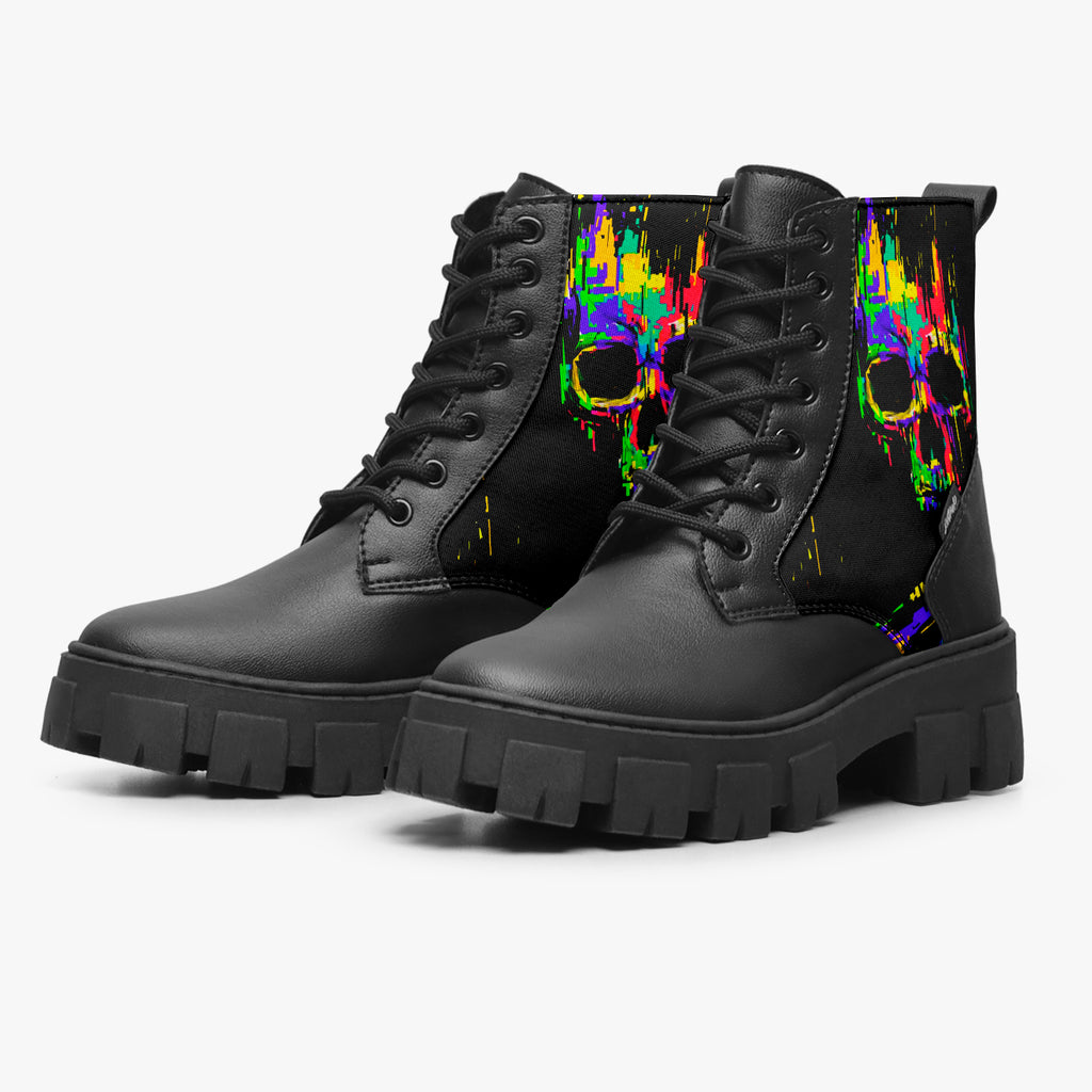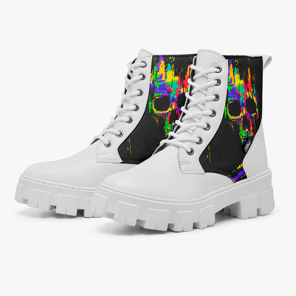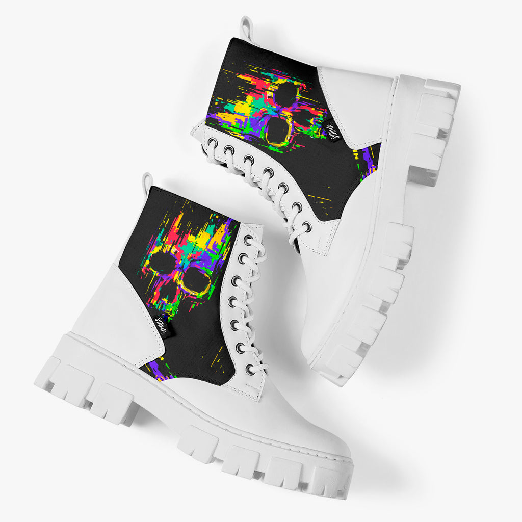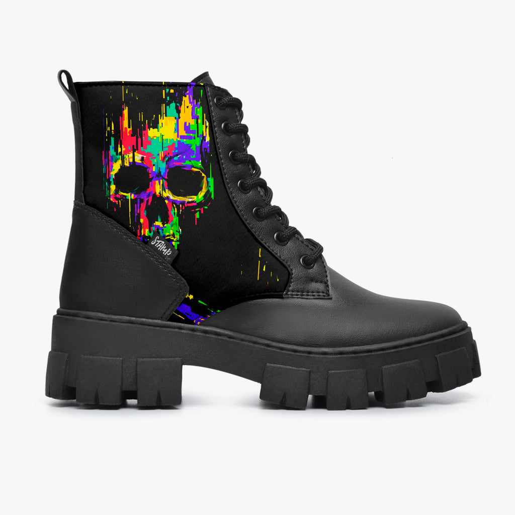Bota Coturno Tratorada Cano Médio Caveira Pixels Preto Caveiras, confeccionado em lona e couro sintético com cores e estampas exclusivas.