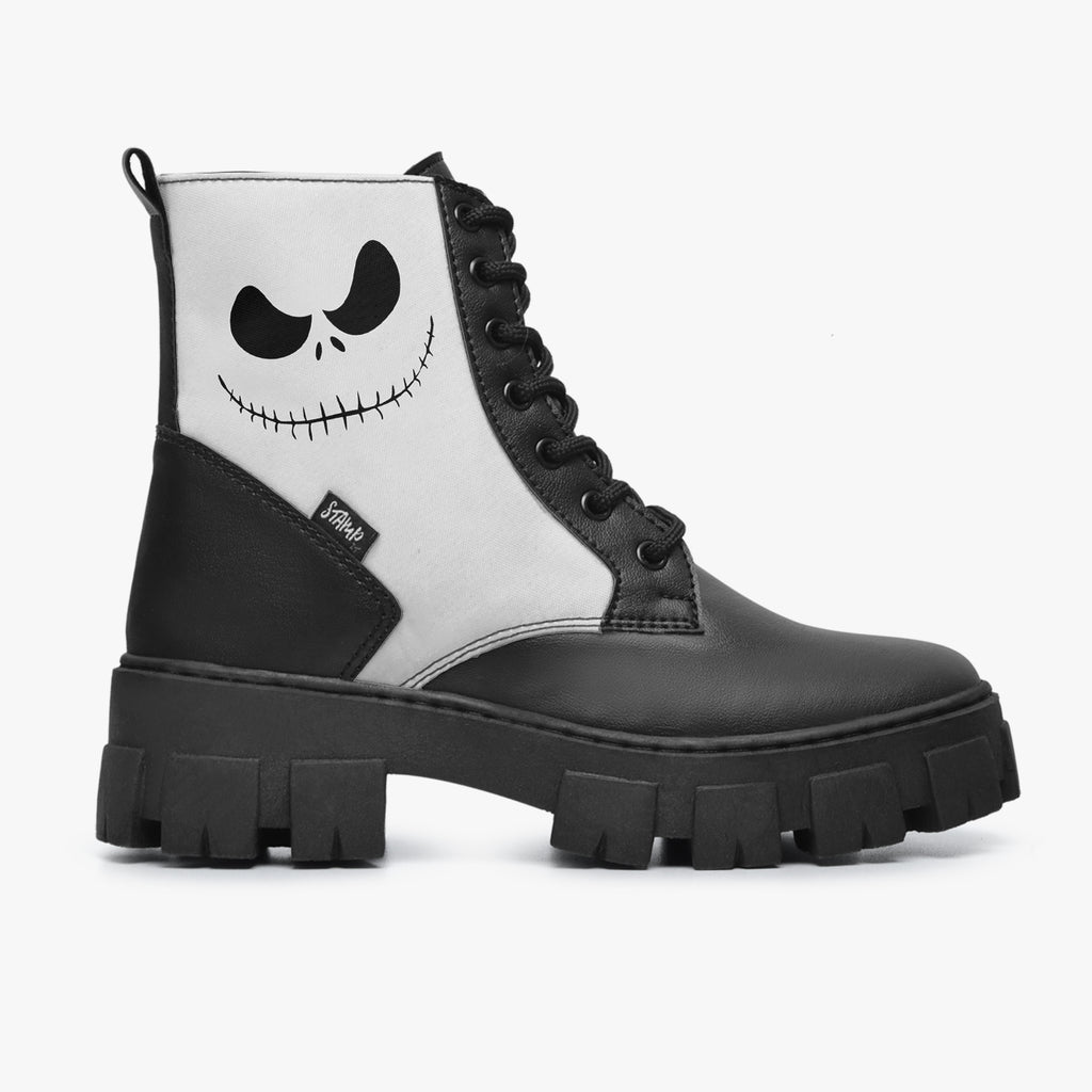 Bota Coturno Tratorada Cano Médio Cinza O Estranho mundo de Jack Filmes, confeccionado em lona e couro sintético com cores e estampas exclusivas.