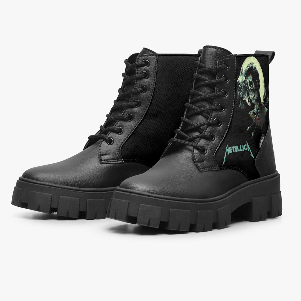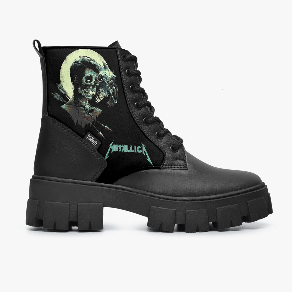 Bota Coturno Tratorada Cano Médio Heavy Metal Metallica Invasão Zumbi Preto Bandas de Rock, confeccionado em lona e couro sintético com cores e estampas exclusivas.
