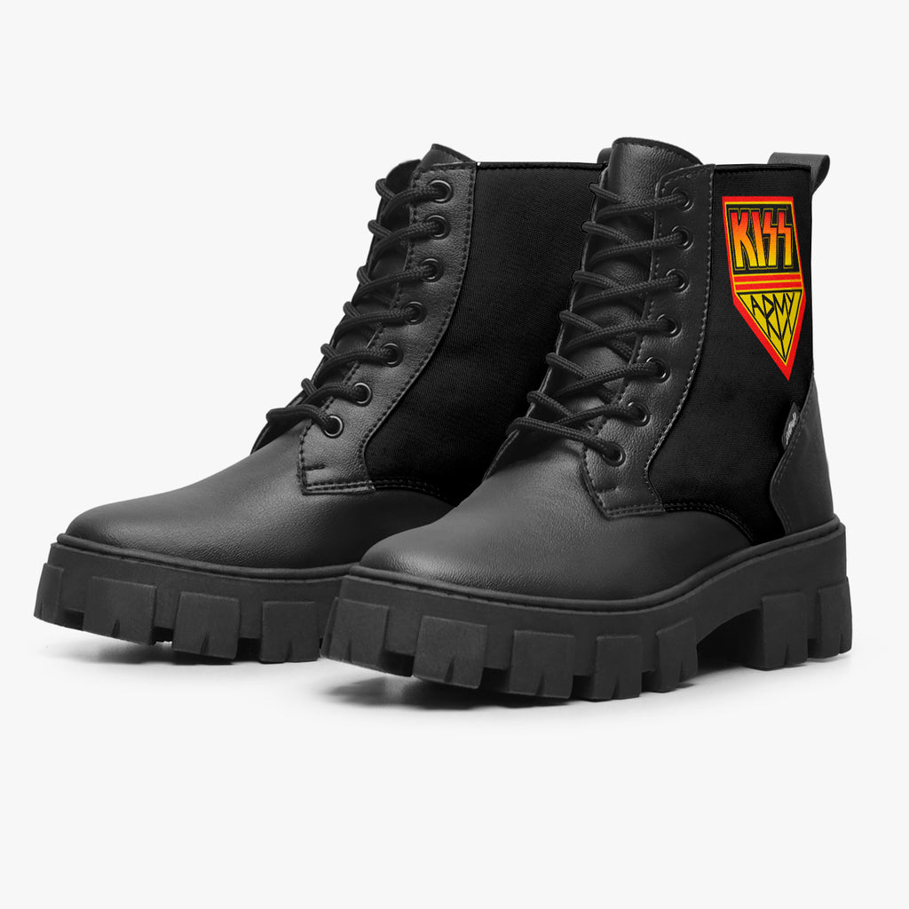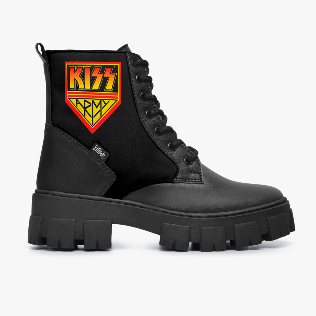 Bota Coturno Tratorada Cano Médio Kiss Army, confeccionado em lona e couro sintético com cores e estampas exclusivas.