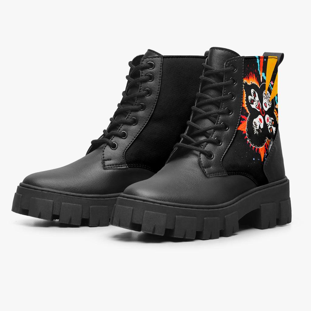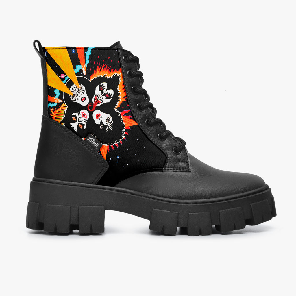Bota Coturno Tratorada Cano Médio Kiss Heavy Metal in the Galaxy Preto Bandas de Rock, confeccionado em lona e couro sintético com cores e estampas exclusivas.