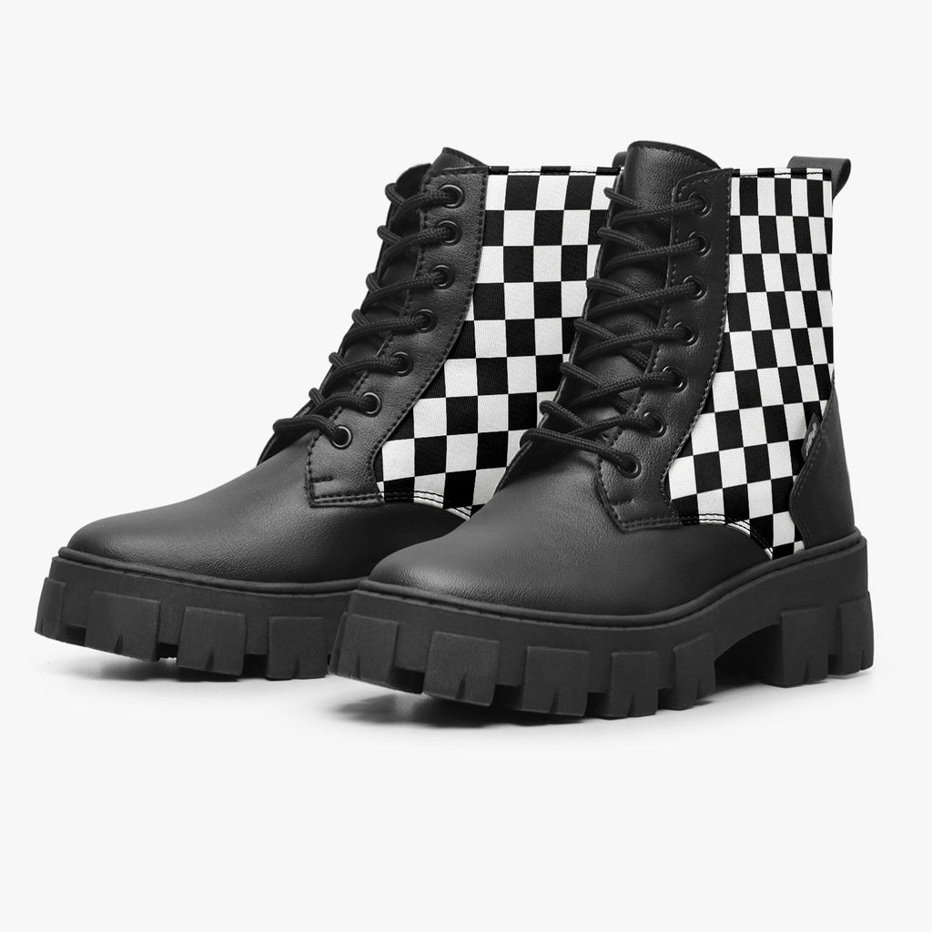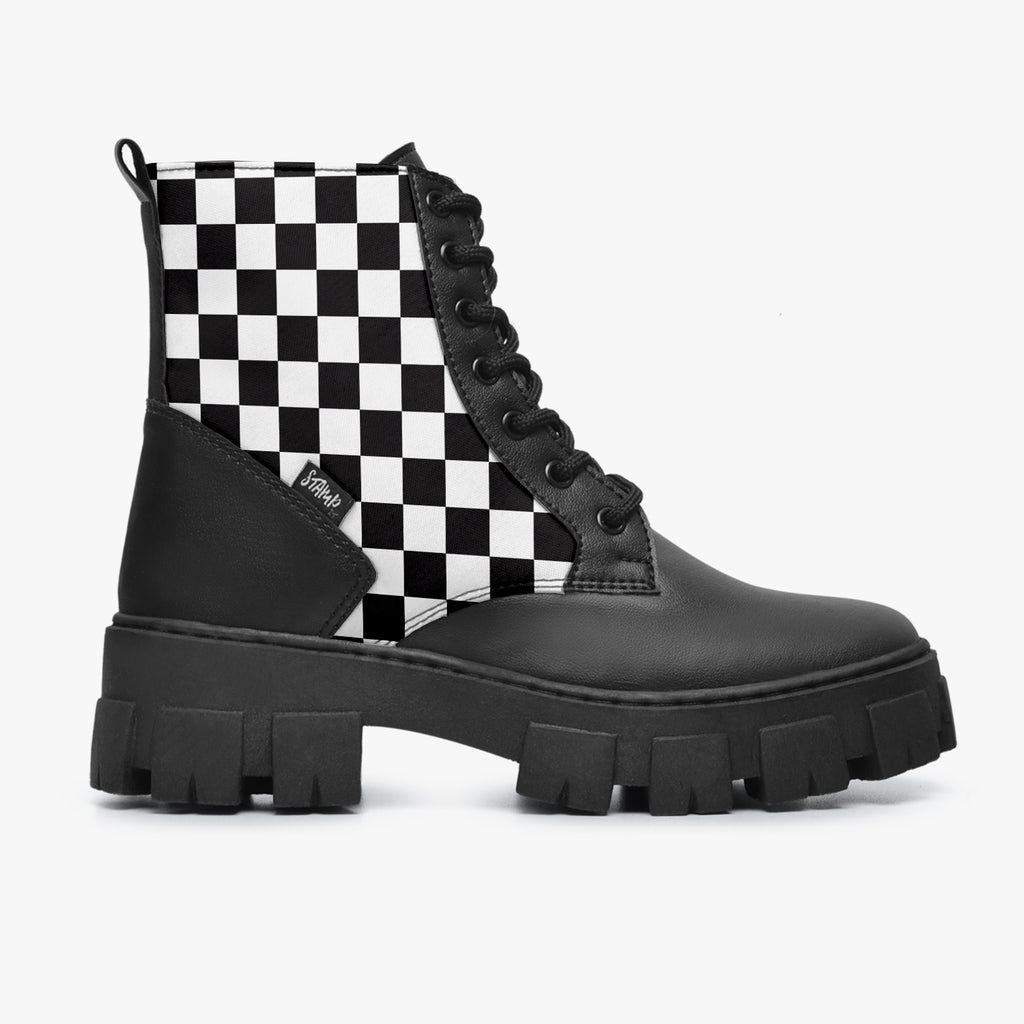 Bota Coturno Tratorada Cano Médio Preto e Branco Quadriculado Abstrato, confeccionado em lona e couro sintético com cores e estampas exclusivas.
