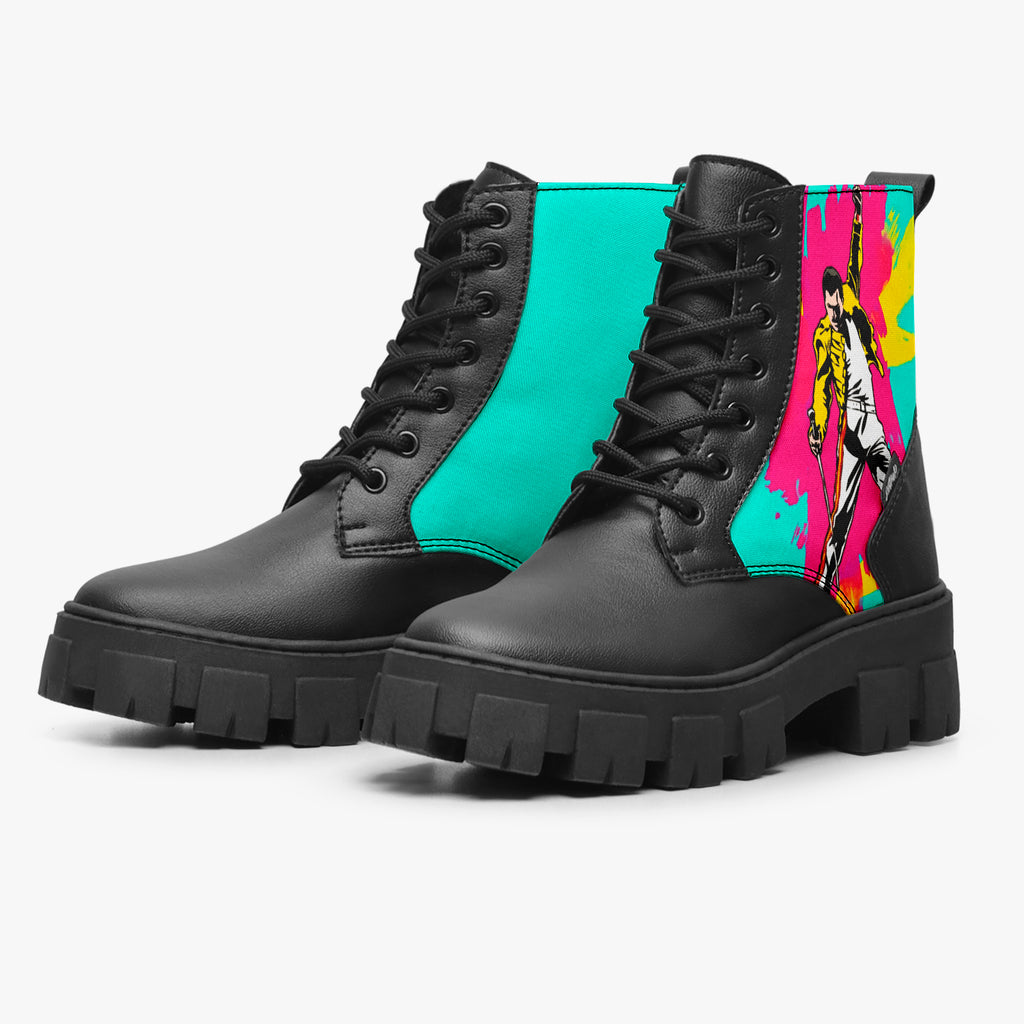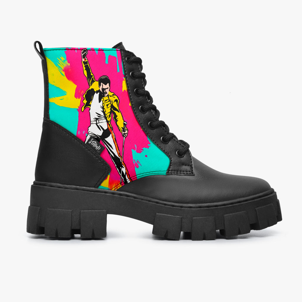 Bota Coturno Tratorada Cano Médio Queen Freddie Mercury Colorido Bandas de rock, confeccionado em lona e couro sintético com cores e estampas exclusivas.