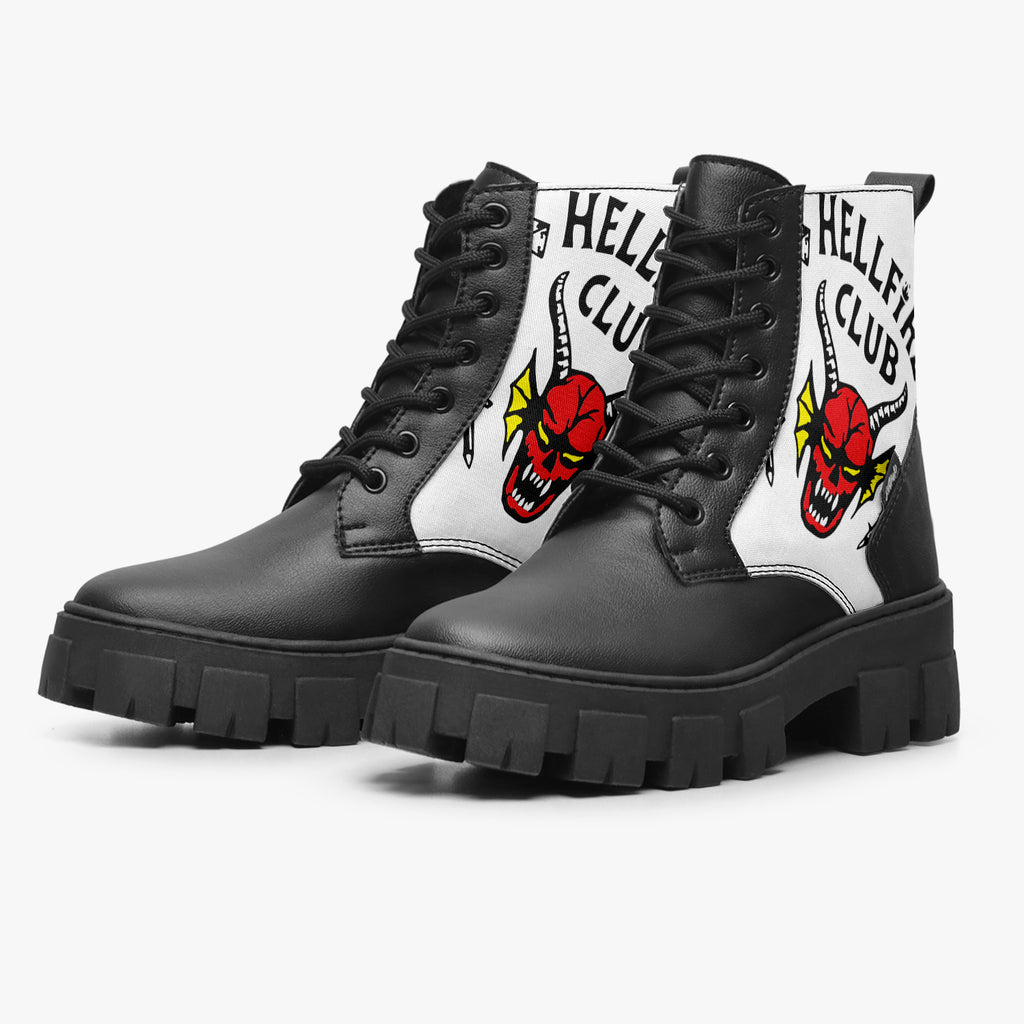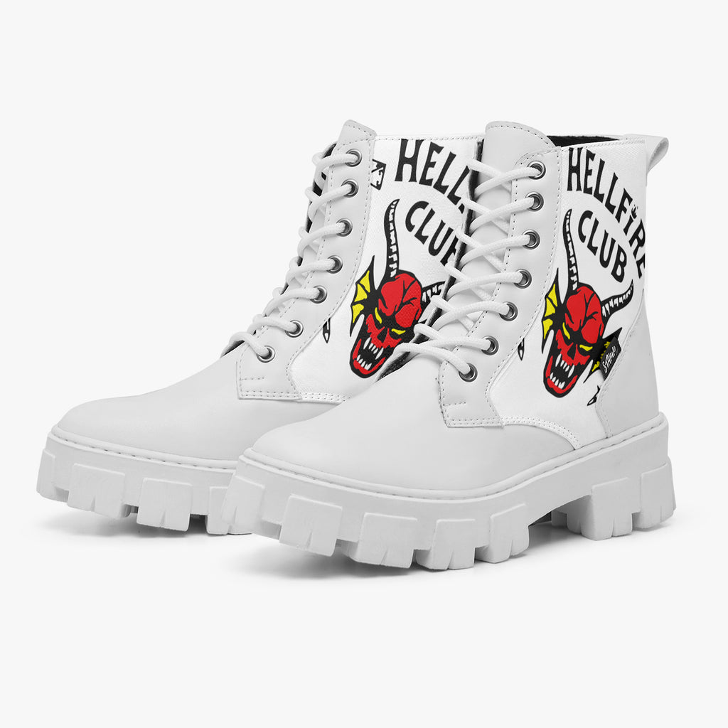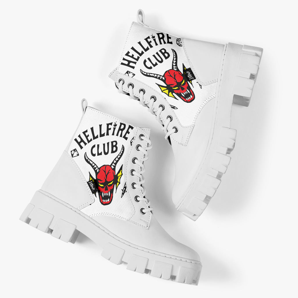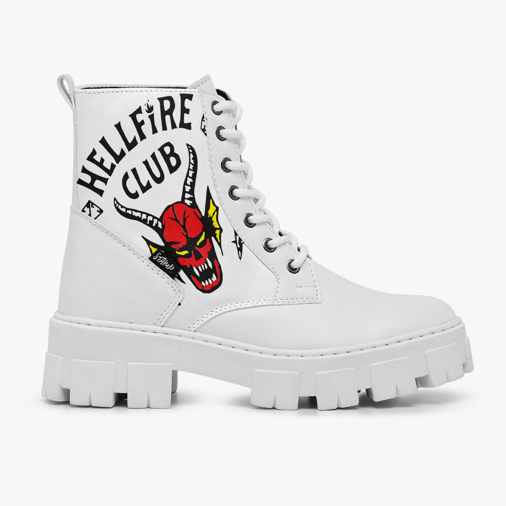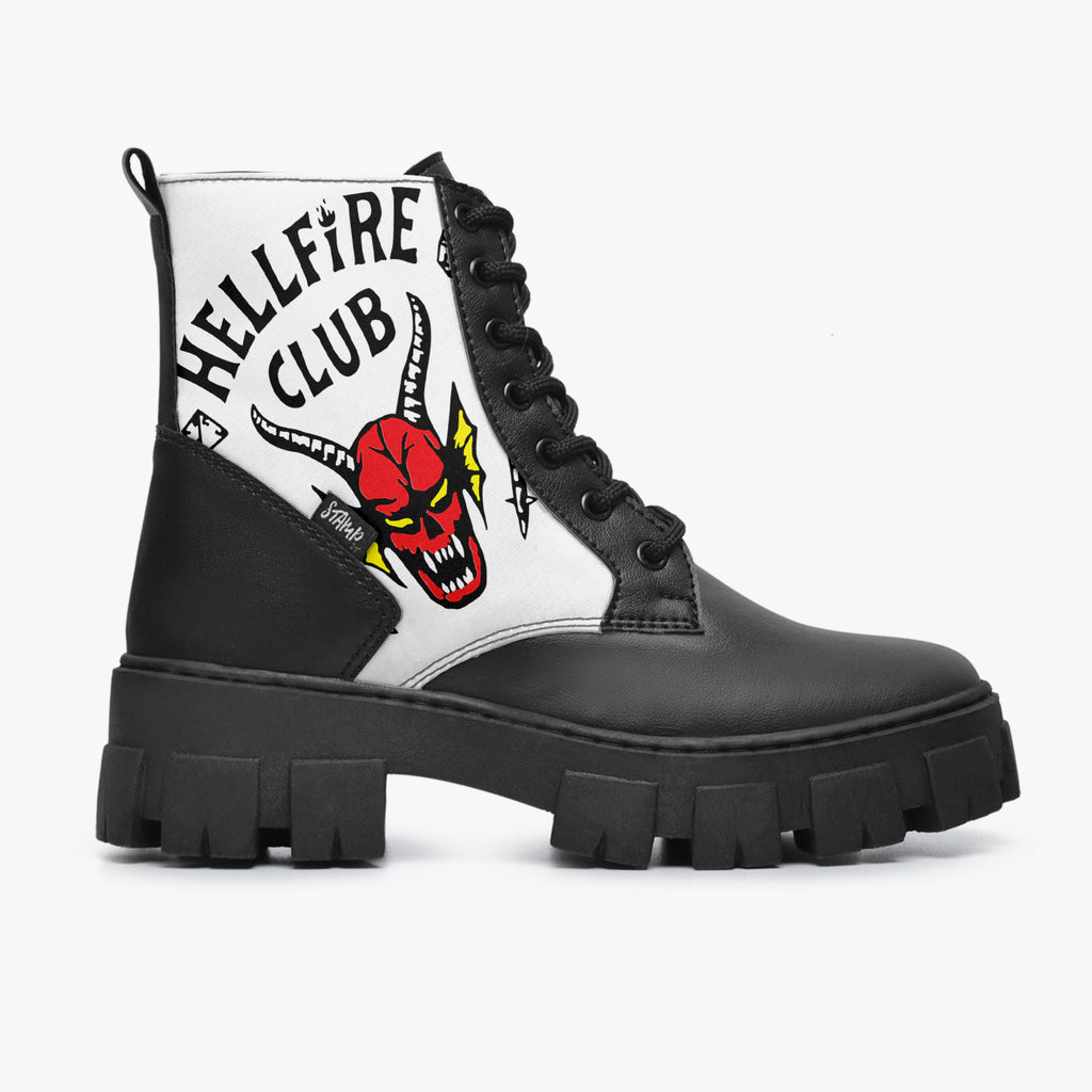 Bota Coturno Tratorada Cano Médio Stranger Things Hellfire Club Séries e Filmes, confeccionado em lona e couro sintético com cores e estampas exclusivas.