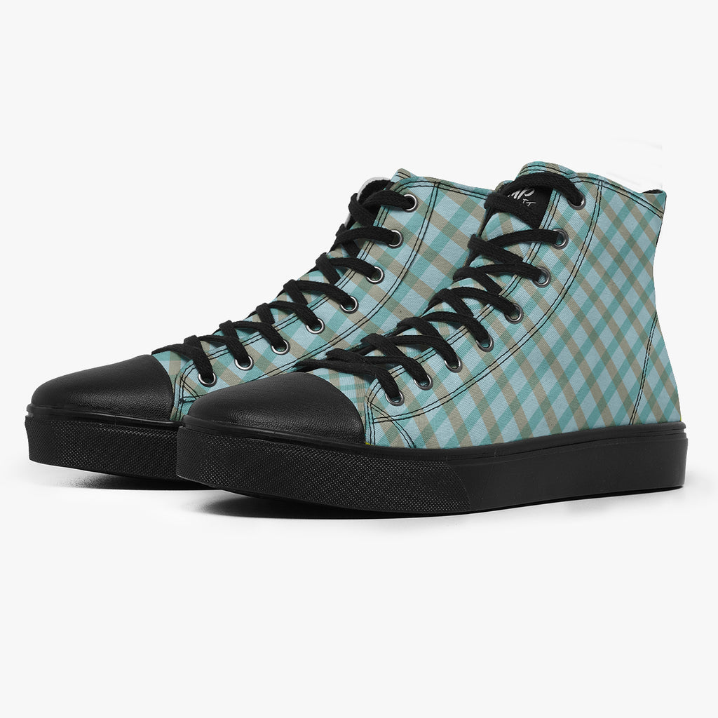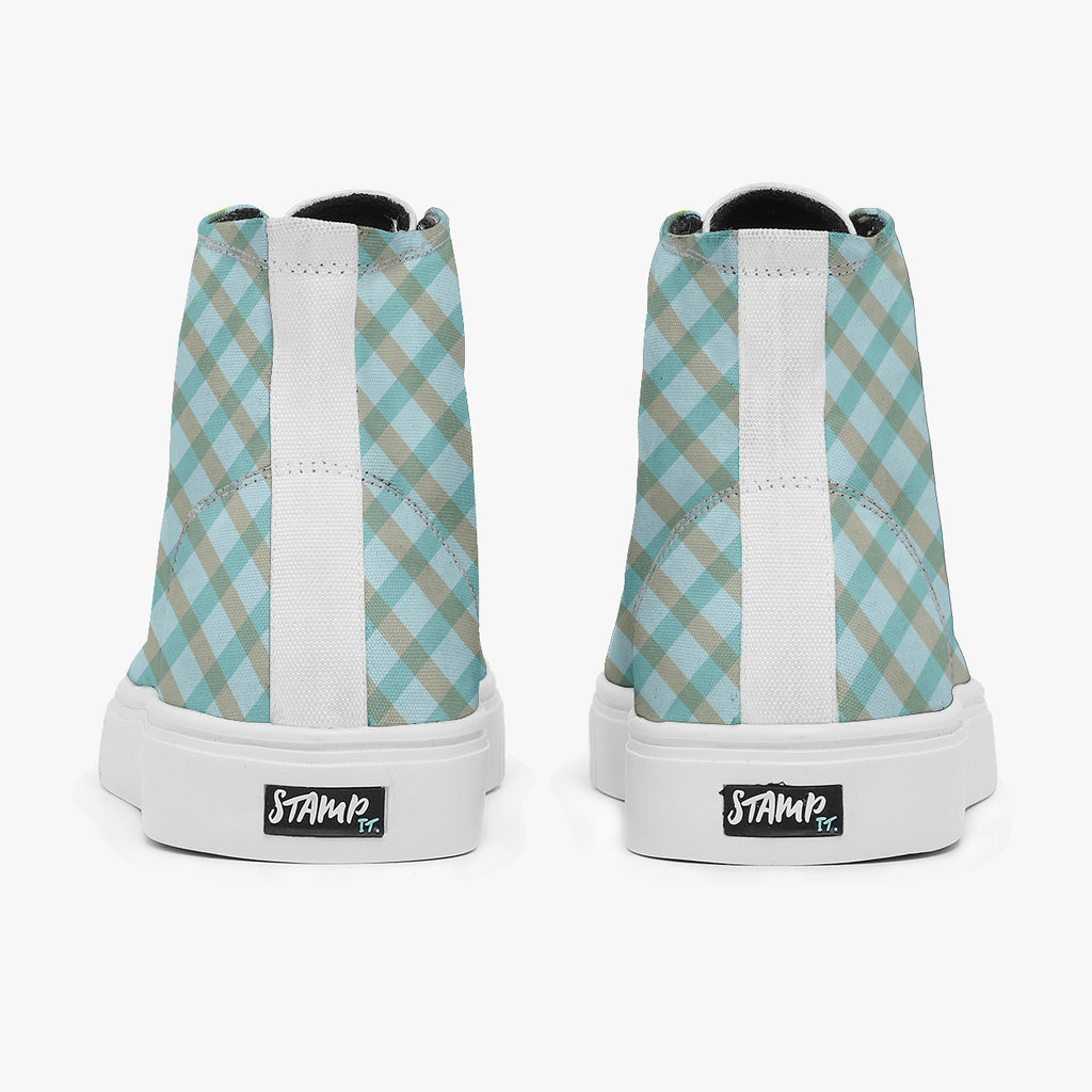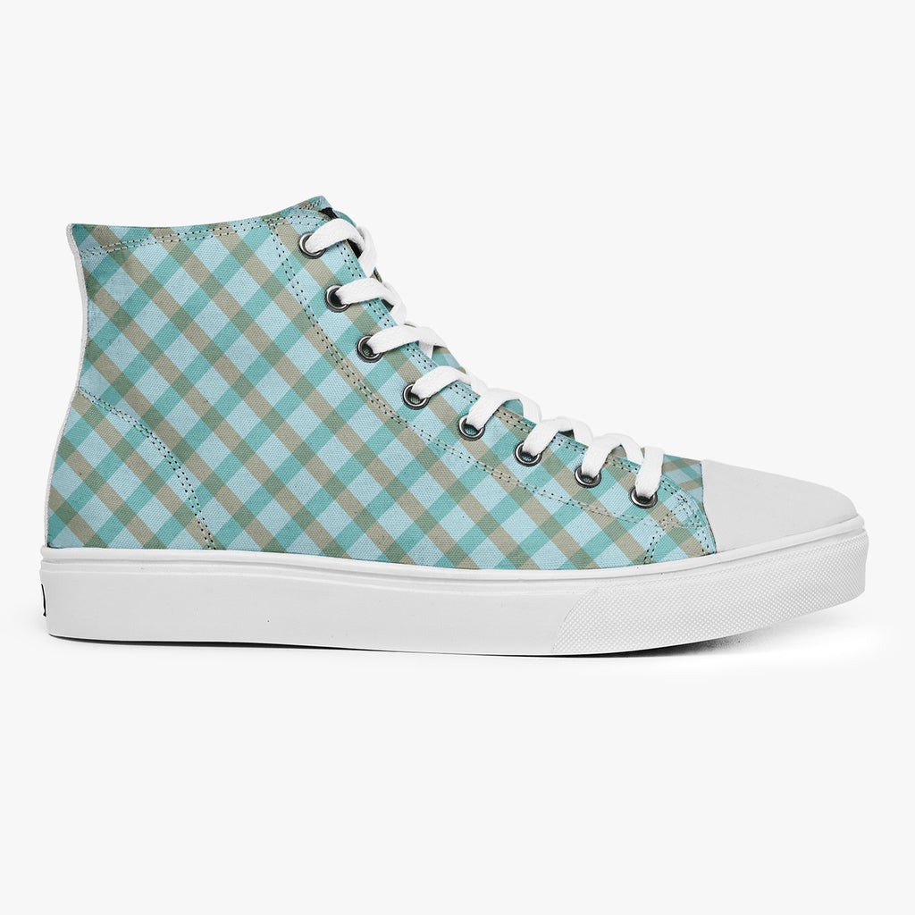 Tênis Cano Alto Azul Bebê Quadriculado Marrom Abstrato, confeccionado em lona, com cores e estampas exclusivas.
