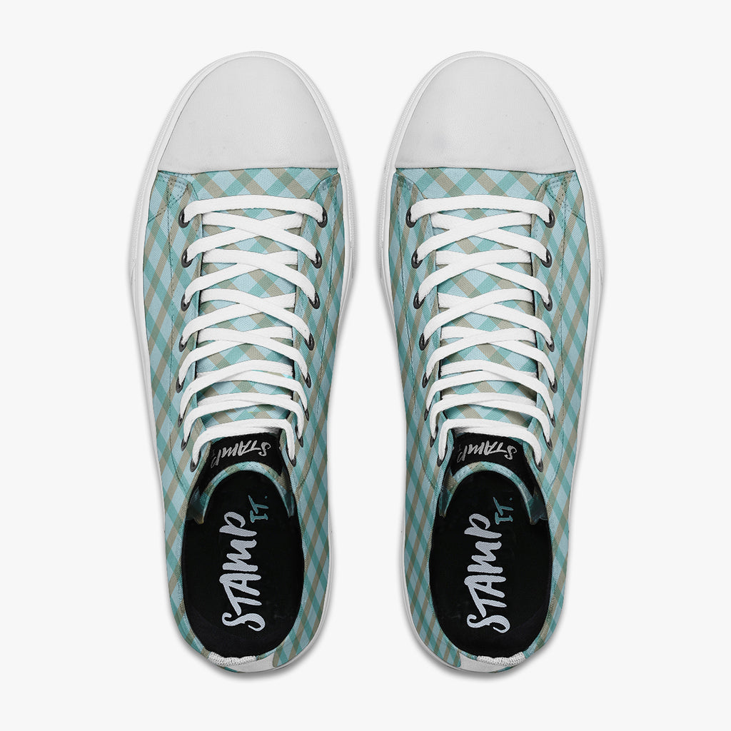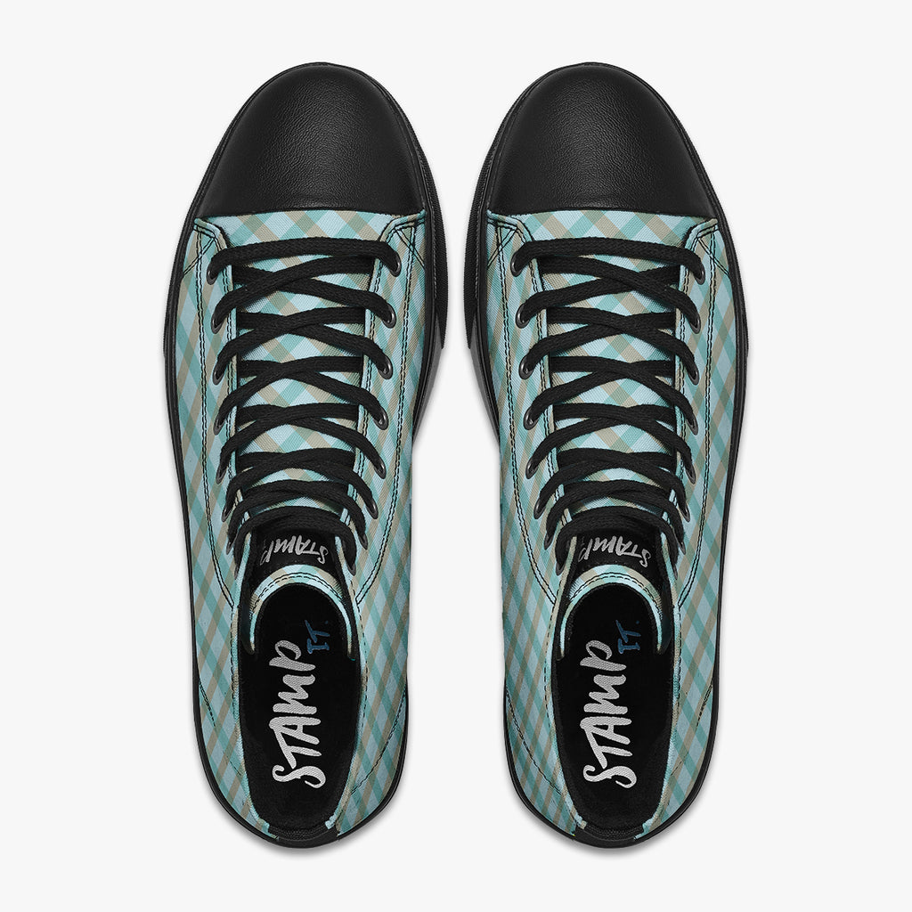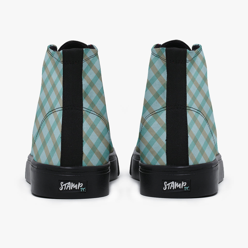 Tênis Cano Alto Azul Bebê Quadriculado Marrom Abstrato, confeccionado em lona, com cores e estampas exclusivas.