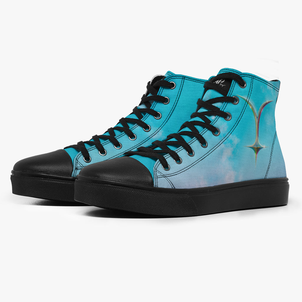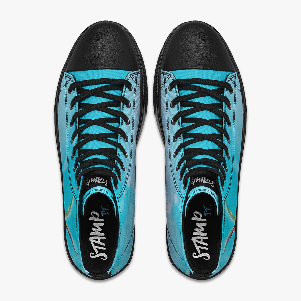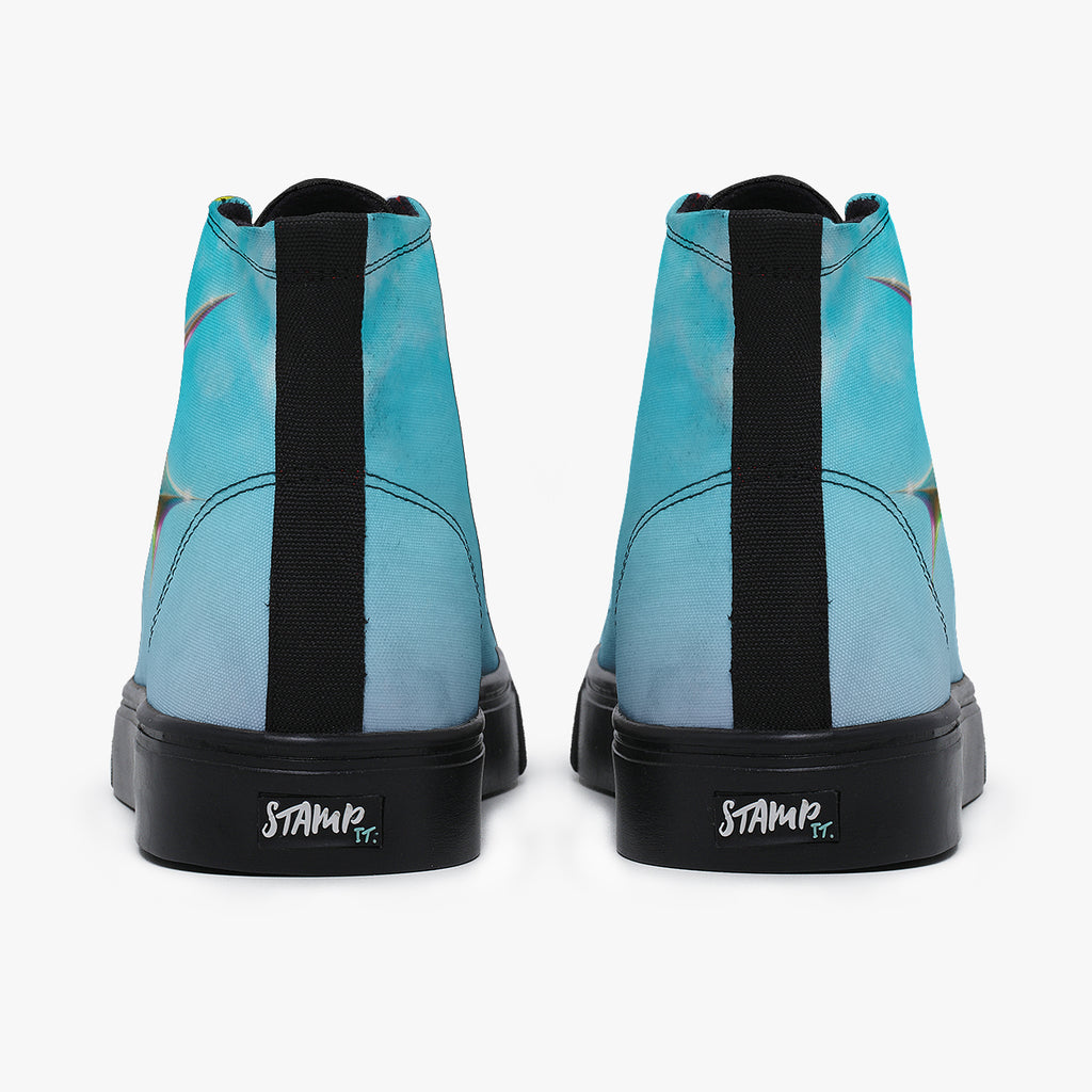 Tênis Cano Alto Azul Montero Lil Nas X Paraíso Cultura, confeccionado em lona, com cores e estampas exclusivas.