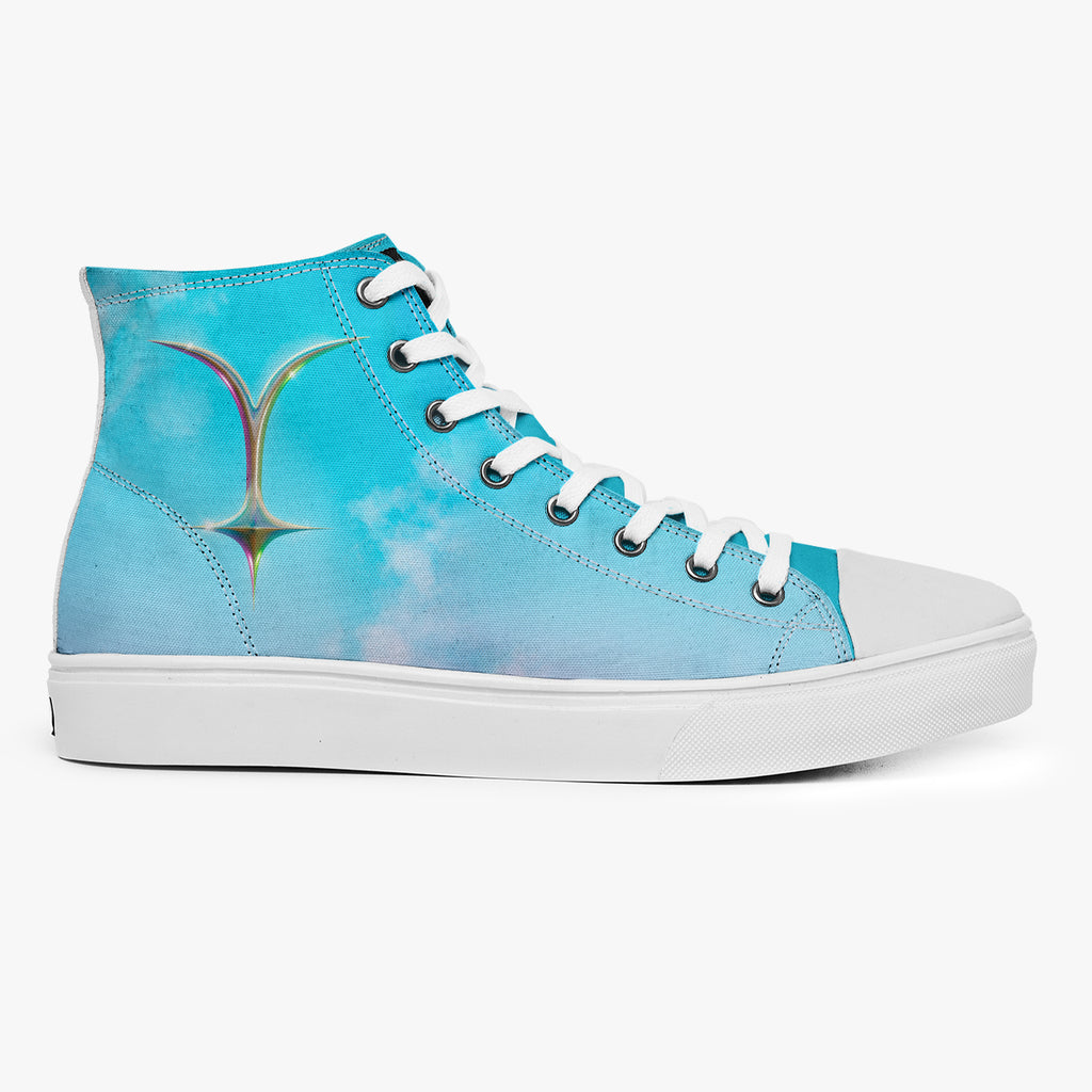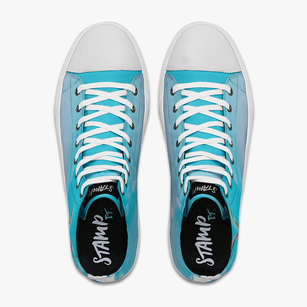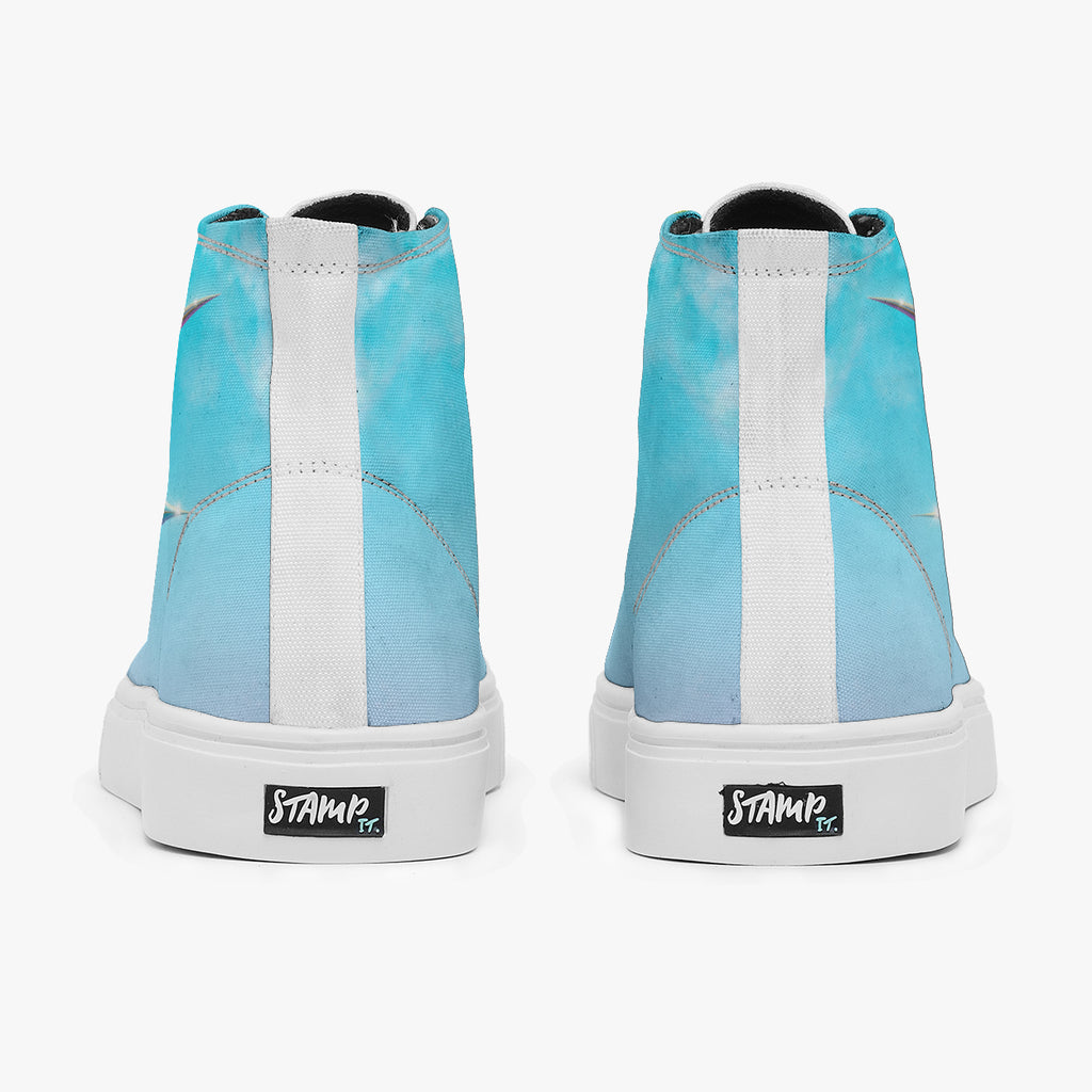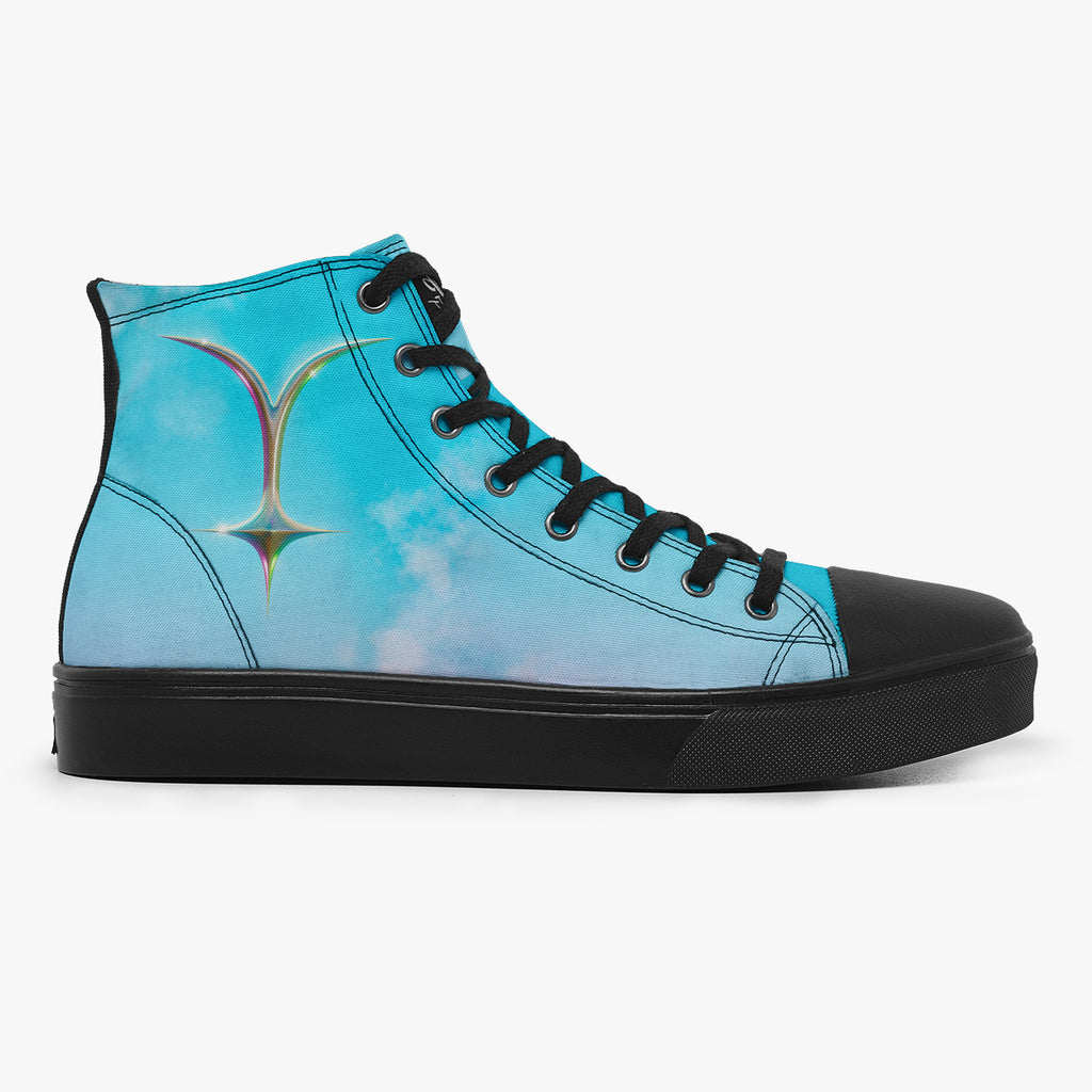 Tênis Cano Alto Azul Montero Lil Nas X Paraíso Cultura, confeccionado em lona, com cores e estampas exclusivas.