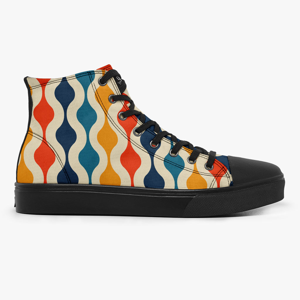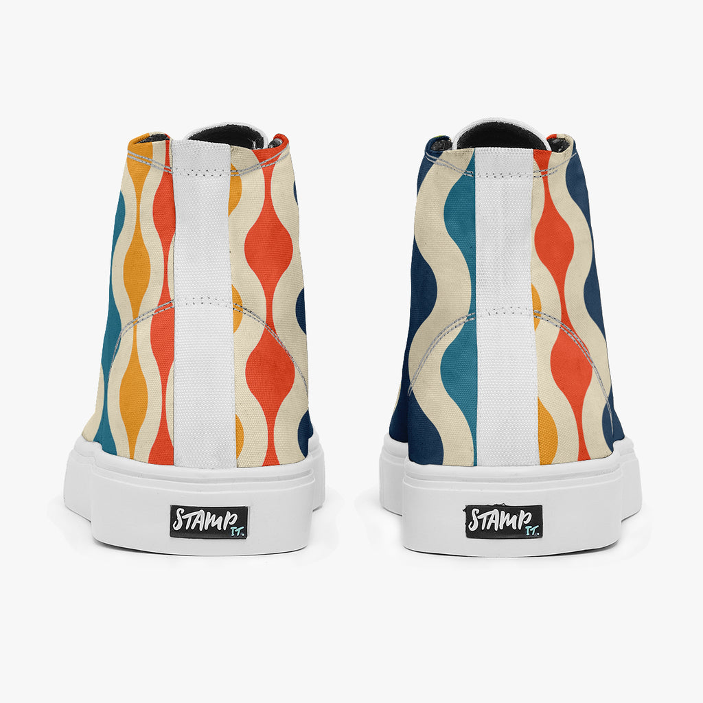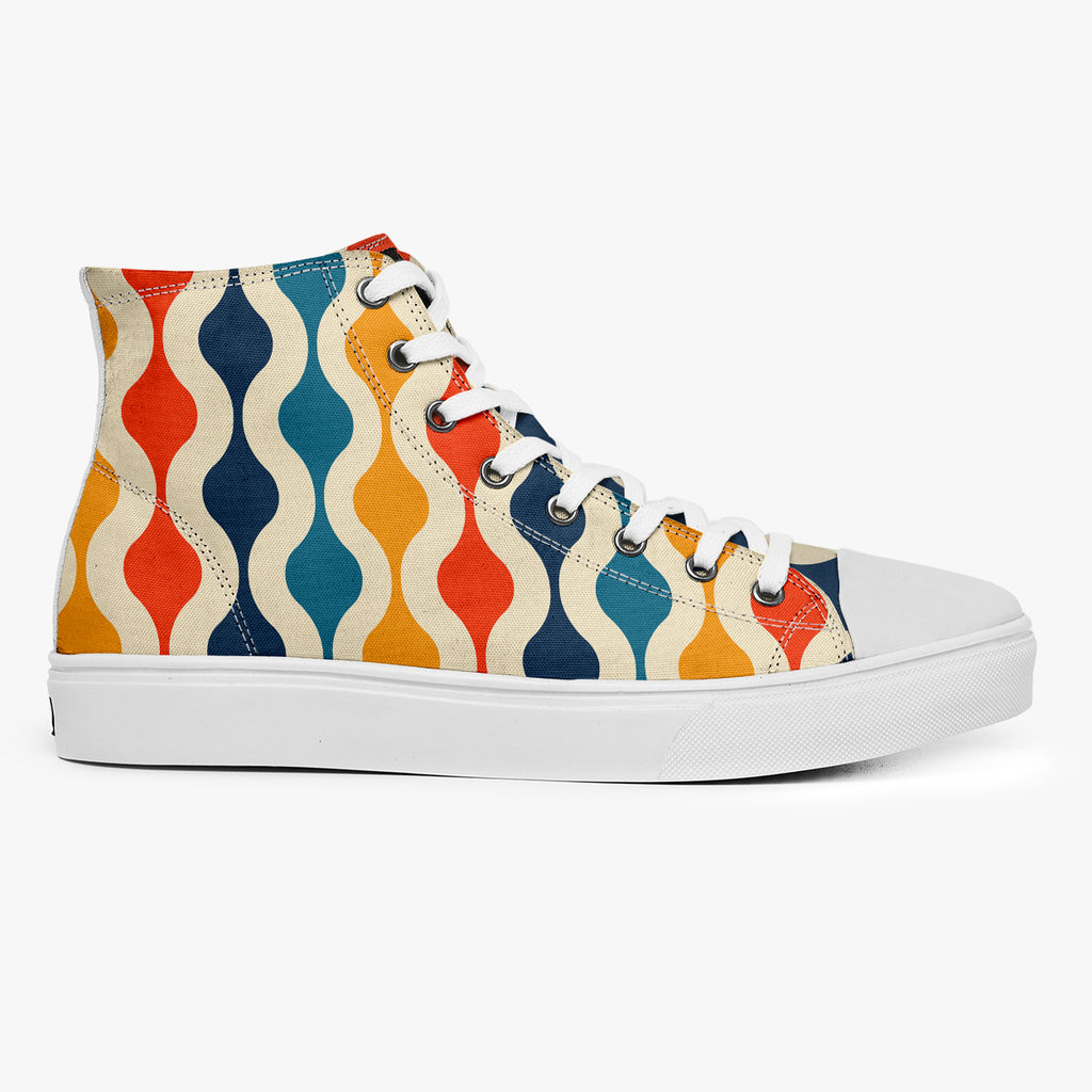 Tênis Cano Alto Bege Ondulados Coloridos Abstrato, confeccionado em lona, com cores e estampas exclusivas.