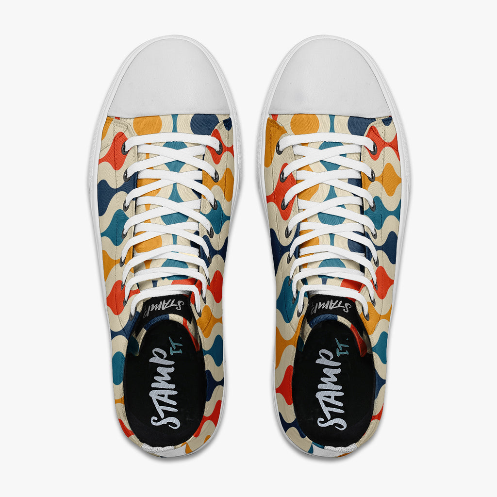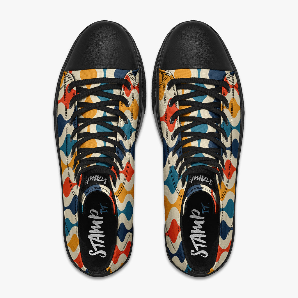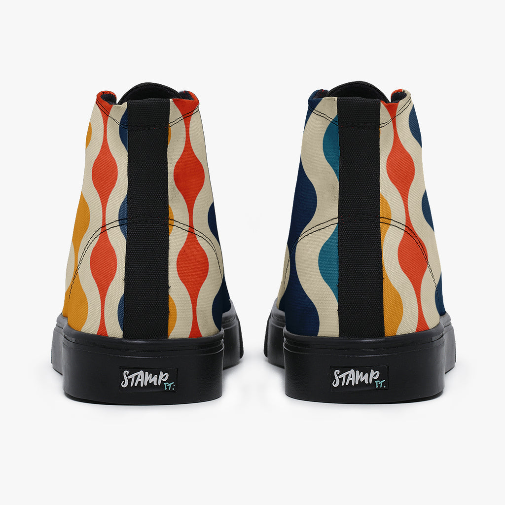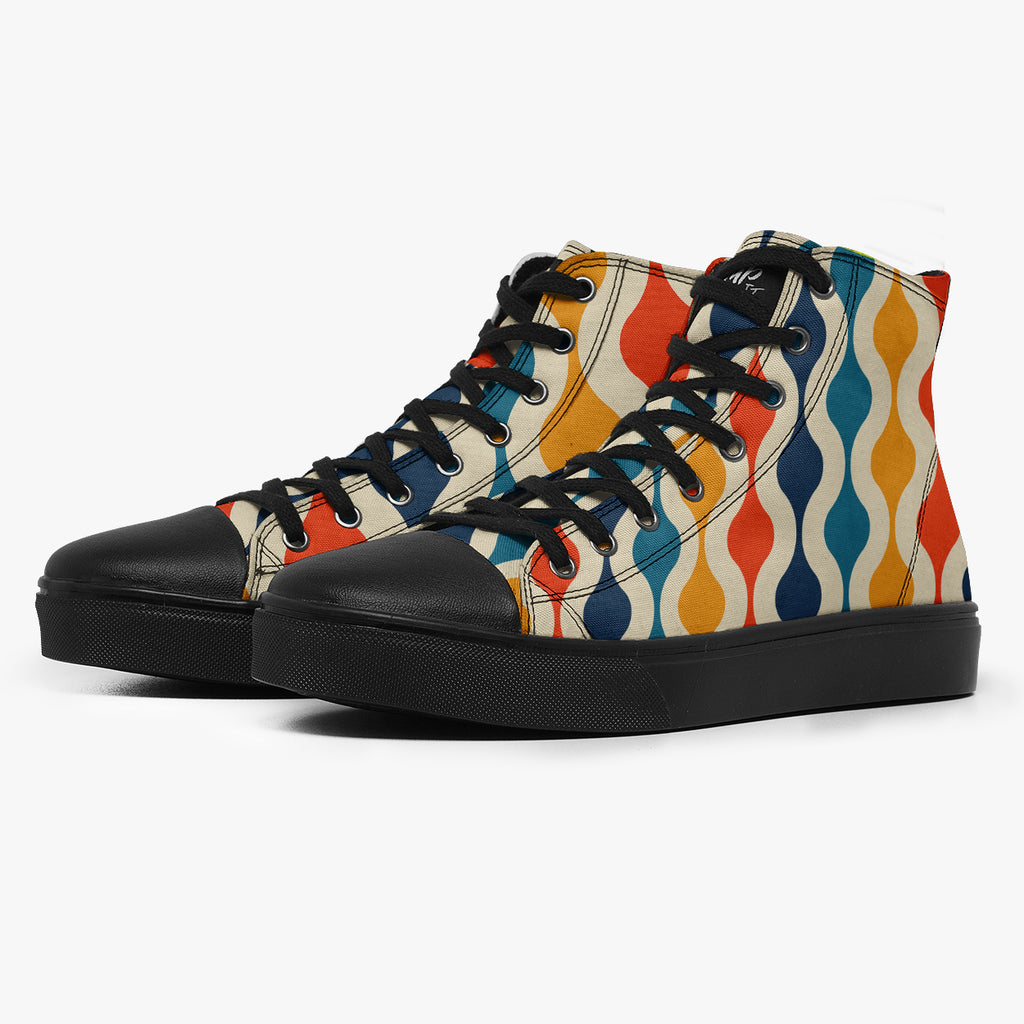 Tênis Cano Alto Bege Ondulados Coloridos Abstrato, confeccionado em lona, com cores e estampas exclusivas.
