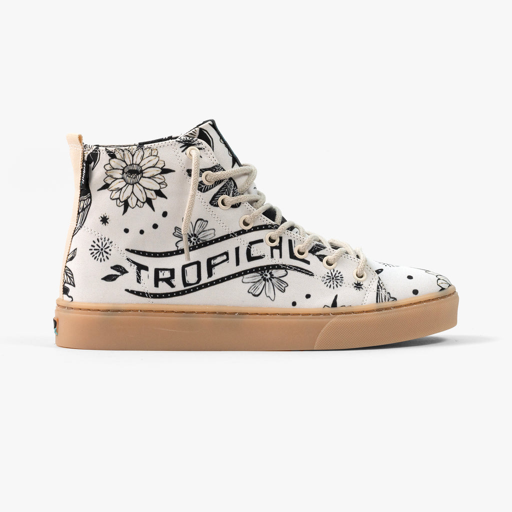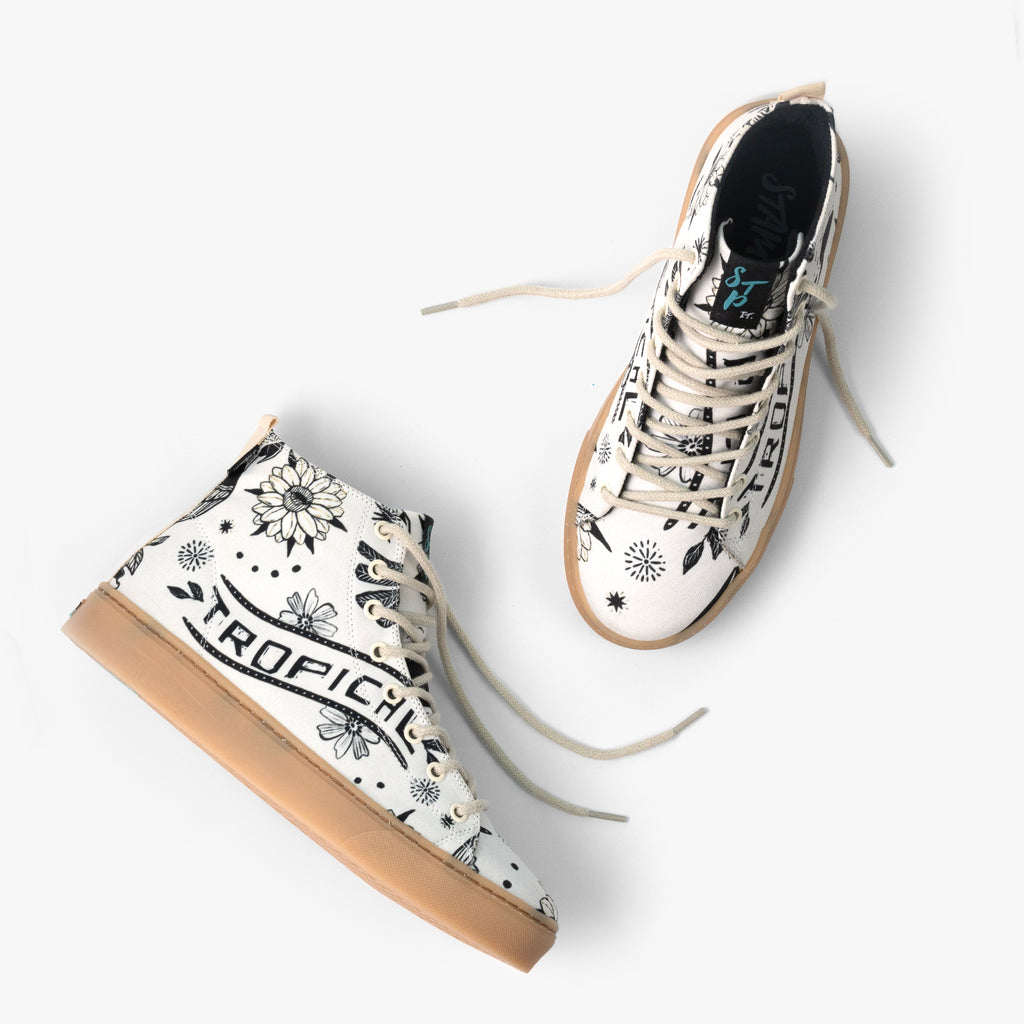 Tênis Cano Alto Boho Branco e Preto Tropical, confeccionado em lona, com cores e estampas exclusivas.