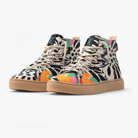 Tênis Cano Alto Boho Preto e Branco Cores Entorno, confeccionado em lona, com cores e estampas exclusivas.