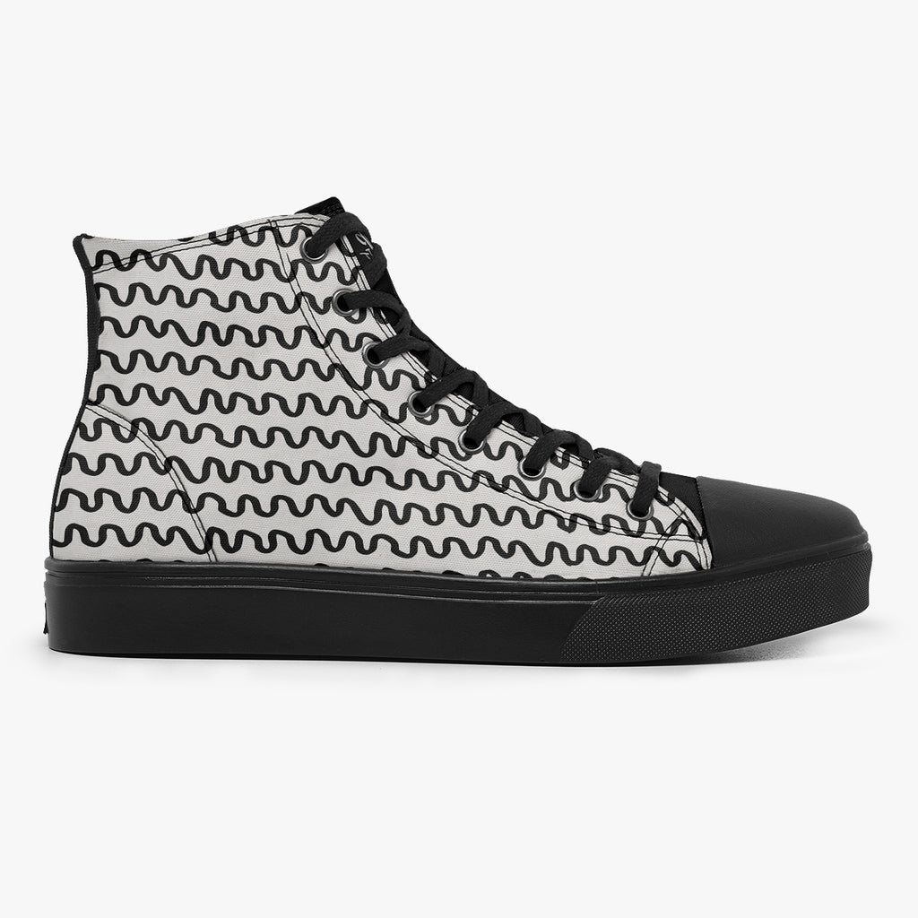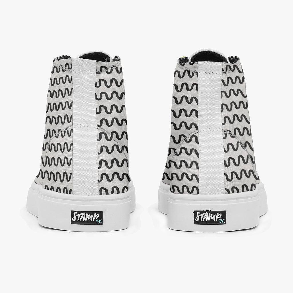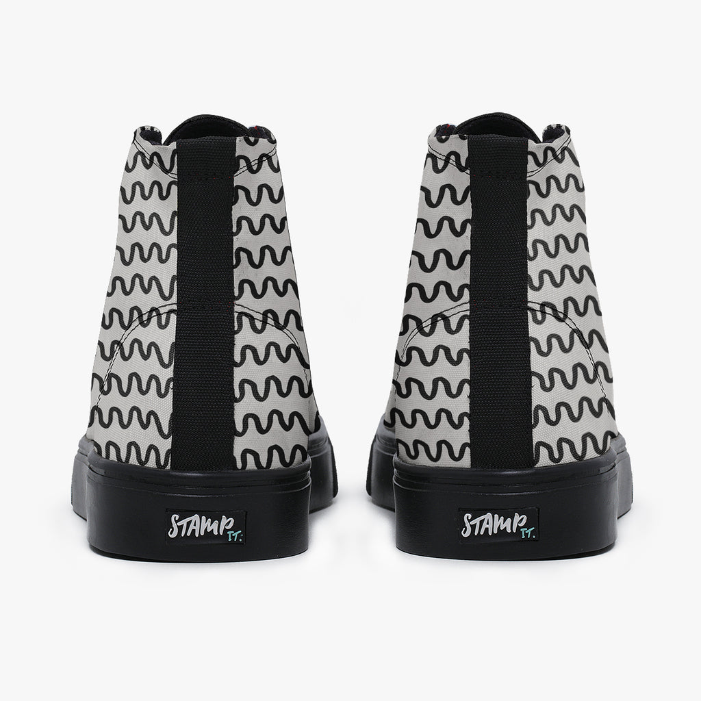 Tênis Cano Alto Branco e Preto Riscos Ondulados Pretos Abstrato