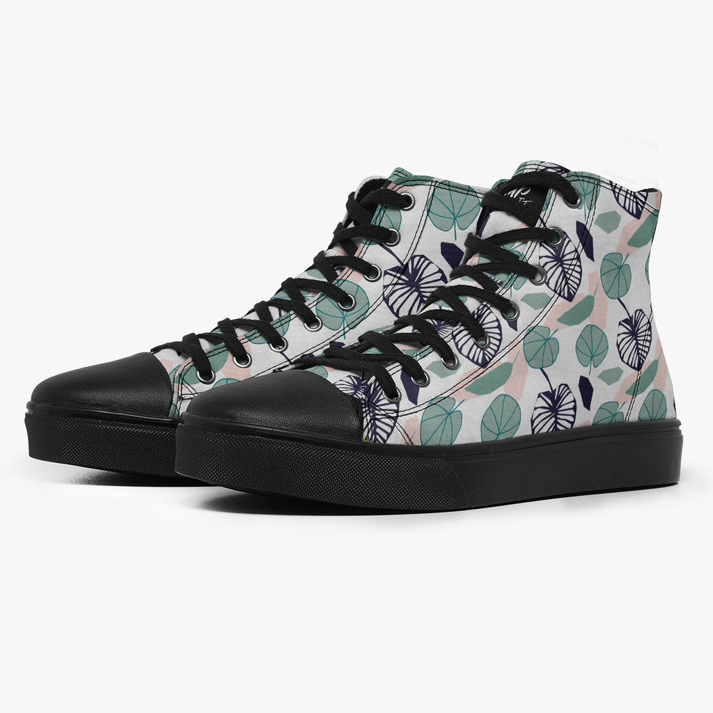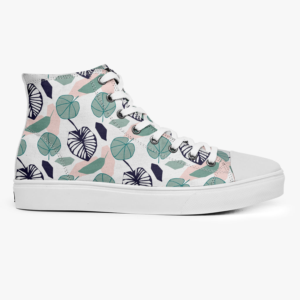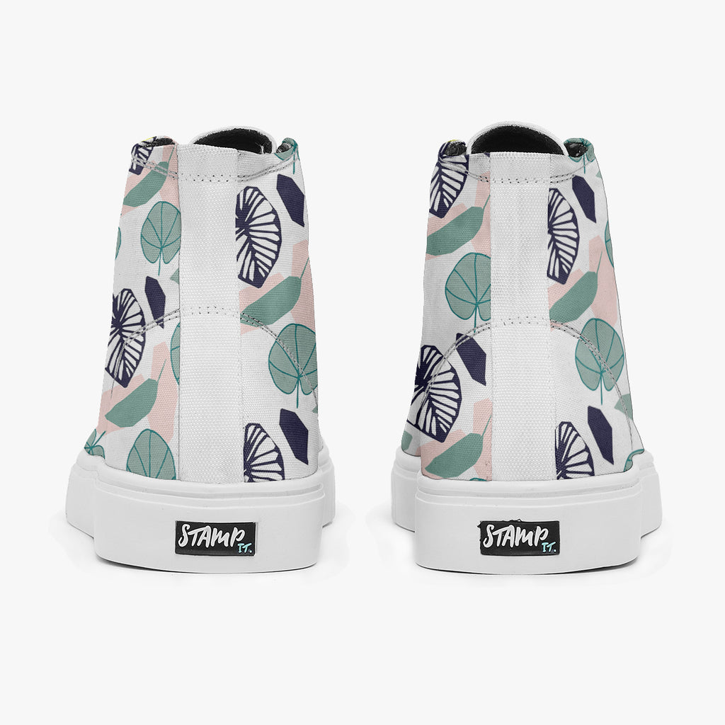 Tênis Cano Alto Branco Folhas Redondas Azuis Flores e Folhas