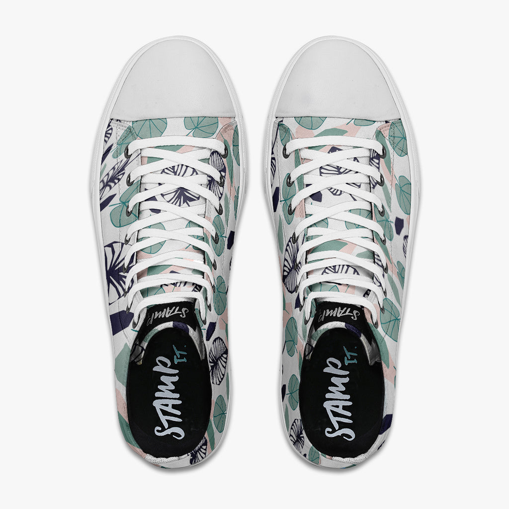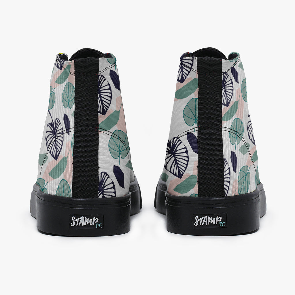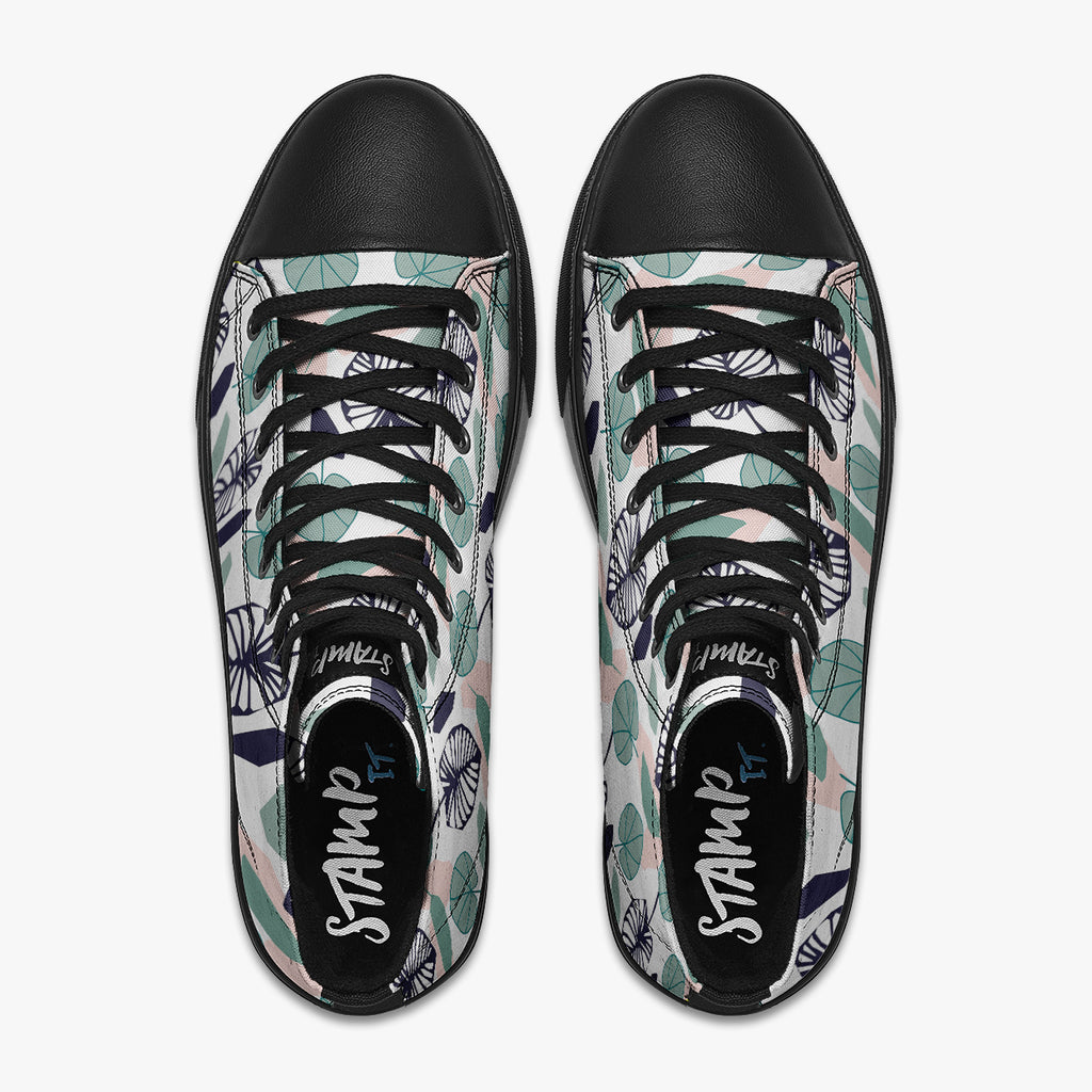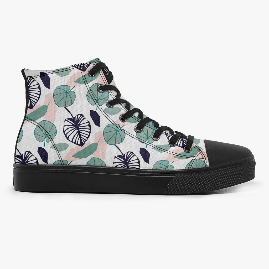 Tênis Cano Alto Branco Folhas Redondas Azuis Flores e Folhas