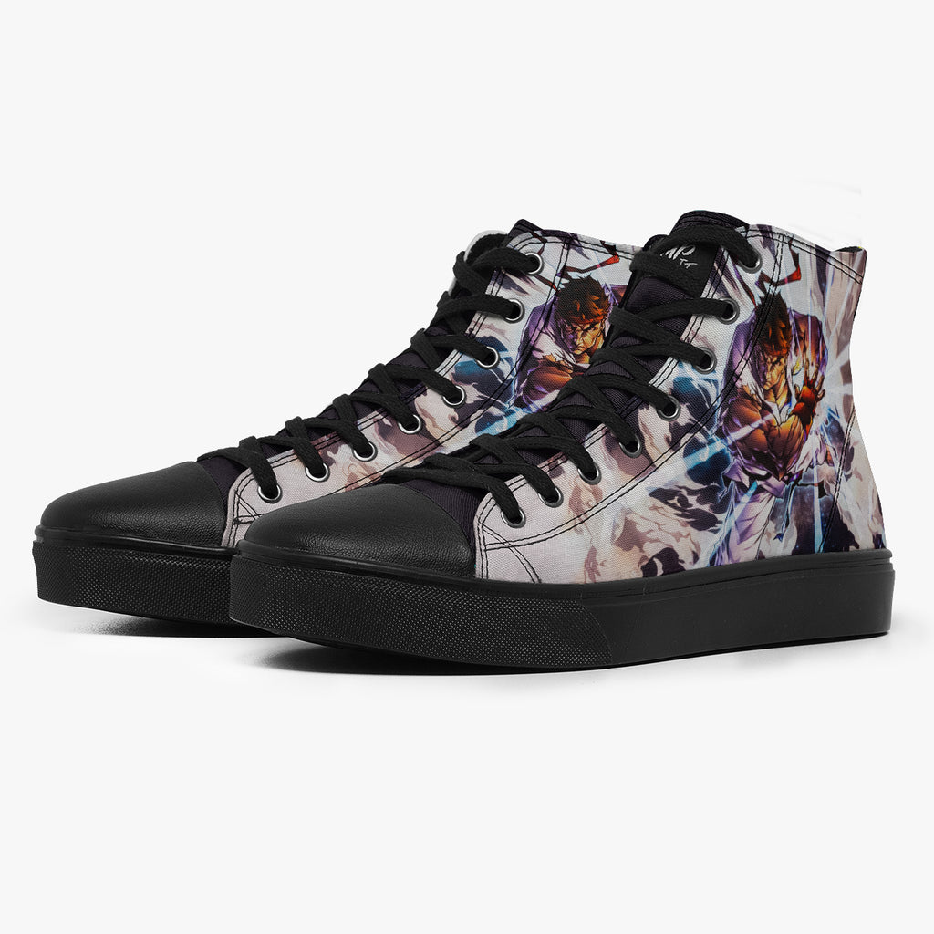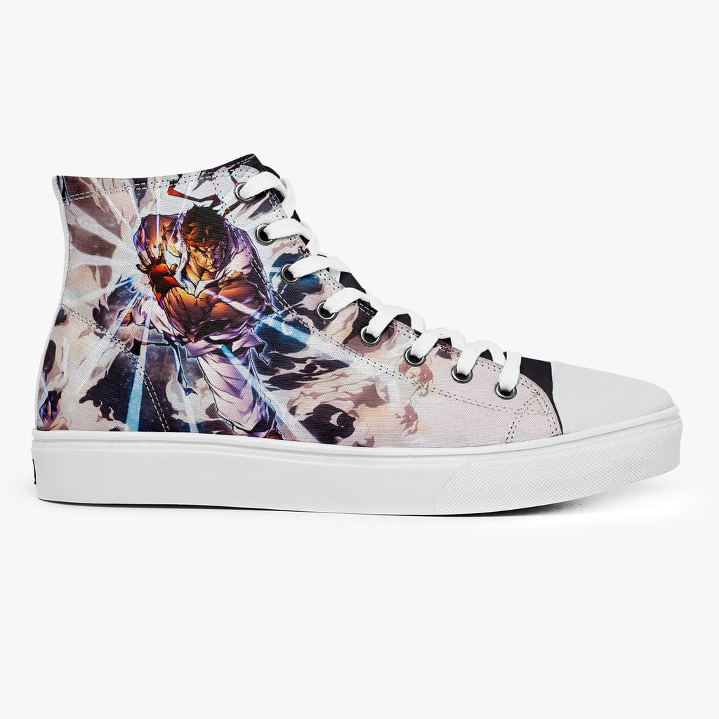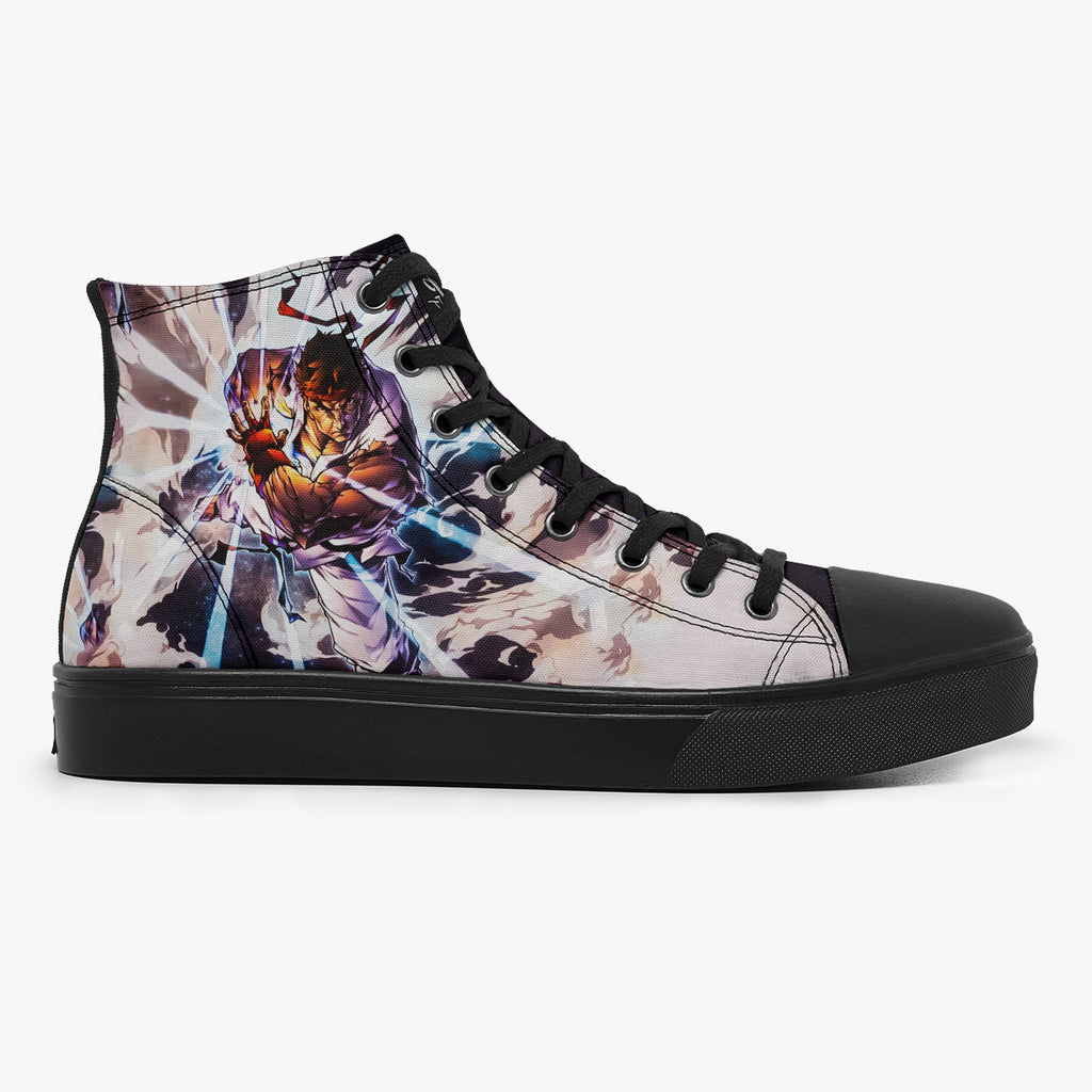 Tênis Cano Alto Colorido Jogos Clássicos Street Fighter Ryu Hadouken! Games, confeccionado em lona, com cores e estampas exclusivas.