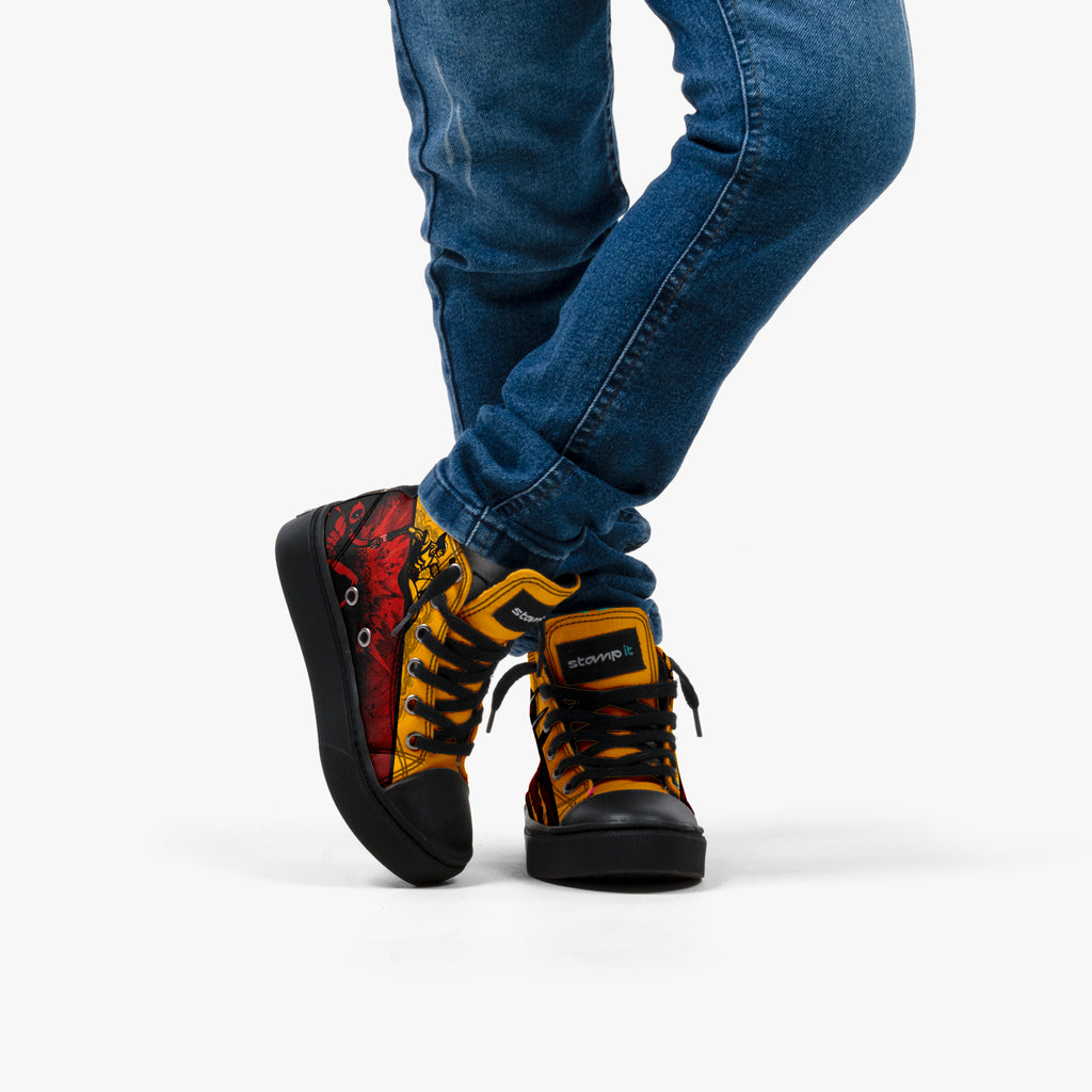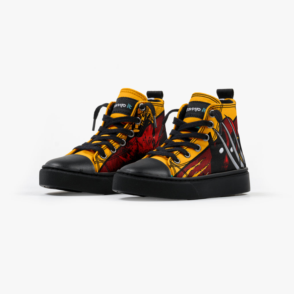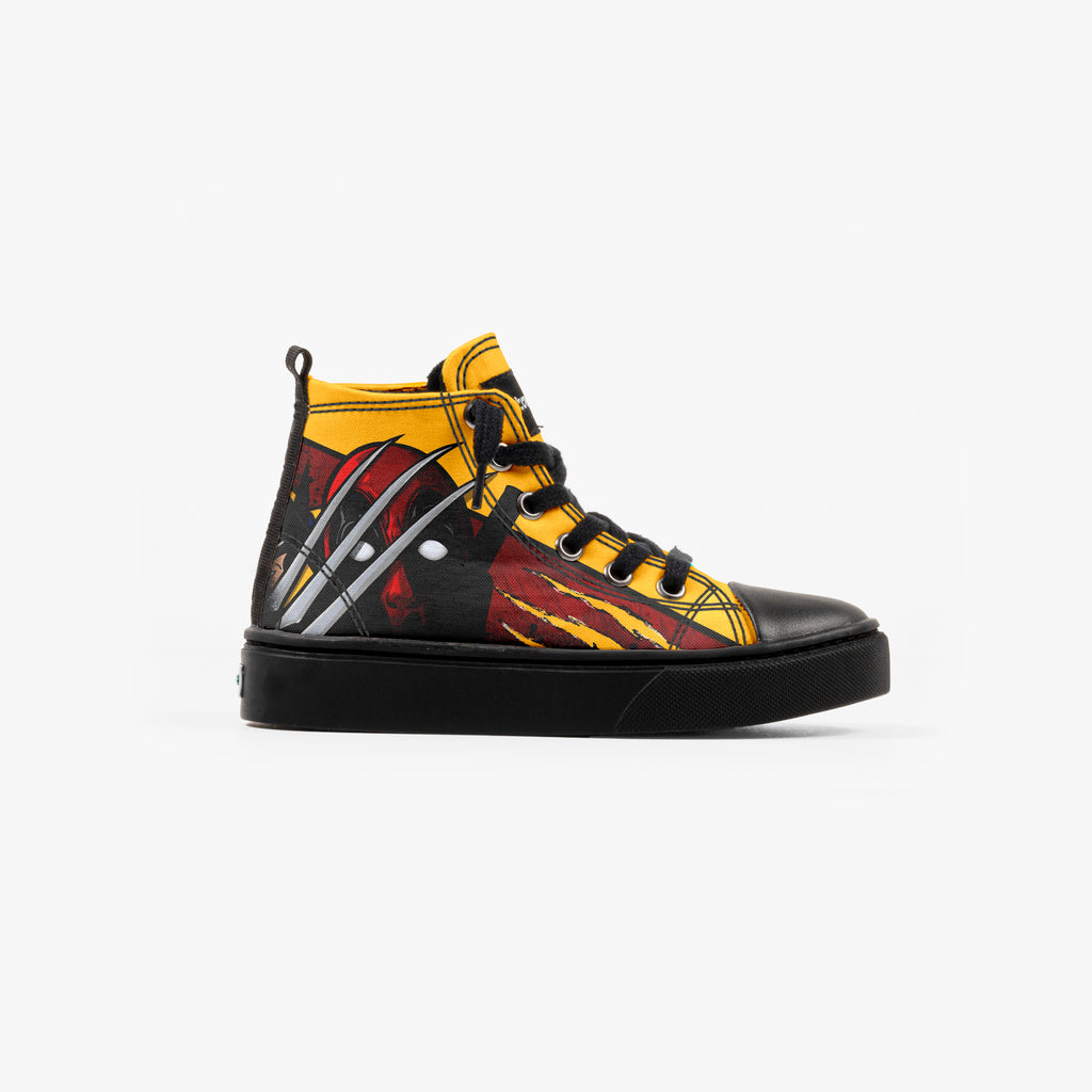Tênis Cano Alto Infantil Amarelo e Vermelho Deadpool e Wolverine Zamb Fanart, confeccionado em lona, com cores e estampas exclusivas.