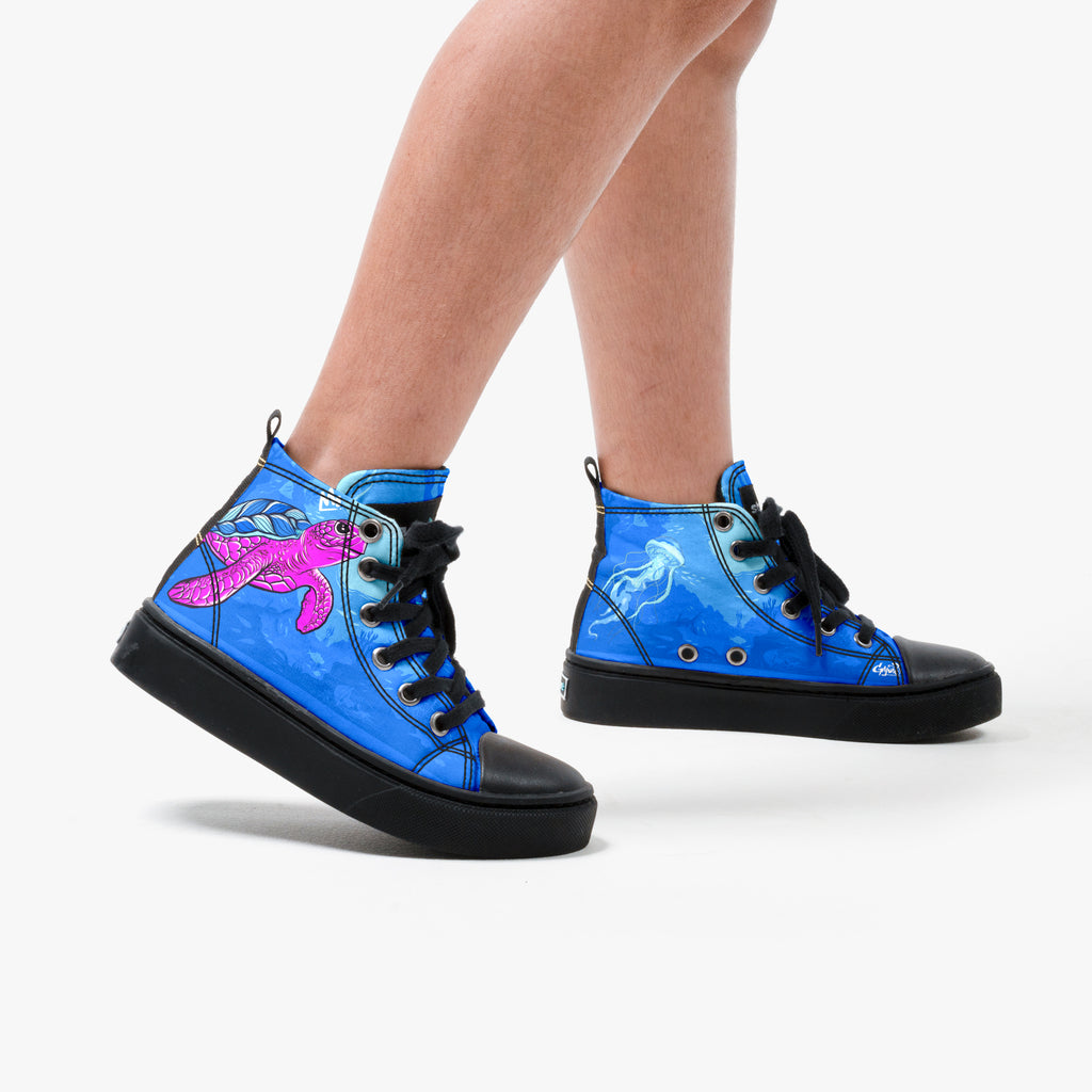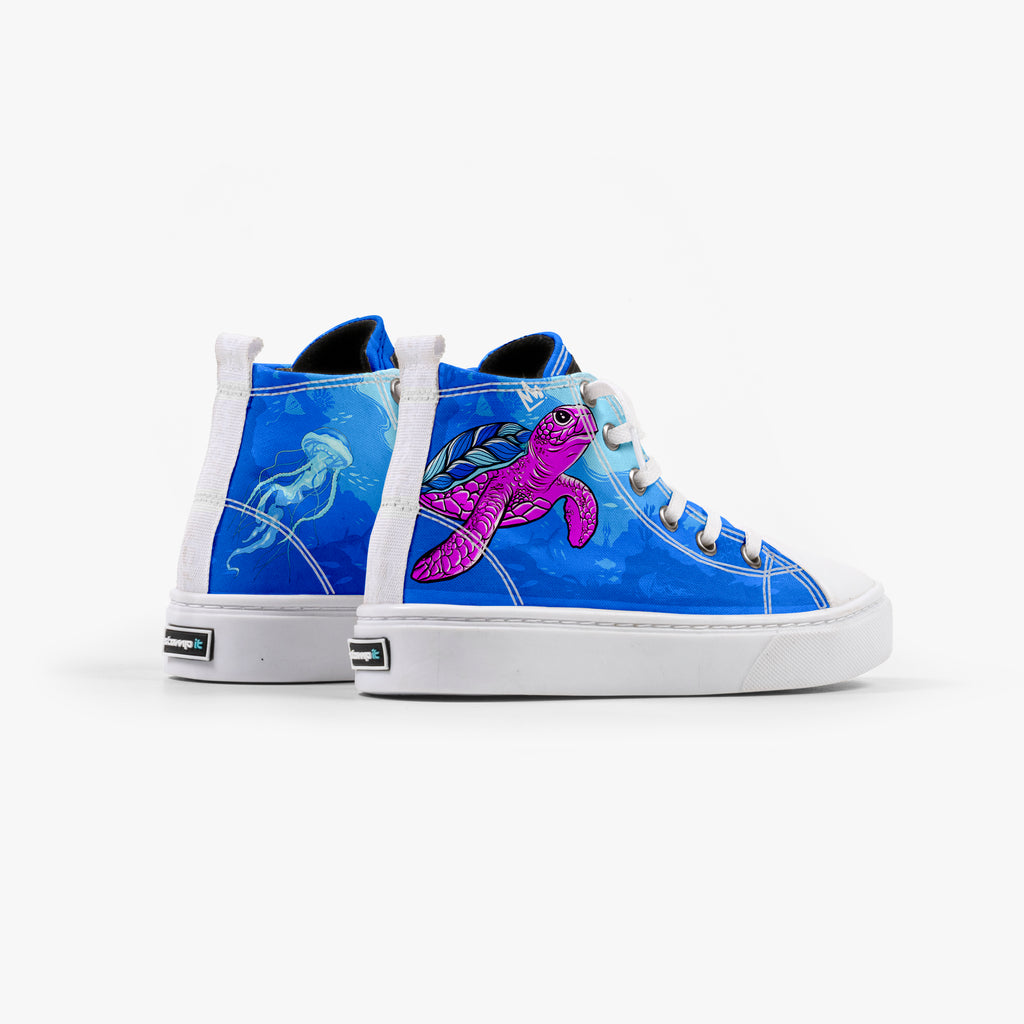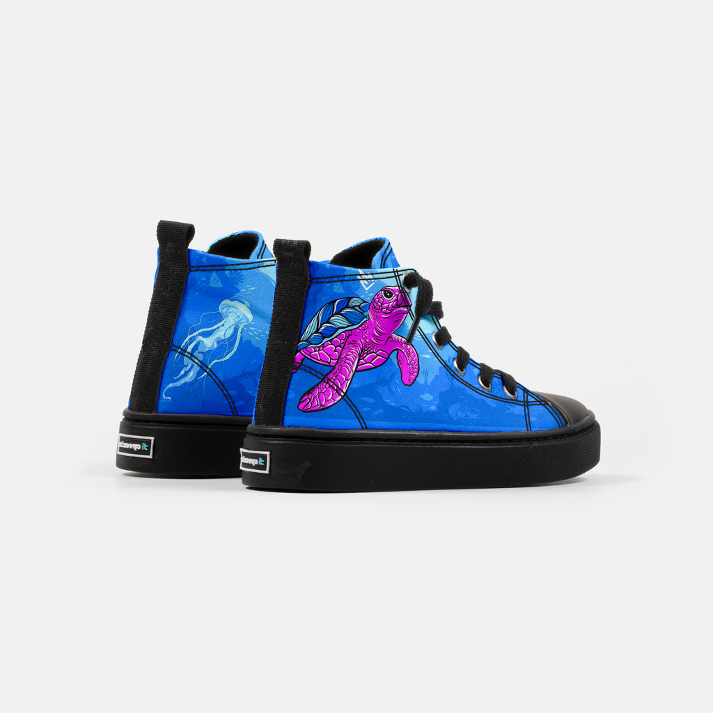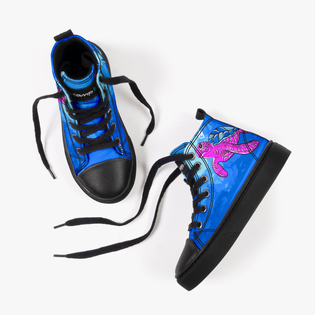 Tênis Cano Alto Infantil Azul Tartaruga Graffiti By Galvão , confeccionado em lona, com cores e estampas exclusivas.