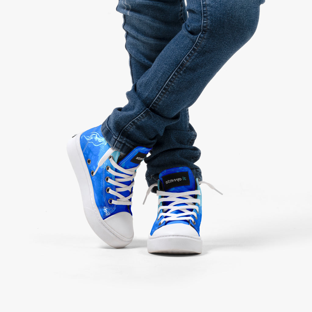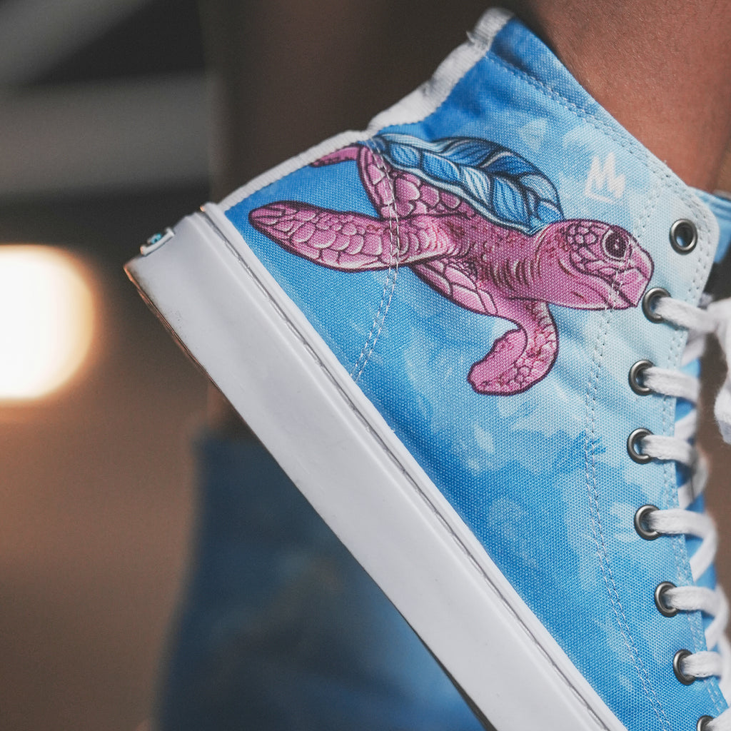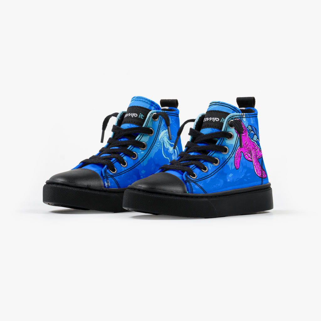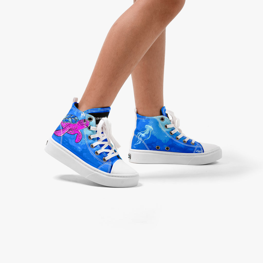 Tênis Cano Alto Infantil Azul Tartaruga Graffiti By Galvão , confeccionado em lona, com cores e estampas exclusivas.