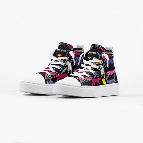 Tênis Cano Alto Infantil cheetah, confeccionado em lona, com cores e estampas exclusivas.