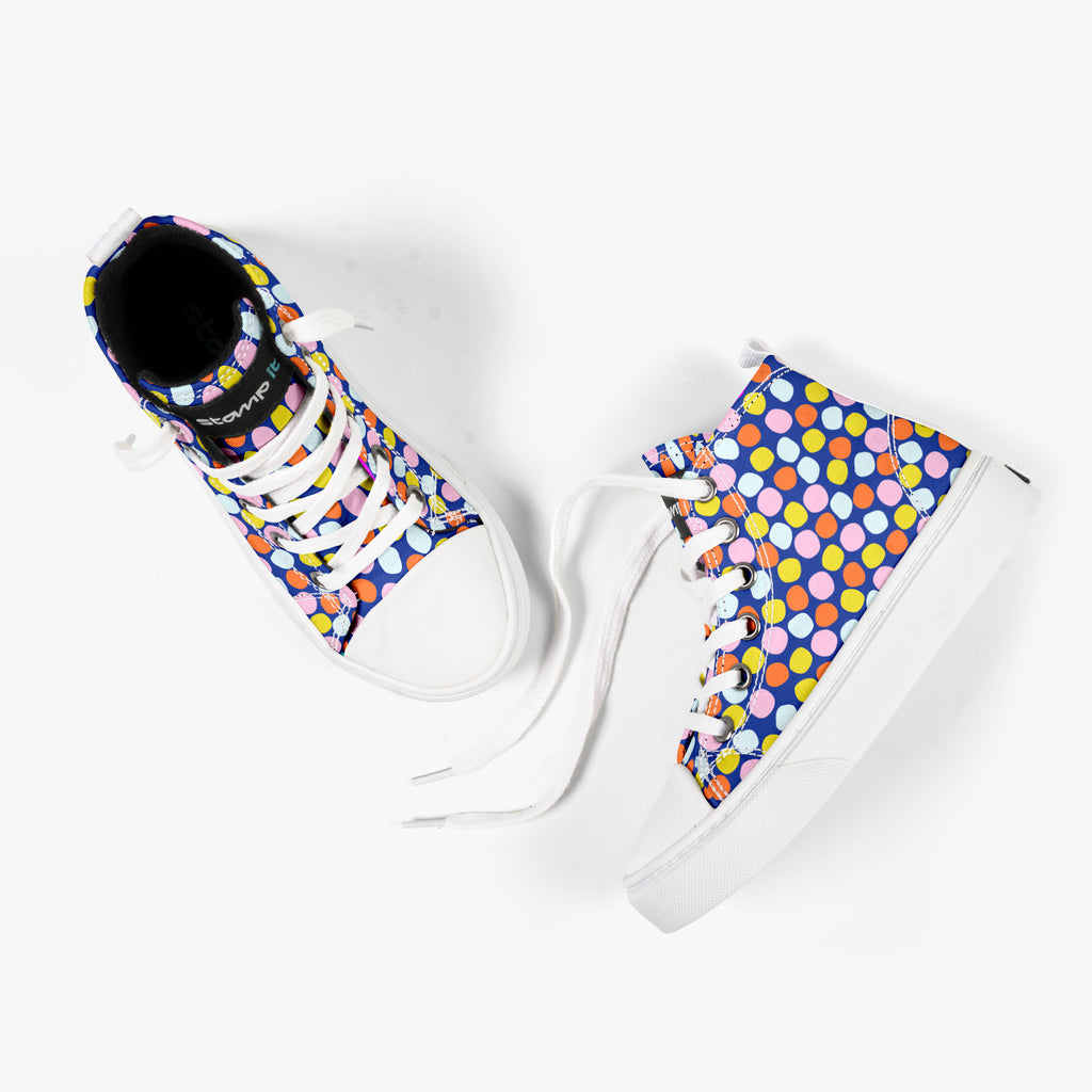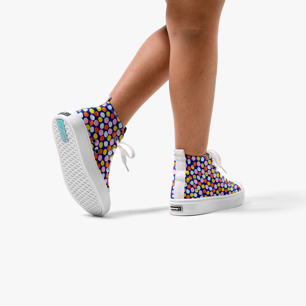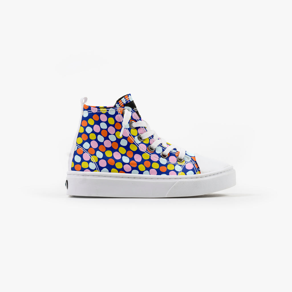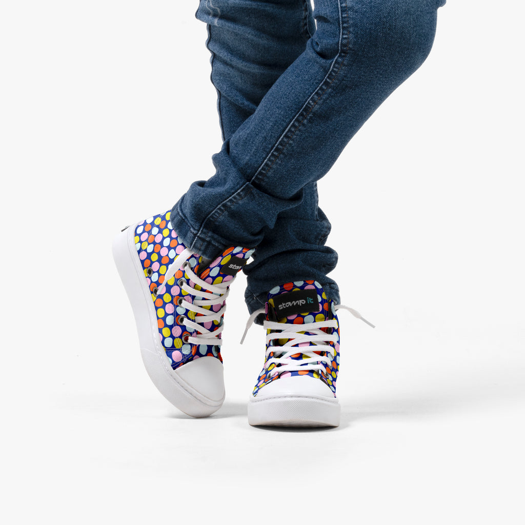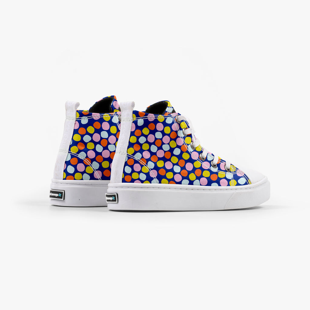 Tênis Cano Alto Infantil Colorful Polka Dots, confeccionado em lona, com cores e estampas exclusivas.