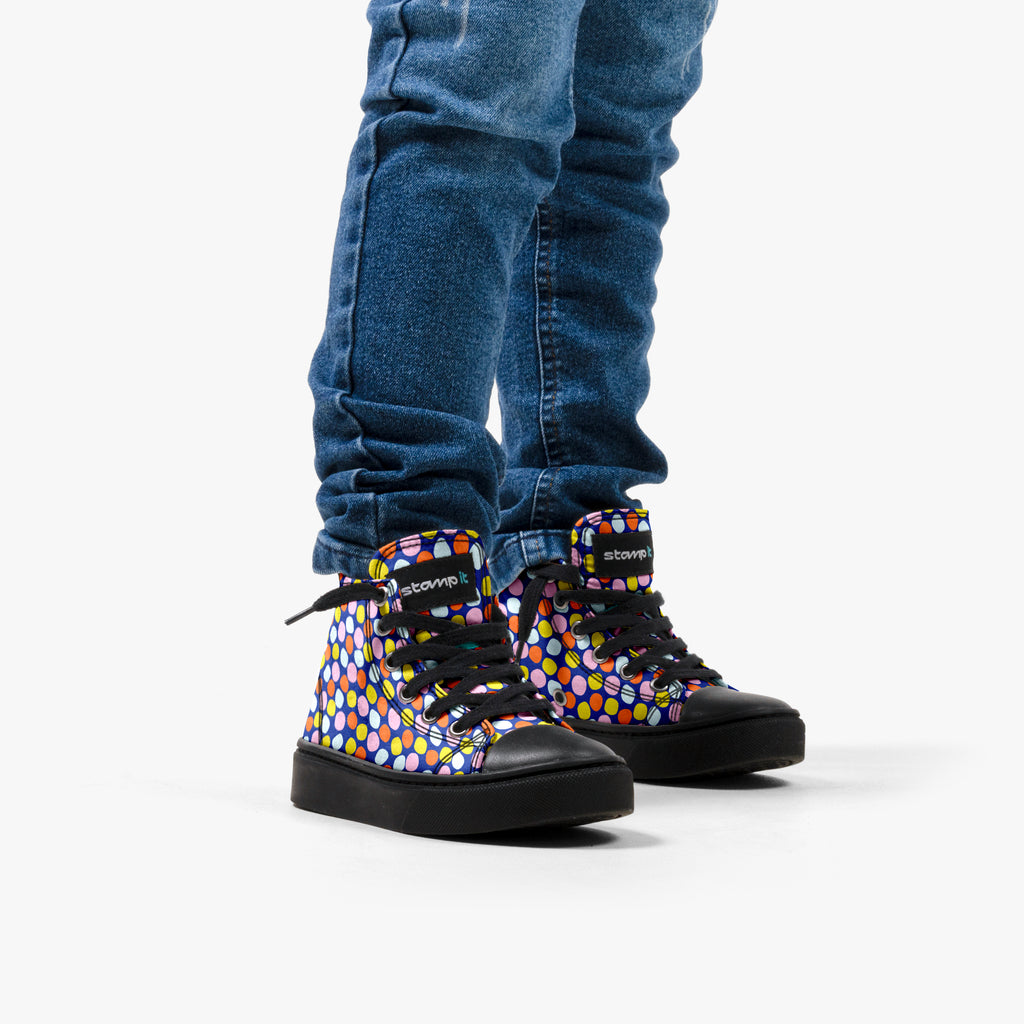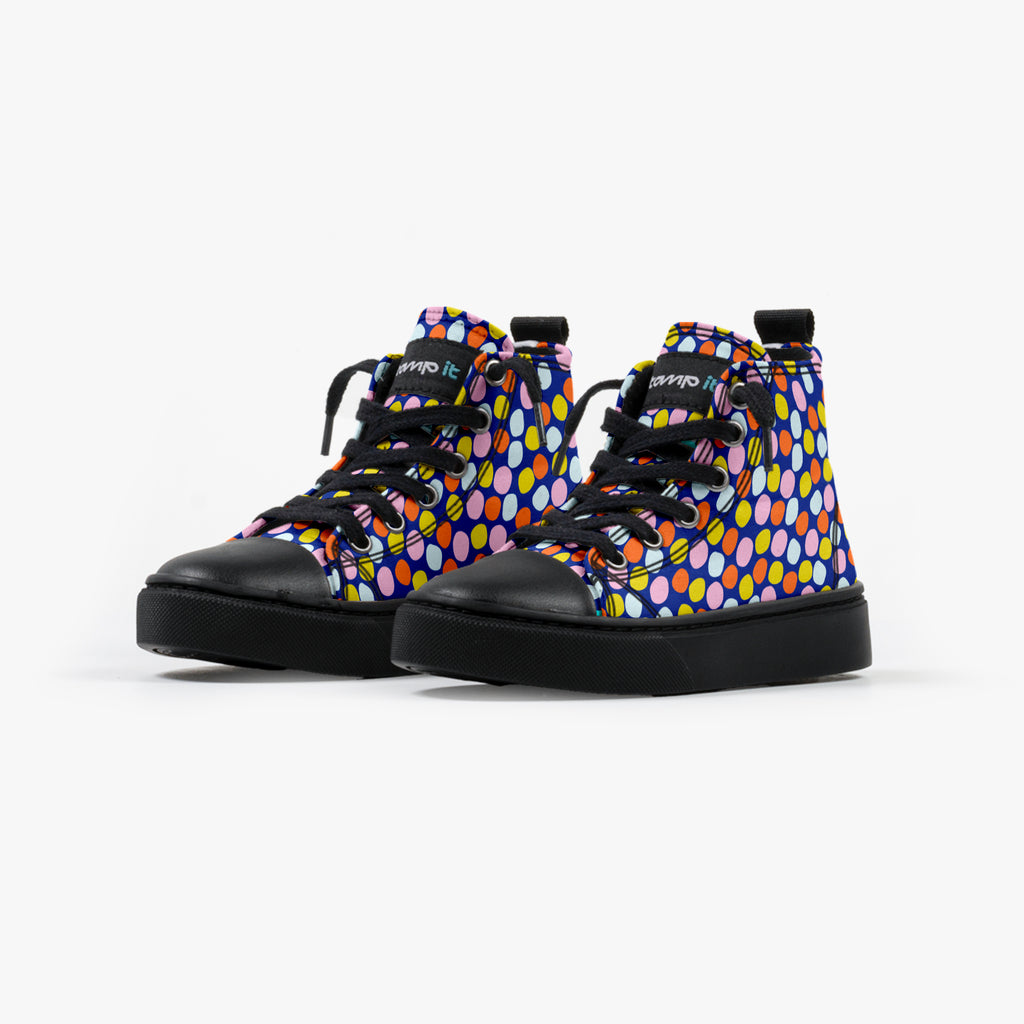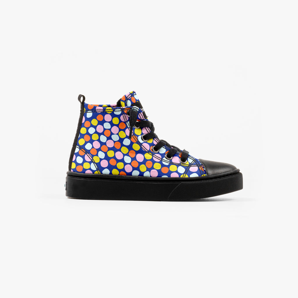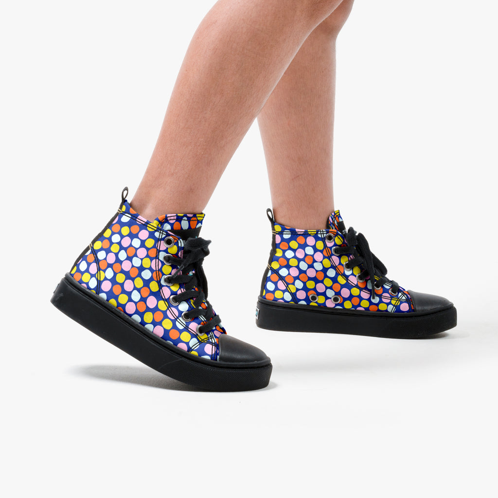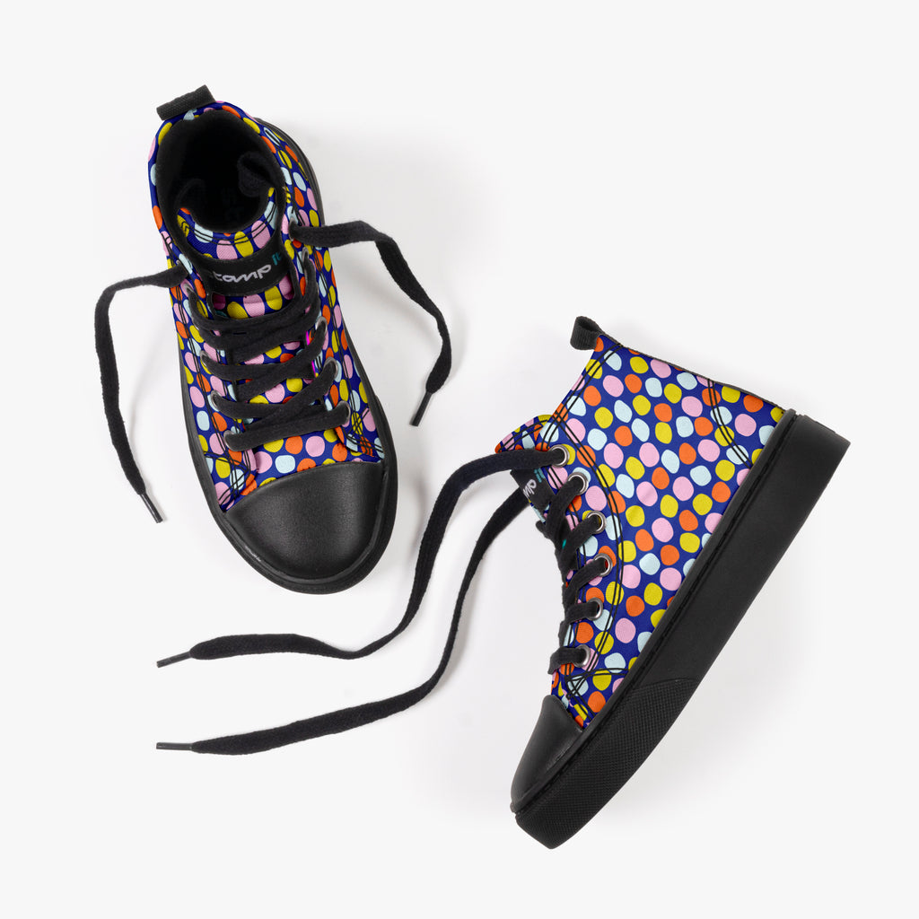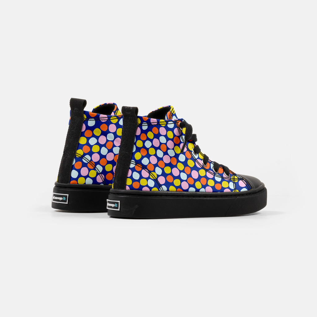 Tênis Cano Alto Infantil Colorful Polka Dots, confeccionado em lona, com cores e estampas exclusivas.