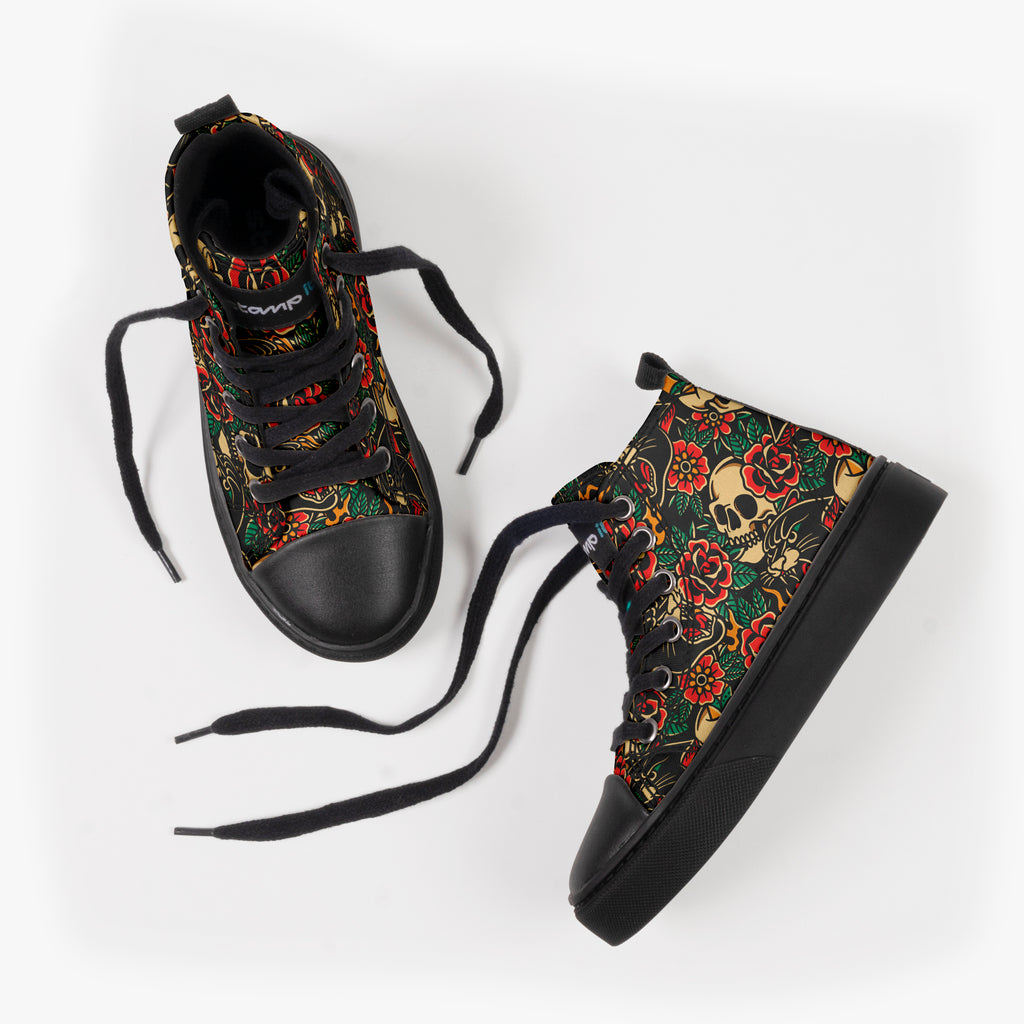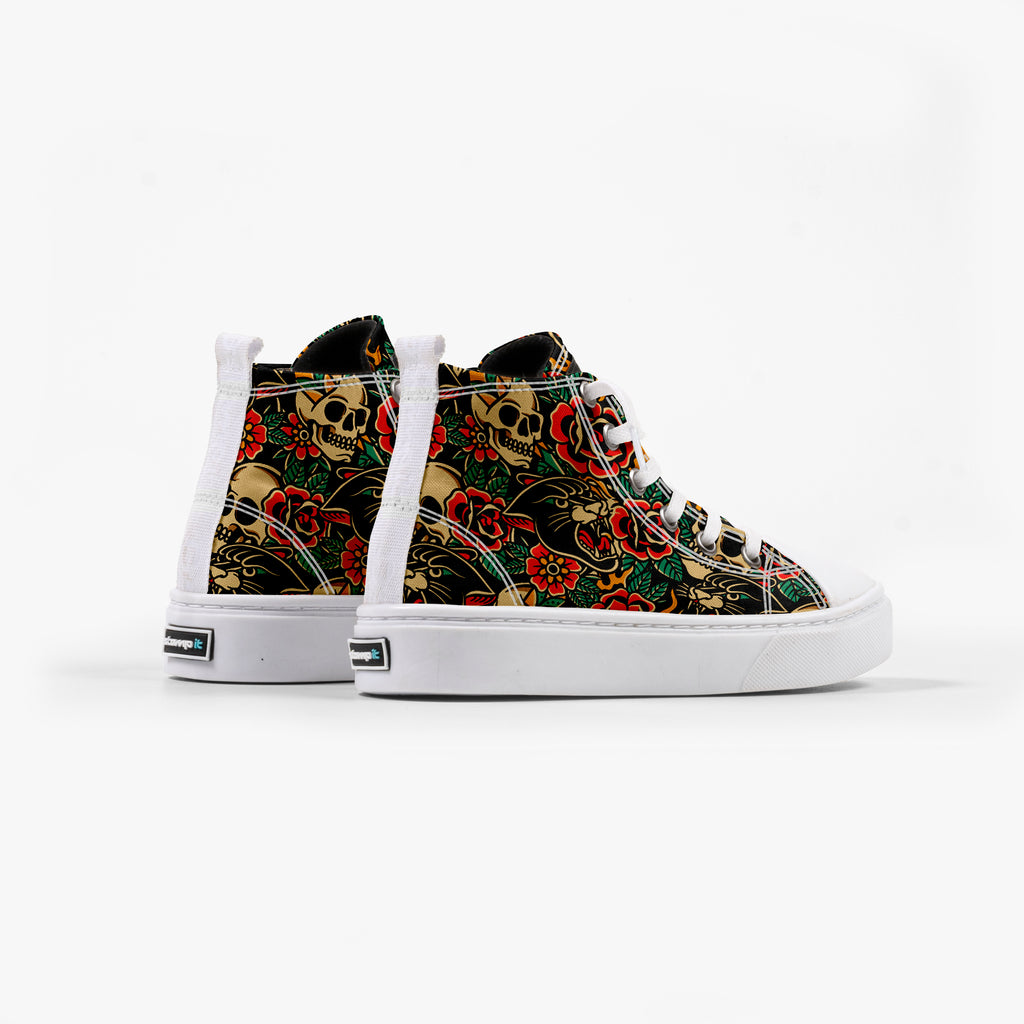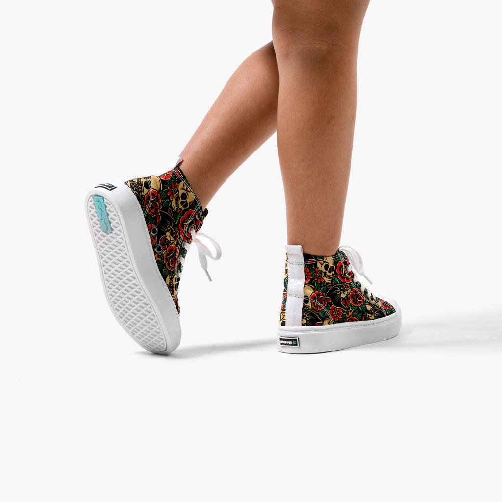 Tênis Cano Alto Infantil Old School, confeccionado em lona, com cores e estampas exclusivas.